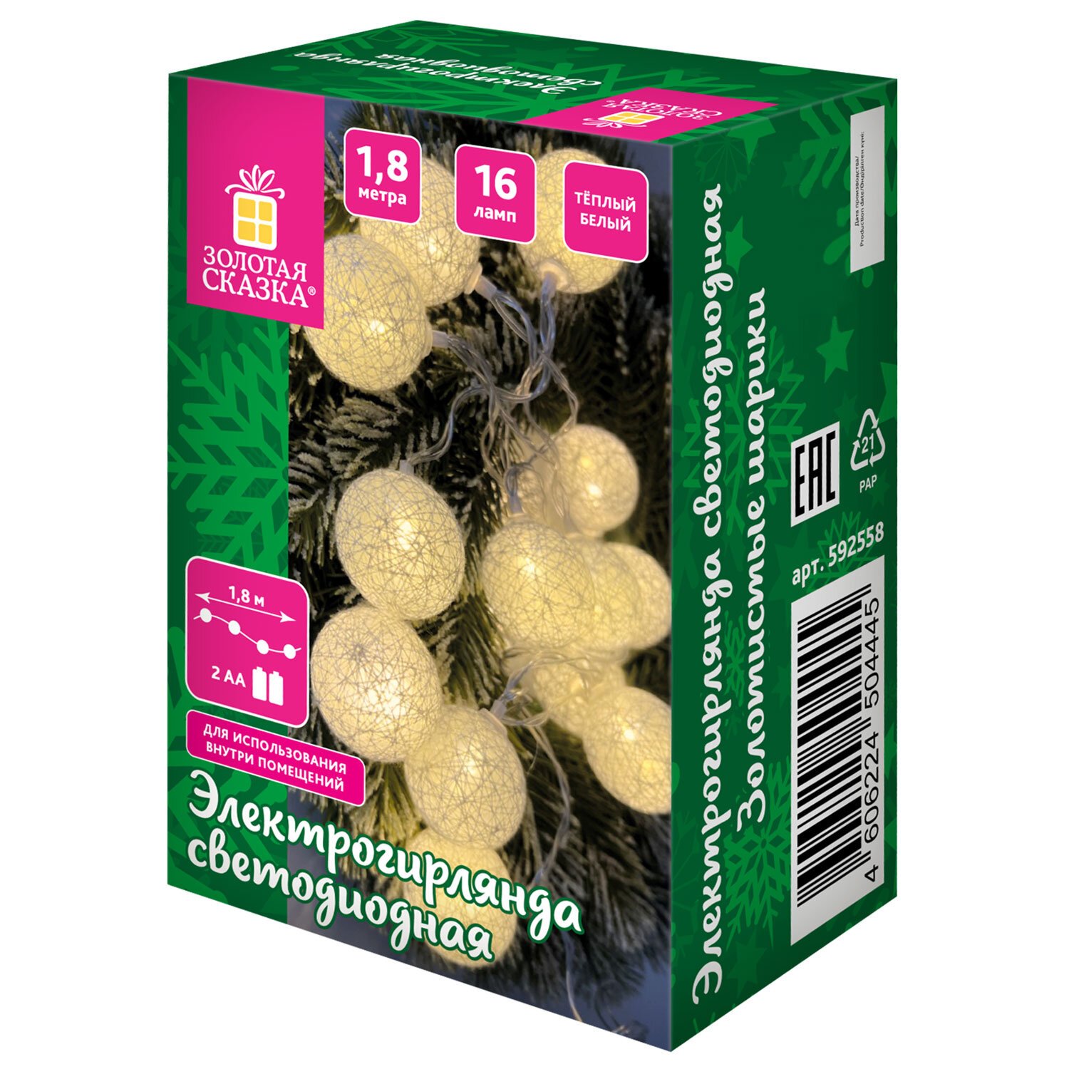 Электрогирлянда-нить комнатная "Шарики" 1,8м 16LED, серебро, тёплый белый, батарейки ЗОЛОТАЯ СКАЗКА 592559