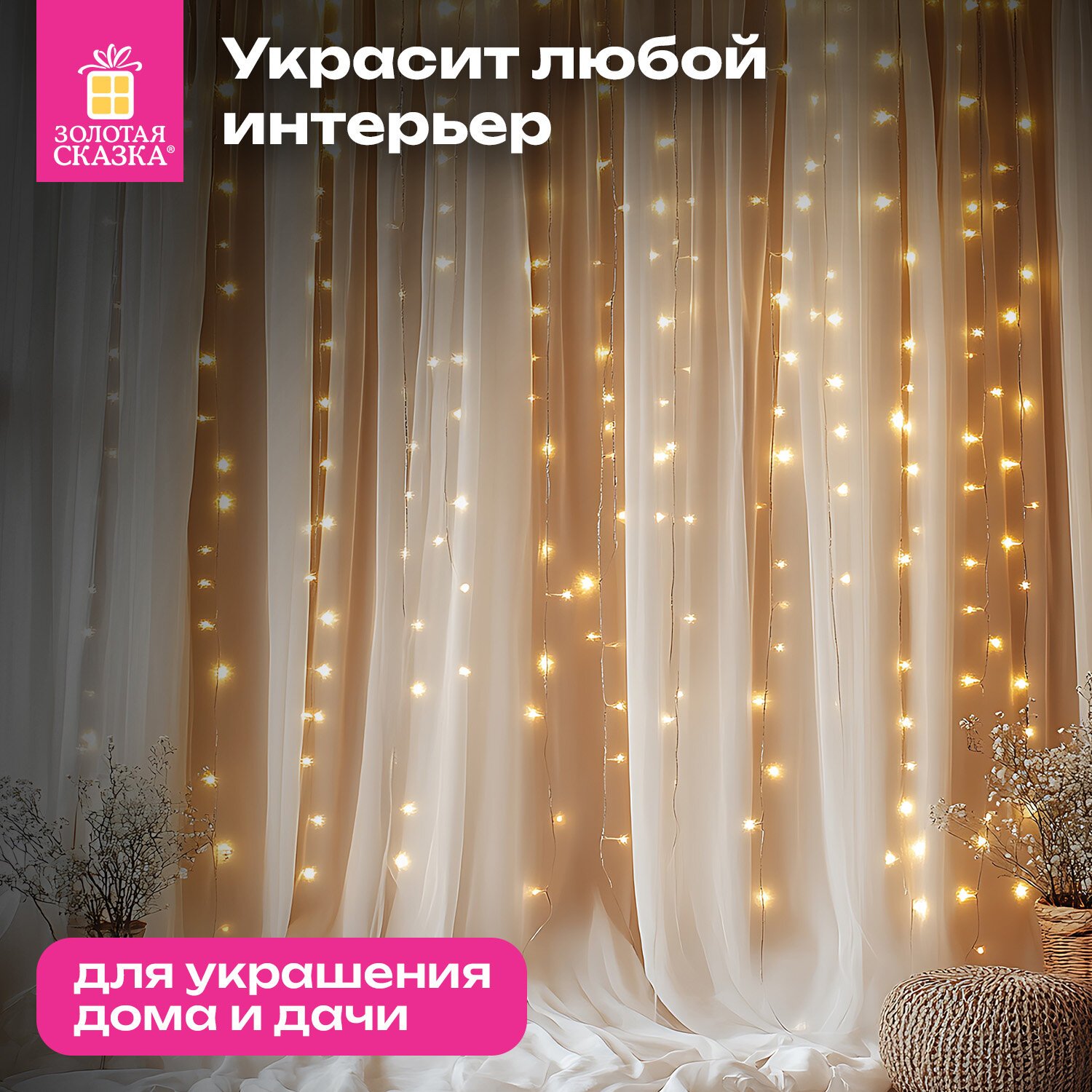 Электрогирлянда-занавес комнатная "Штора" 3х2 м, 144 LED, теплый белый свет, 220 V, ЗОЛОТАЯ СКАЗКА, 591350