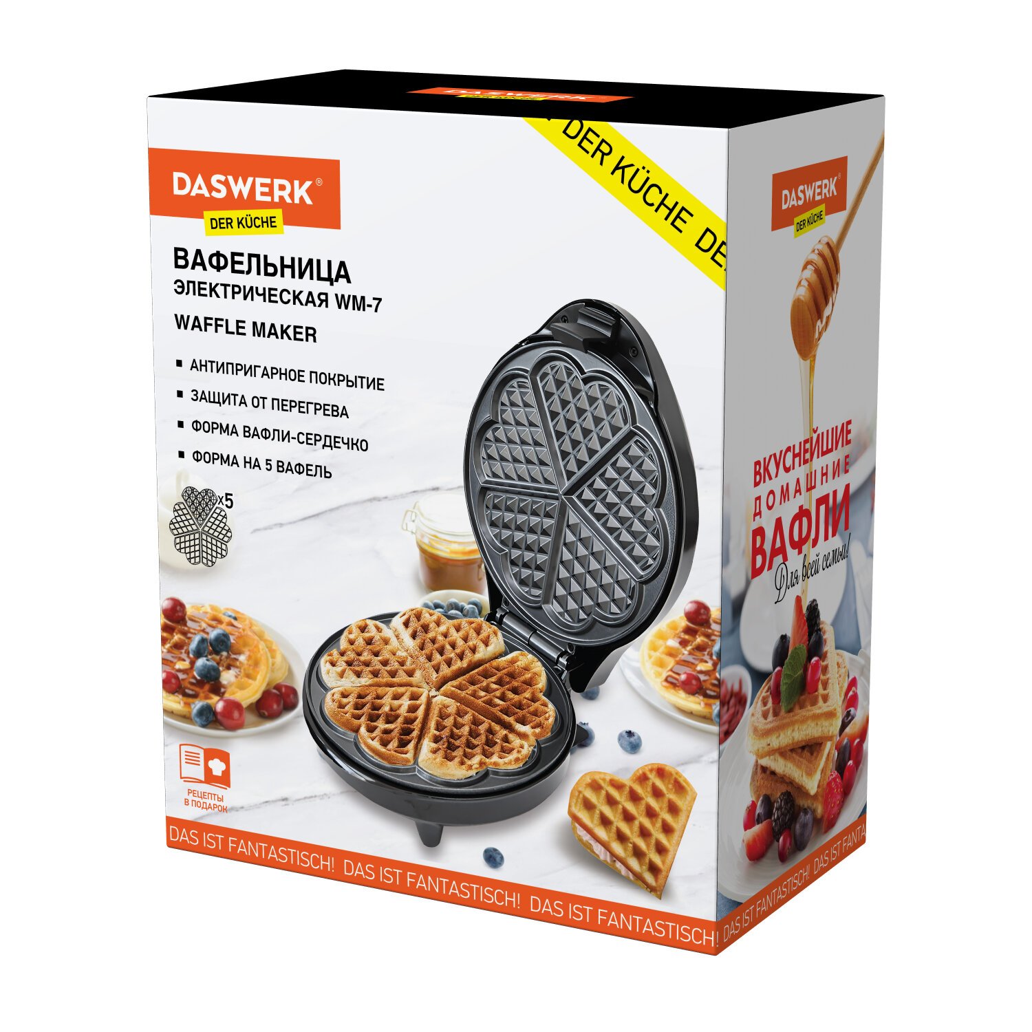 Электровафельница антипригарная для вафель-сердечек, 5 вафель, 1200 Вт, DASWERK, WM-7, 455654