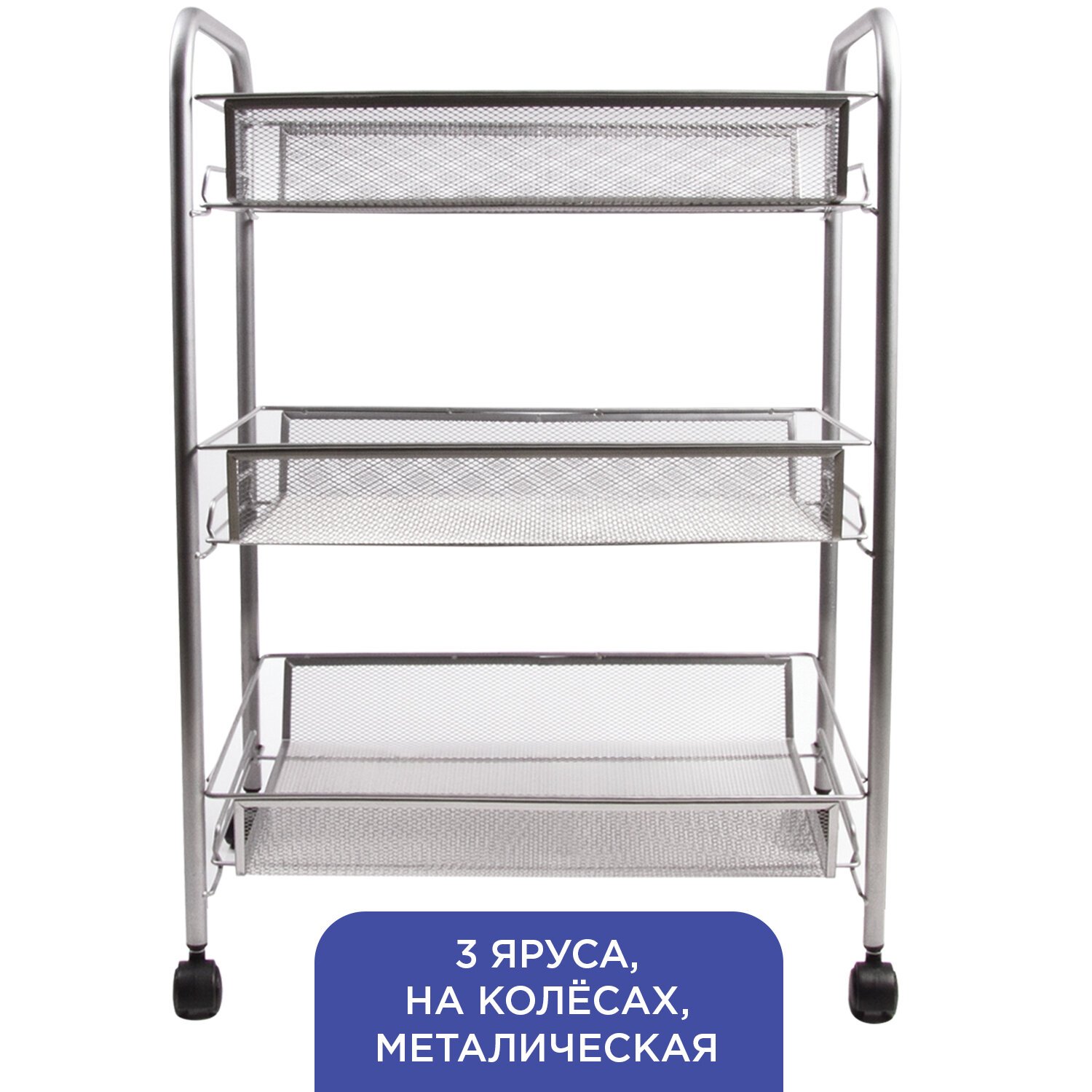 Этажерка (тележка) BRABIX офисно-бытовая 3 яруса, на колесах, металл, серебристая, 43,5х26х62,5 см, 603752