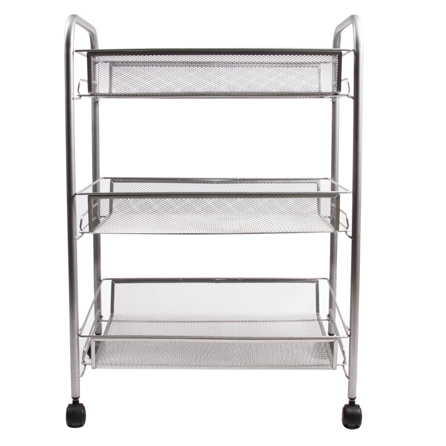 Максимальная нагрузка на каждый из 3 ярусов этажерки - до 5 кг. Изготовлена из прочного металла. Диаметр несущих трубок – 13 мм. Выполнена в серебристом цвете, который будет гармонировать с большинством офисных и домашних интерьеров. Этажерка оснащена самоориентирующимися колёсами, позволяющими с легкостью перемещать её во время уборки, не повреждая напольное покрытие. Размеры модели - 43,5х26х62,5 см. Вес - 2,2 кг.