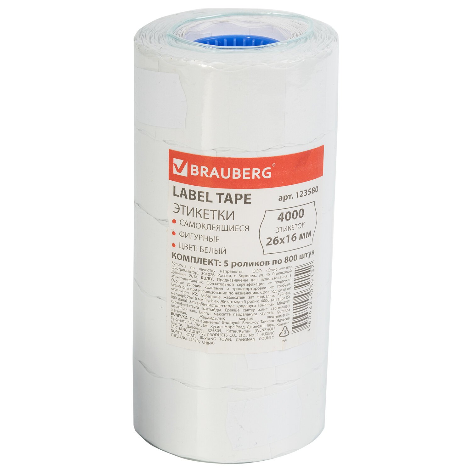 Этикет-лента 26х16 мм, волна, белая, комплект 5 рулонов по 800 шт., BRAUBERG, 123580