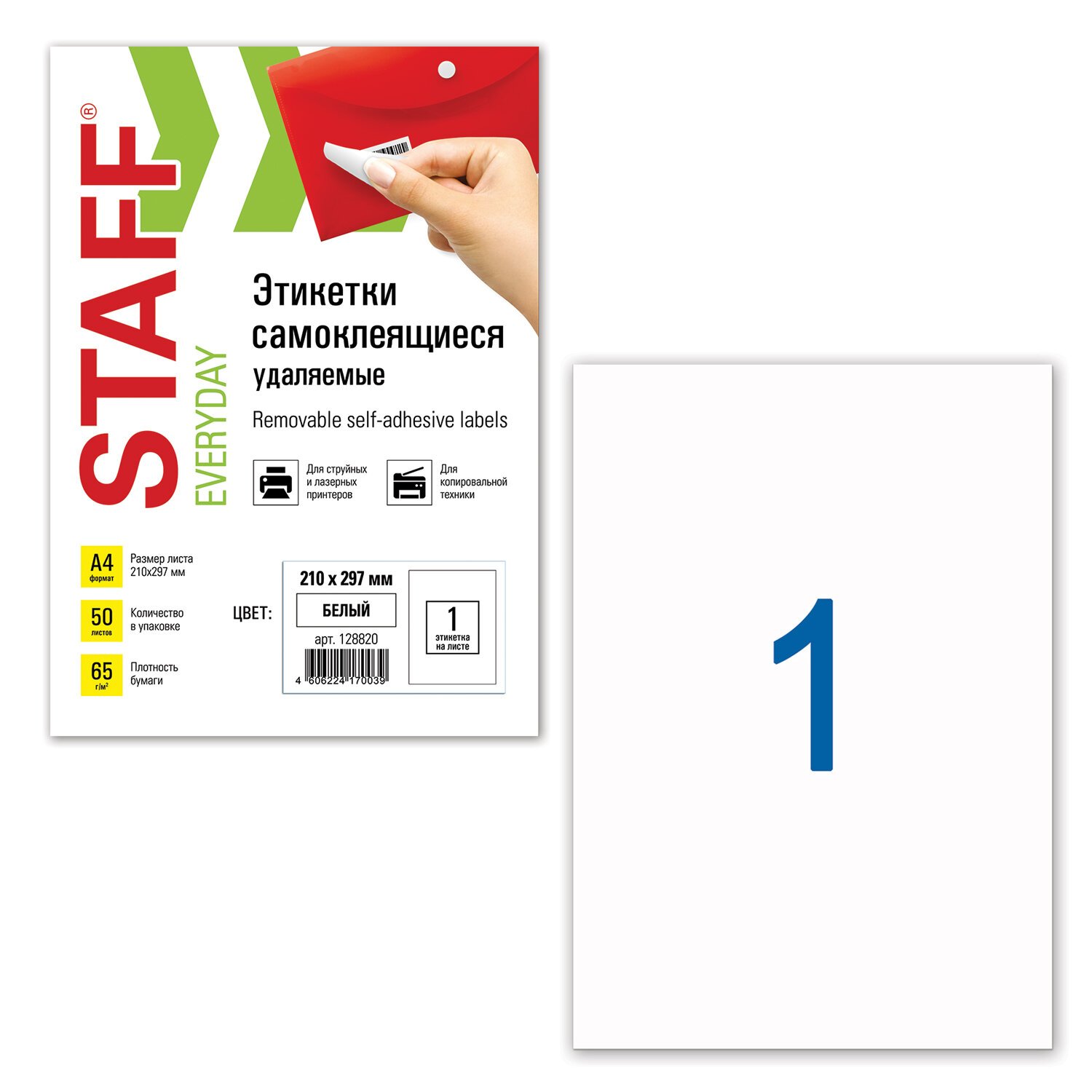 Этикетка самоклеящаяся УДАЛЯЕМАЯ, 210х297 мм, 1 этикетка, белая, 65 г/м2, 50 листов, STAFF, 128820
