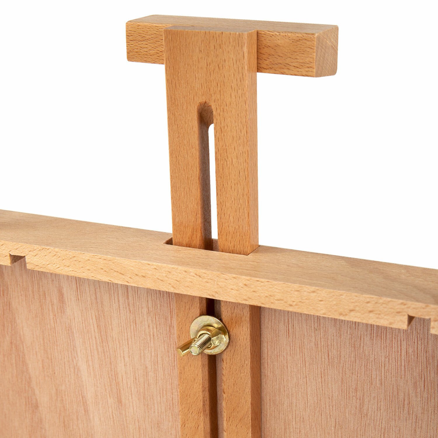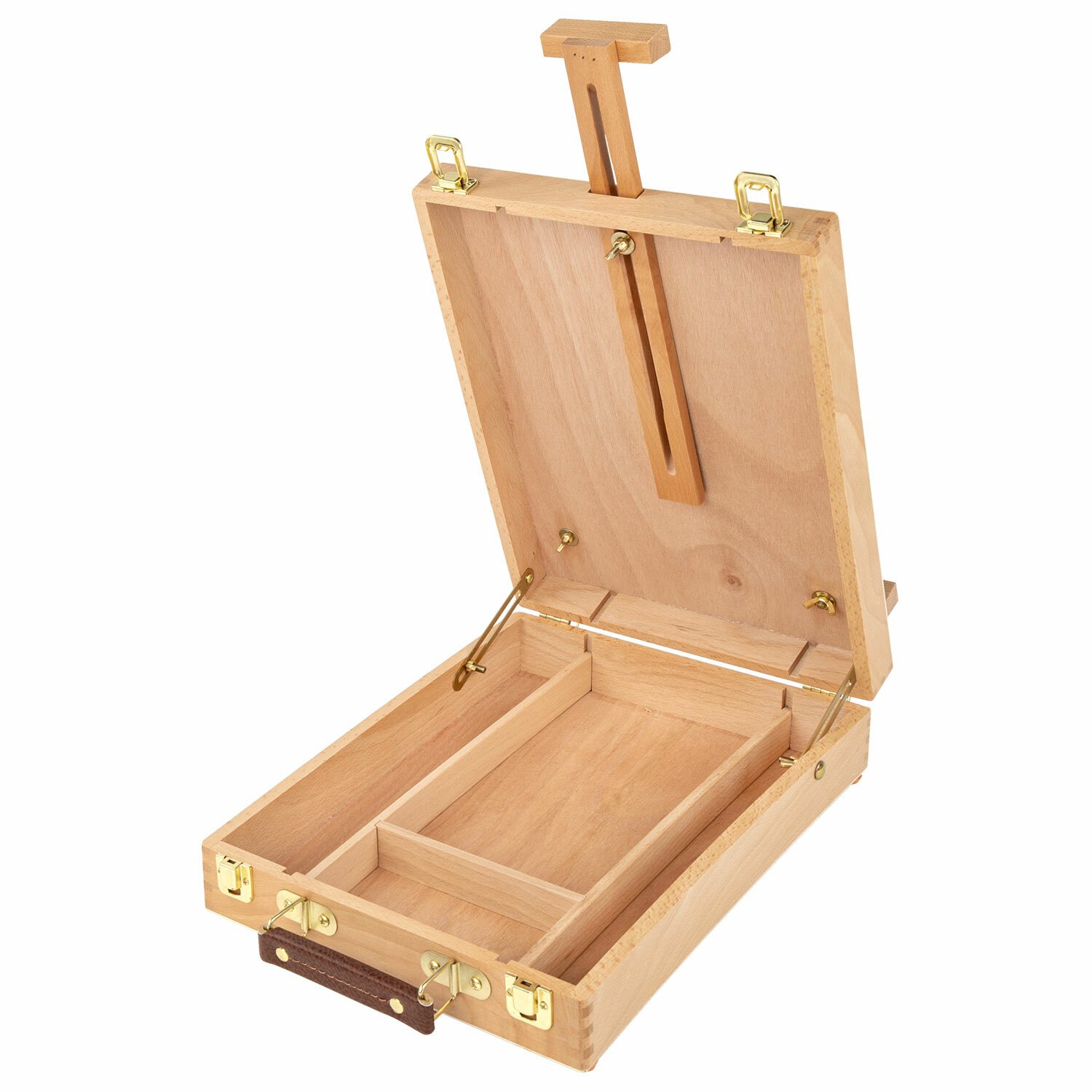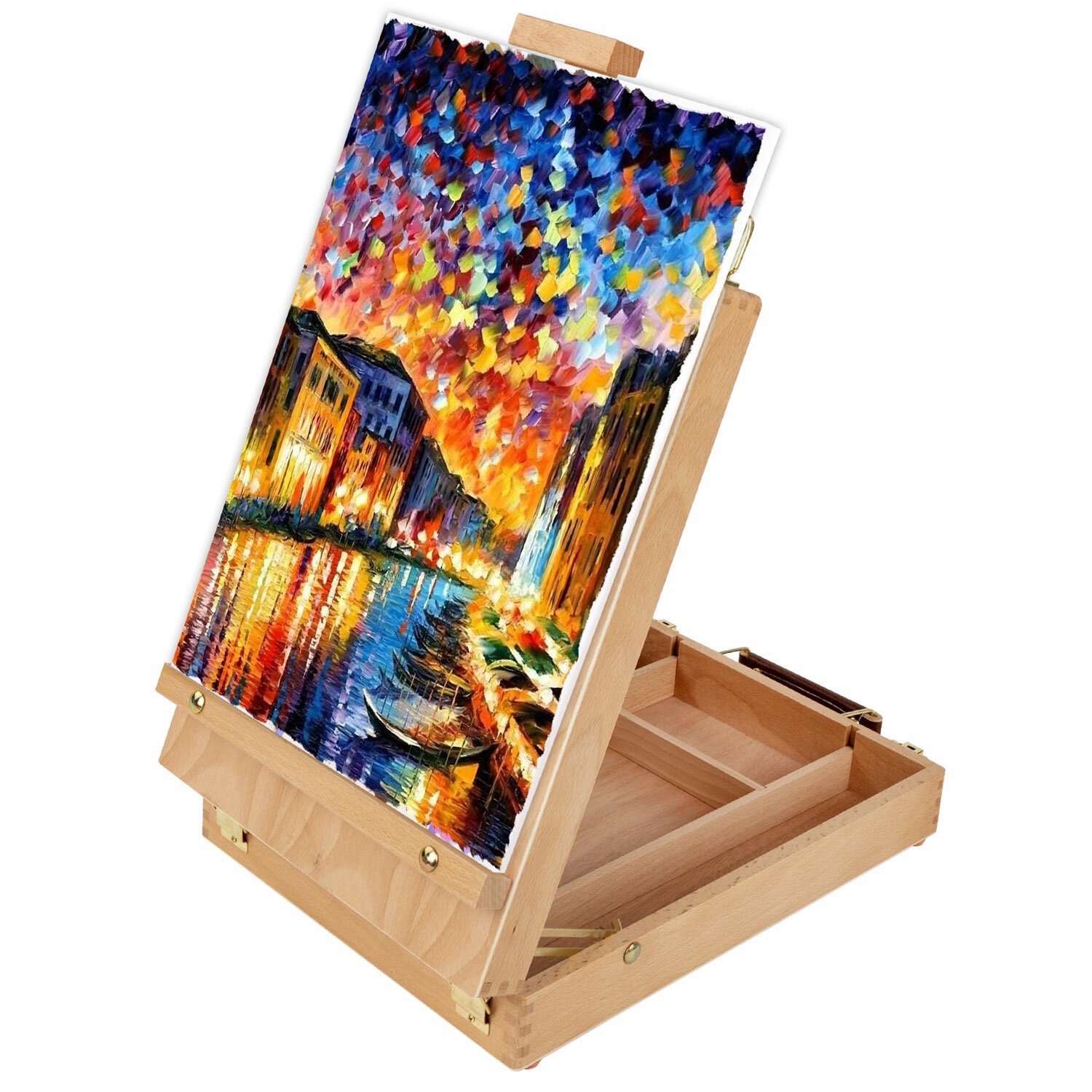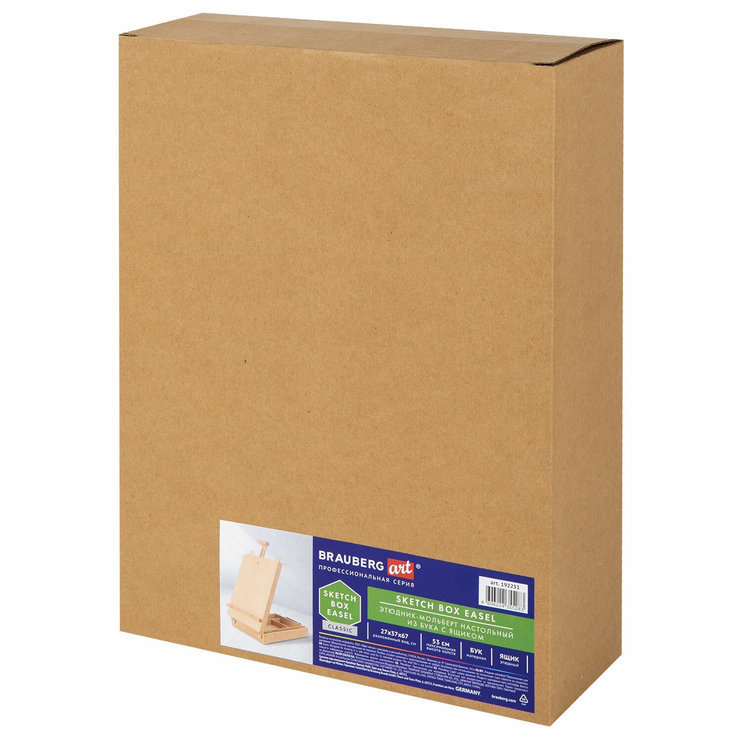 Настольный этюдник-мольберт изготовлен из натурального бука, пропитанного маслом. Этюдник снабжен специальным ящиком для художественных принадлежностей. Угол наклона и высота мачты регулируется. Оснащен удобной ручкой. Глубина полки – 2 см, ширина полки – 21 см. Максимальная высота холста – 53 см. Размер в рабочем виде – 27х37х67 см. Размер основания – 27х38 см. Вес – 1,6 кг.
