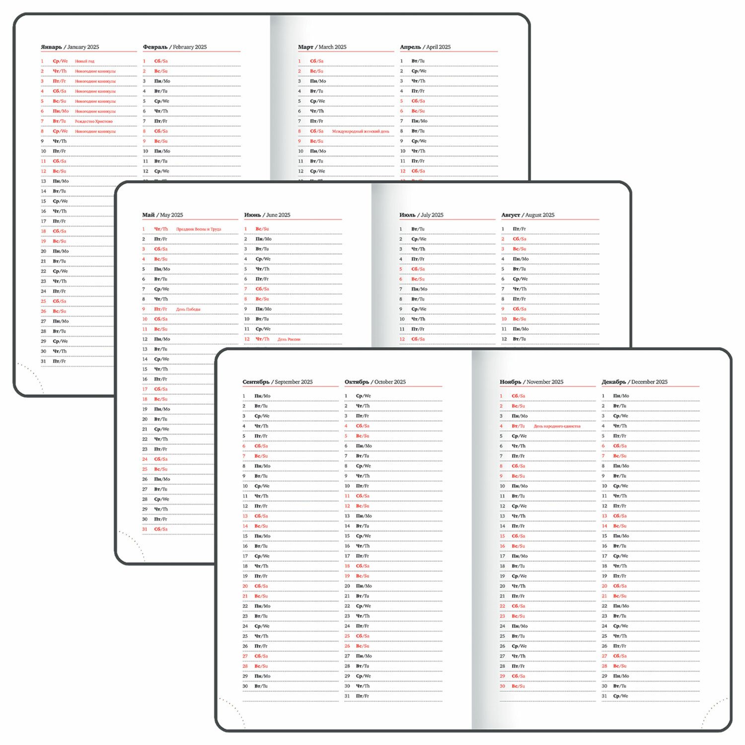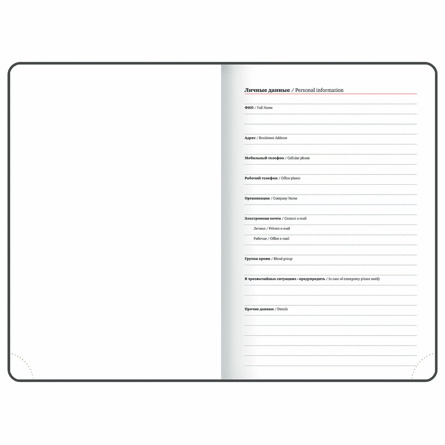 Внутренний блок включает 168 листов белой бумаги плотностью 70 г/м2. Каждая страничка имеет перфорированный угол. Благодаря стандартному формату А5 (138x213 мм) ежедневник удобно использовать как в офисе, так и на выездных деловых встречах.
