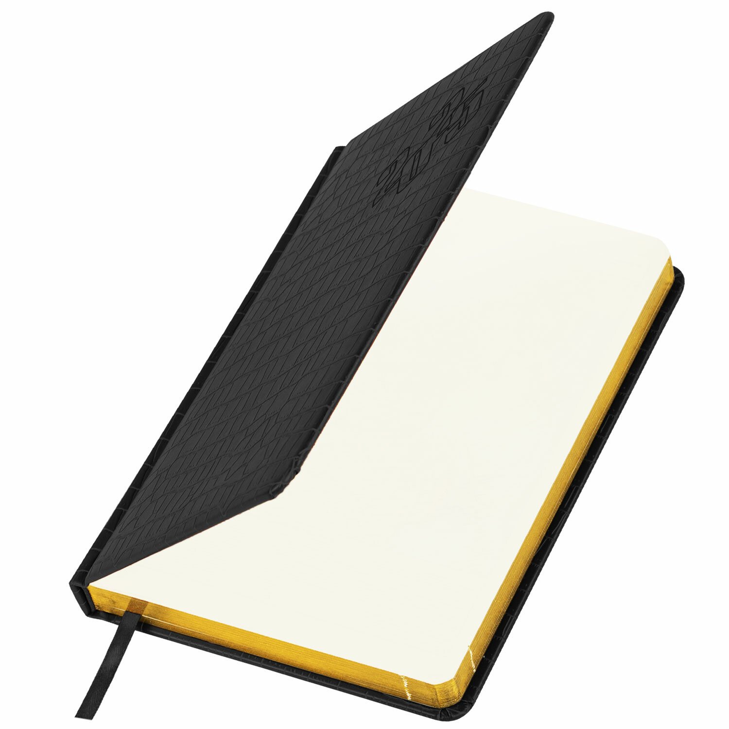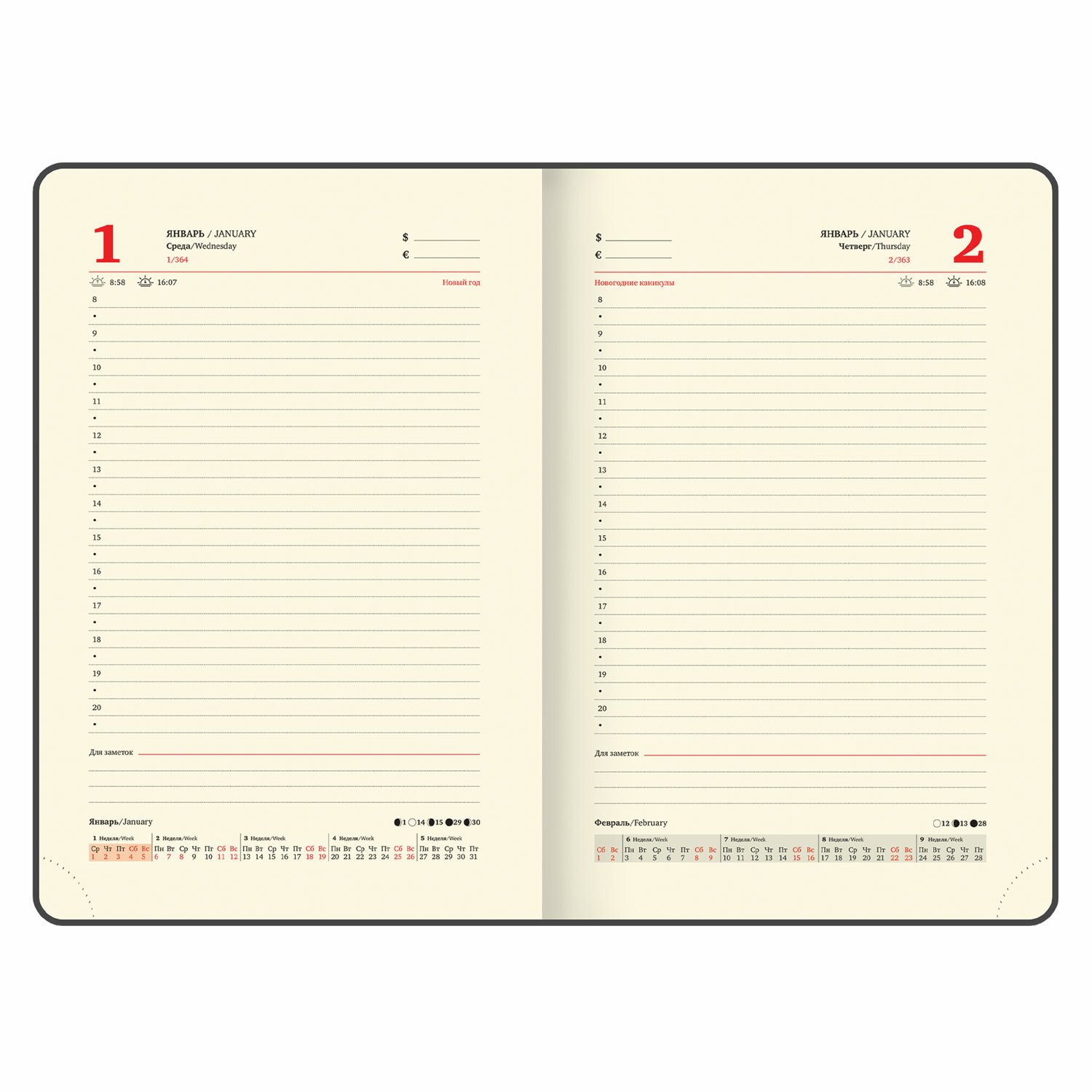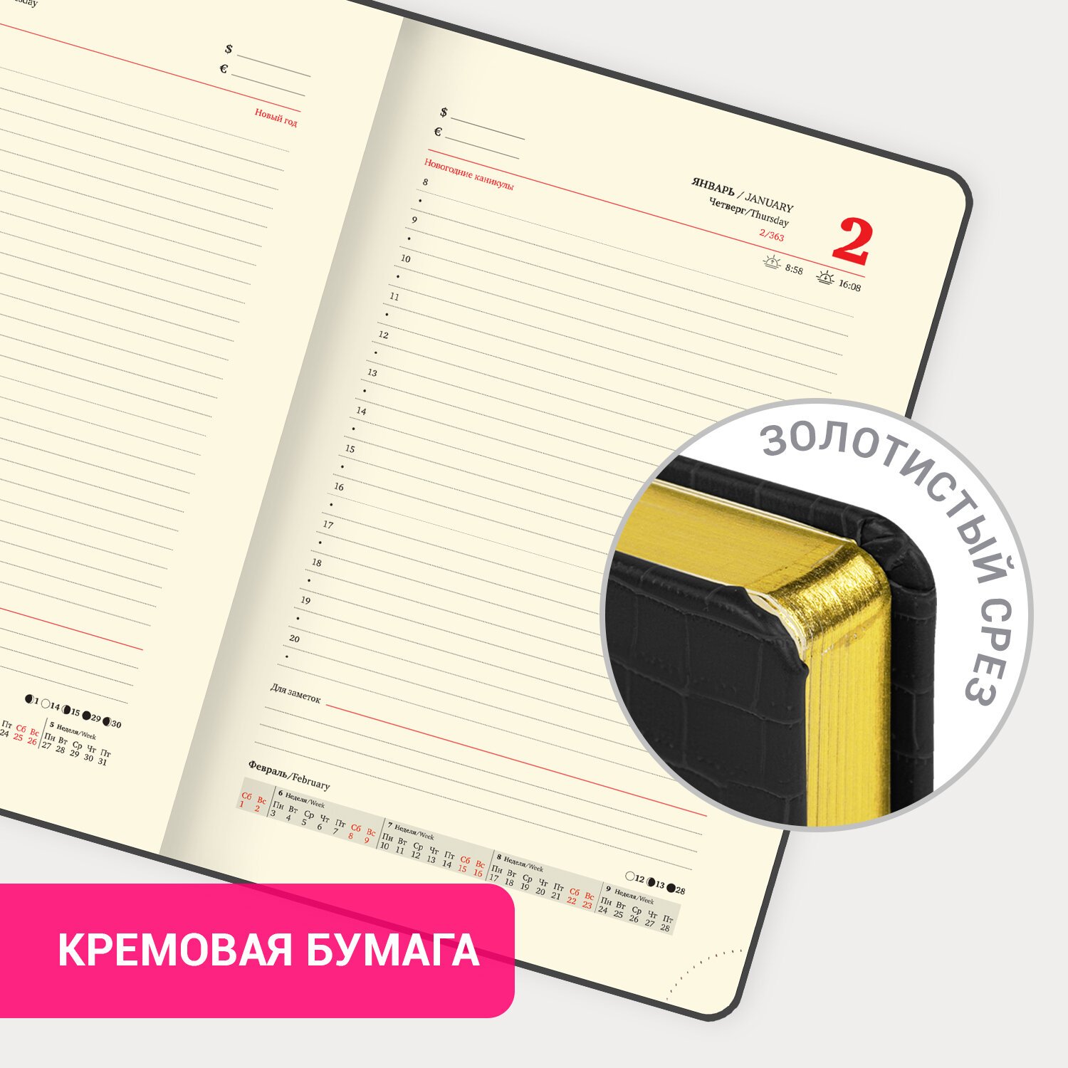 Внутренний блок включает 168 листов тонированной бумаги плотностью 70 г/м2. Каждая страничка имеет перфорированный угол. Благодаря стандартному формату А5 (138х213 мм) ежедневник удобно использовать как в офисе, так и на выездных деловых встречах. Материал обложки черного цвета подходит для горячего тиснения. Срез ежедневника фольгирован золотой фольгой, что придает ему особый шарм.