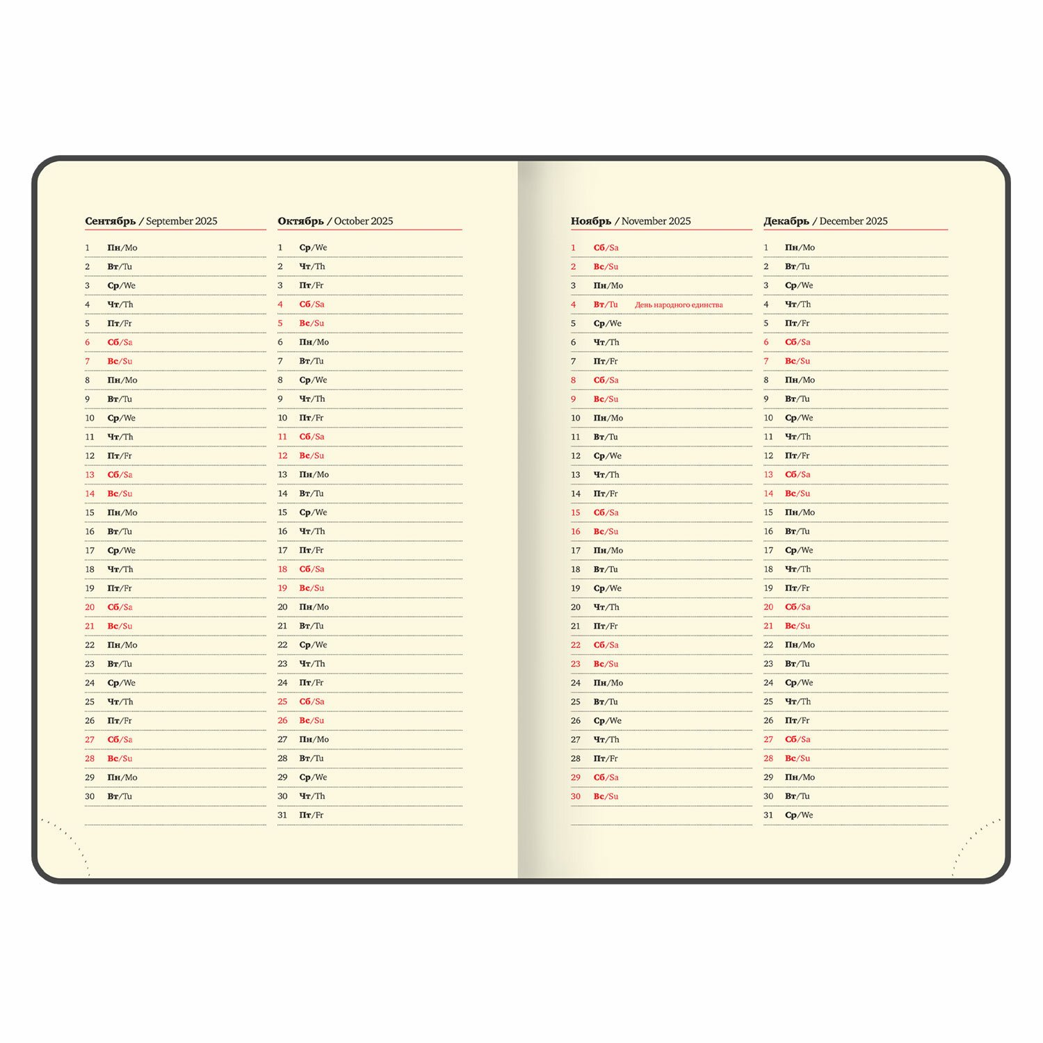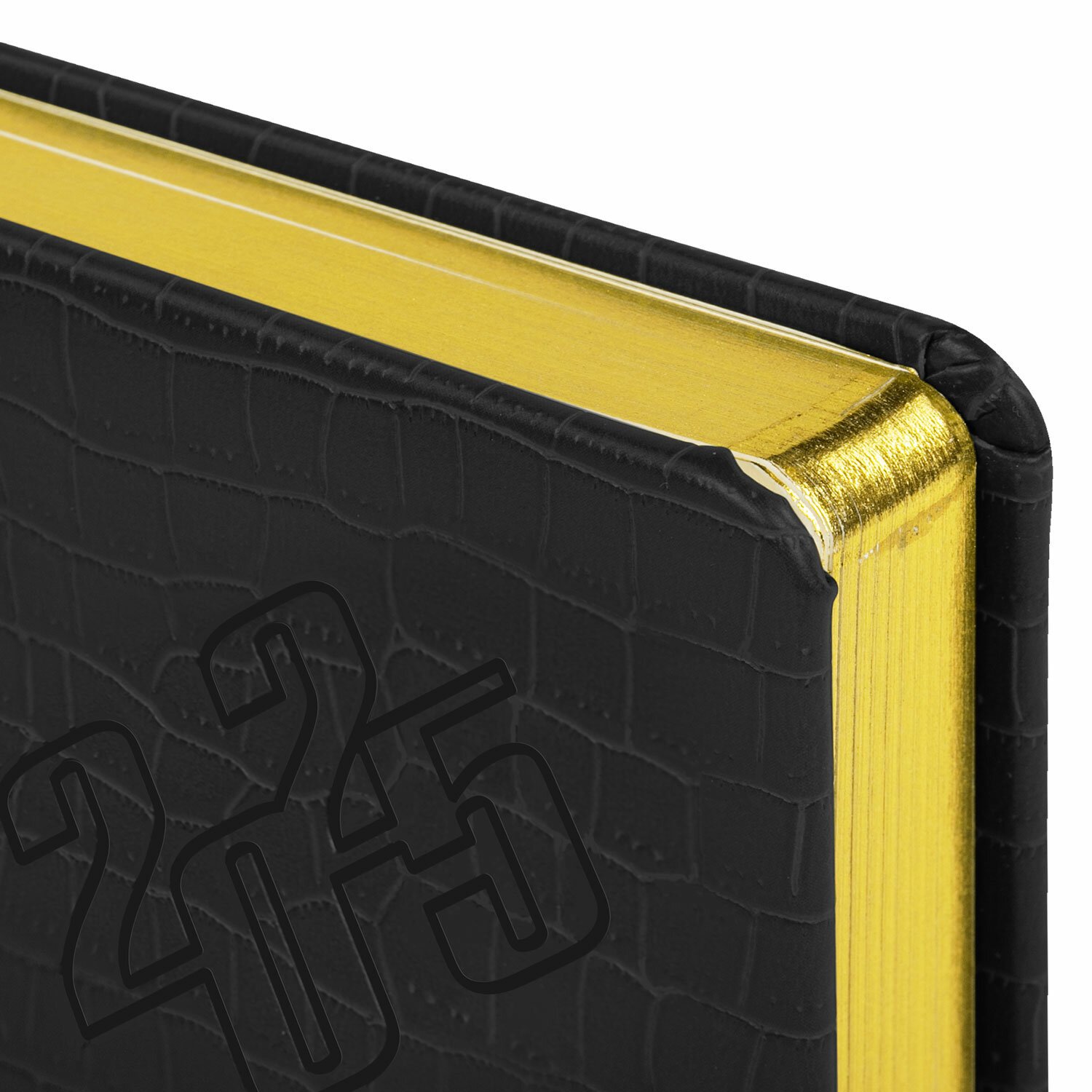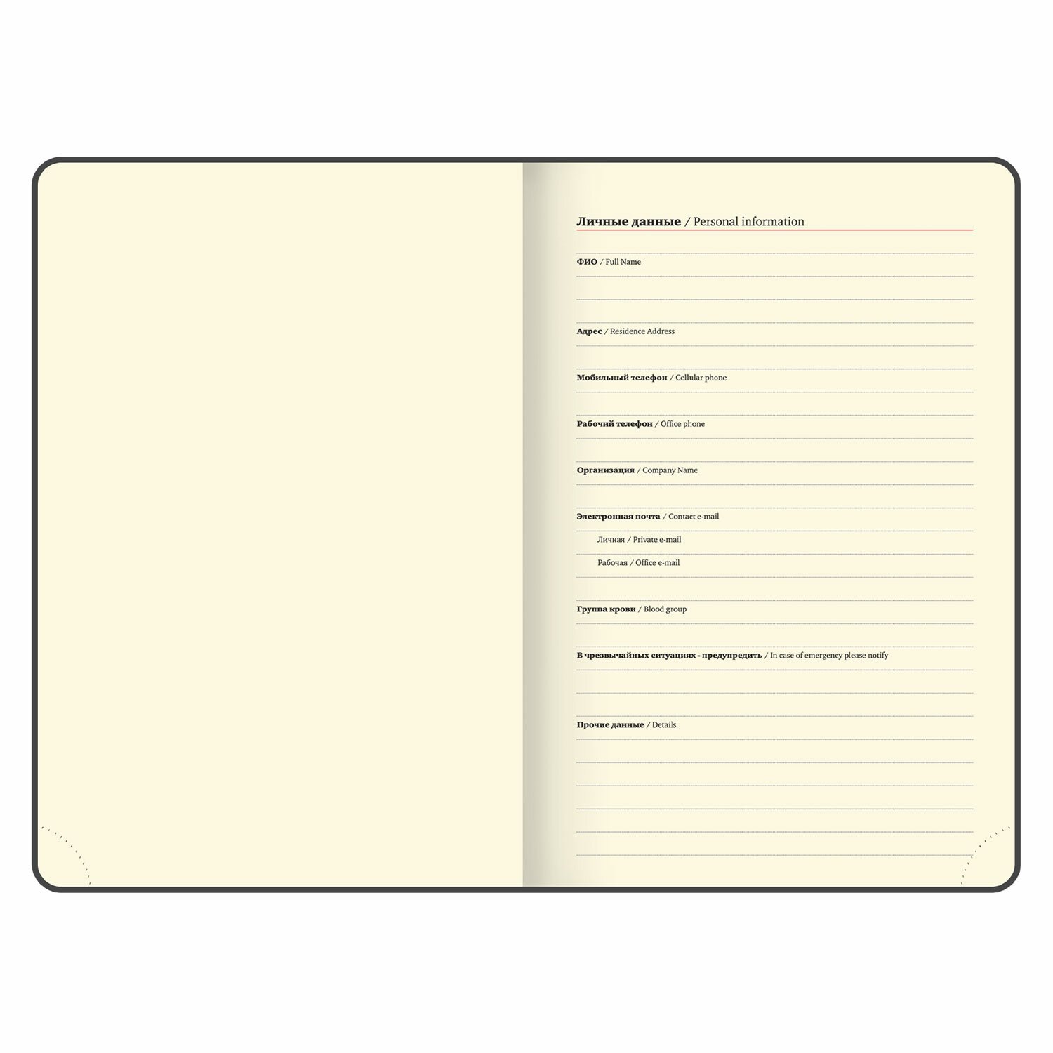 Внутренний блок включает 168 листов тонированной бумаги плотностью 70 г/м2. Каждая страничка имеет перфорированный угол. Благодаря стандартному формату А5 (138х213 мм) ежедневник удобно использовать как в офисе, так и на выездных деловых встречах. Материал обложки черного цвета подходит для горячего тиснения. Срез ежедневника фольгирован золотой фольгой, что придает ему особый шарм.