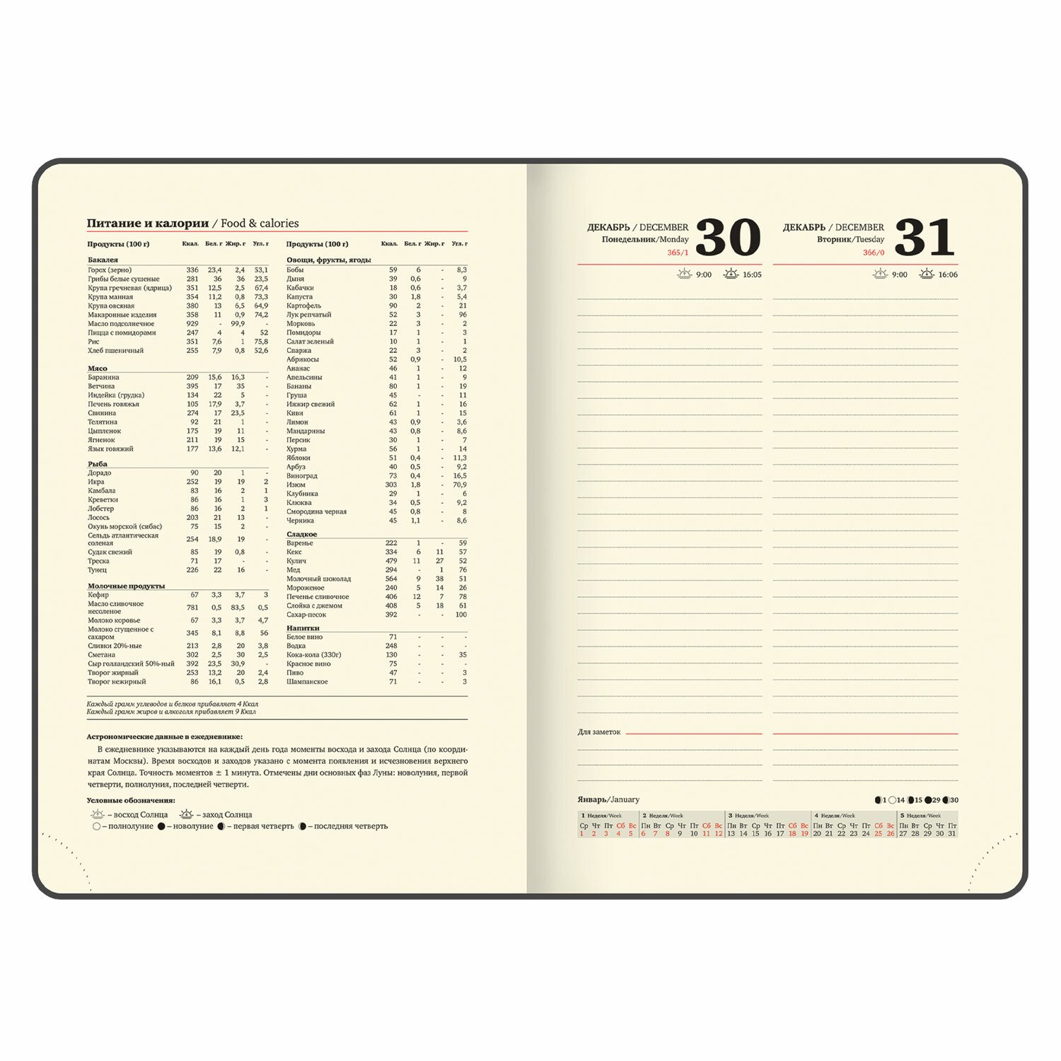 Дополнением является закладка-ляссе, с помощью которой при необходимости можно быстро открыть ежедневник на нужной странице. Ежедневник снабжен обширным справочным материалом. В конце имеются 4 страницы для записей и заметок.