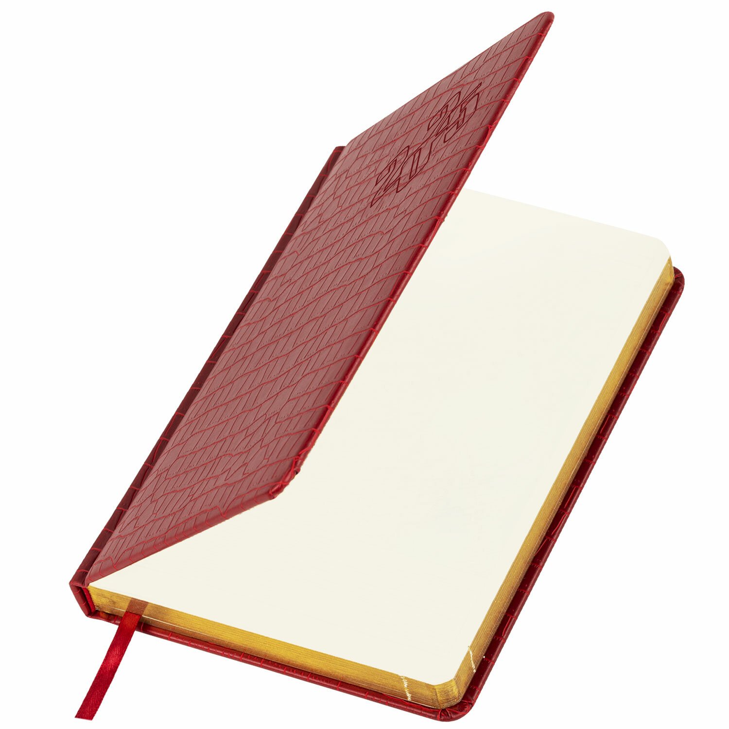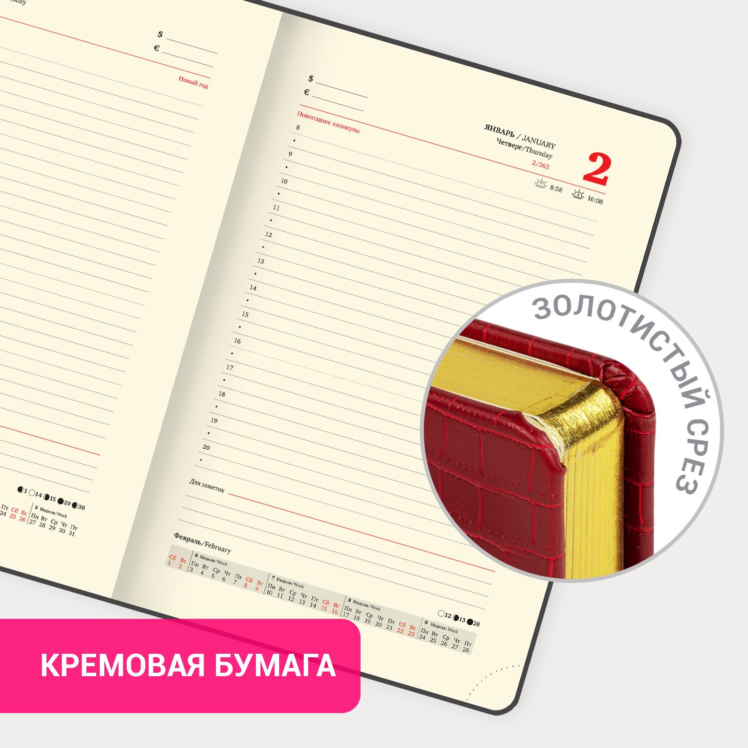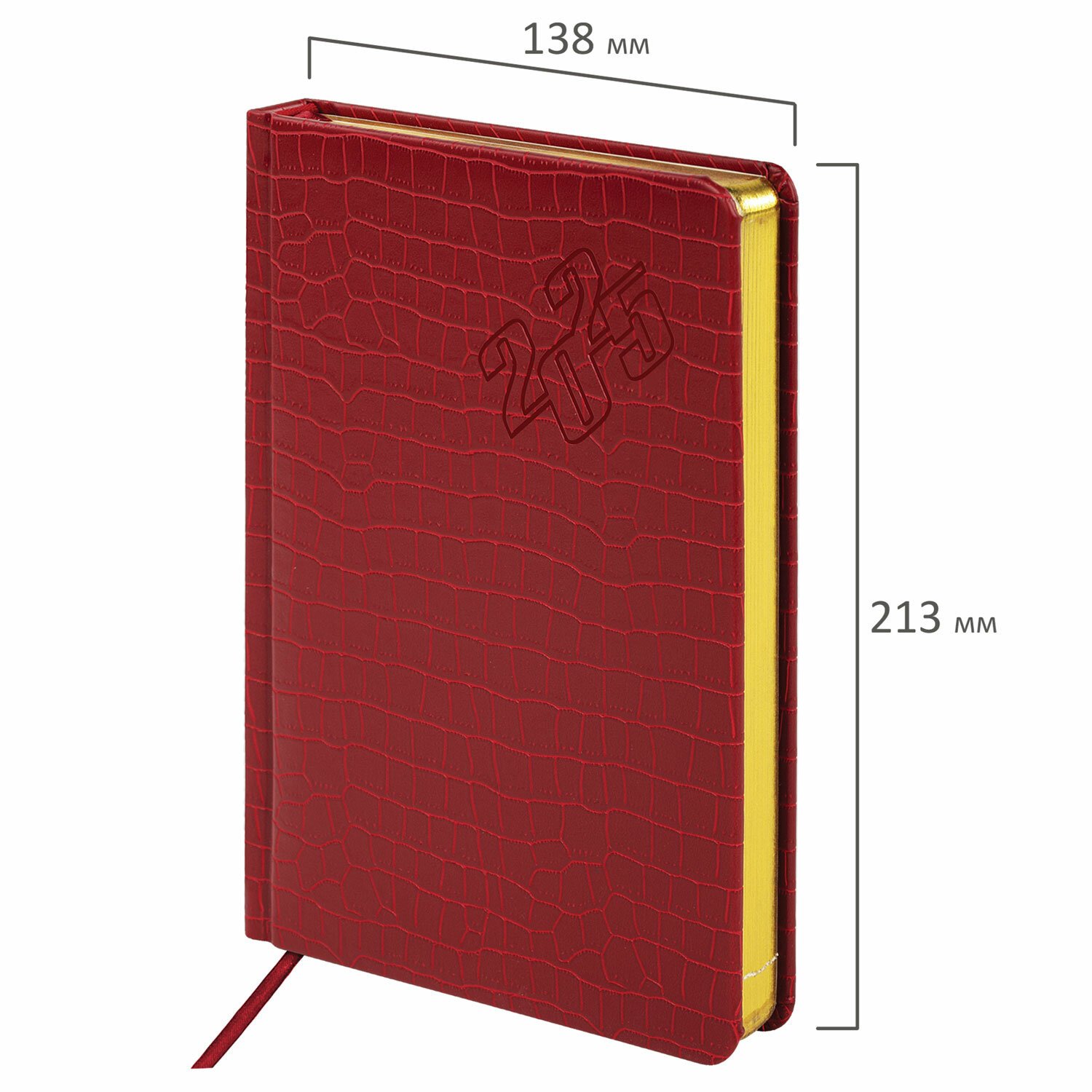 Внутренний блок включает 168 листов тонированной бумаги плотностью 70 г/м2. Каждая страничка имеет перфорированный угол. Благодаря стандартному формату А5 (138х213 мм) ежедневник удобно использовать как в офисе, так и на выездных деловых встречах. Материал обложки насыщенного красного цвета подходит для горячего тиснения. Срез ежедневника фольгирован золотой фольгой, что придает ему особый шарм.