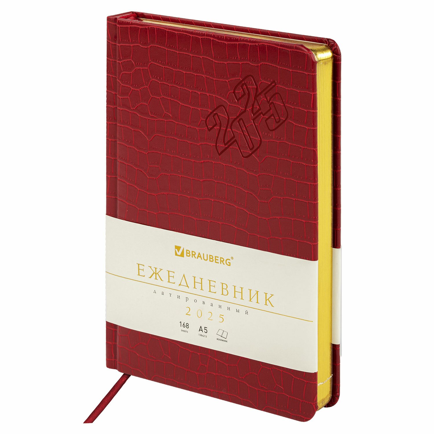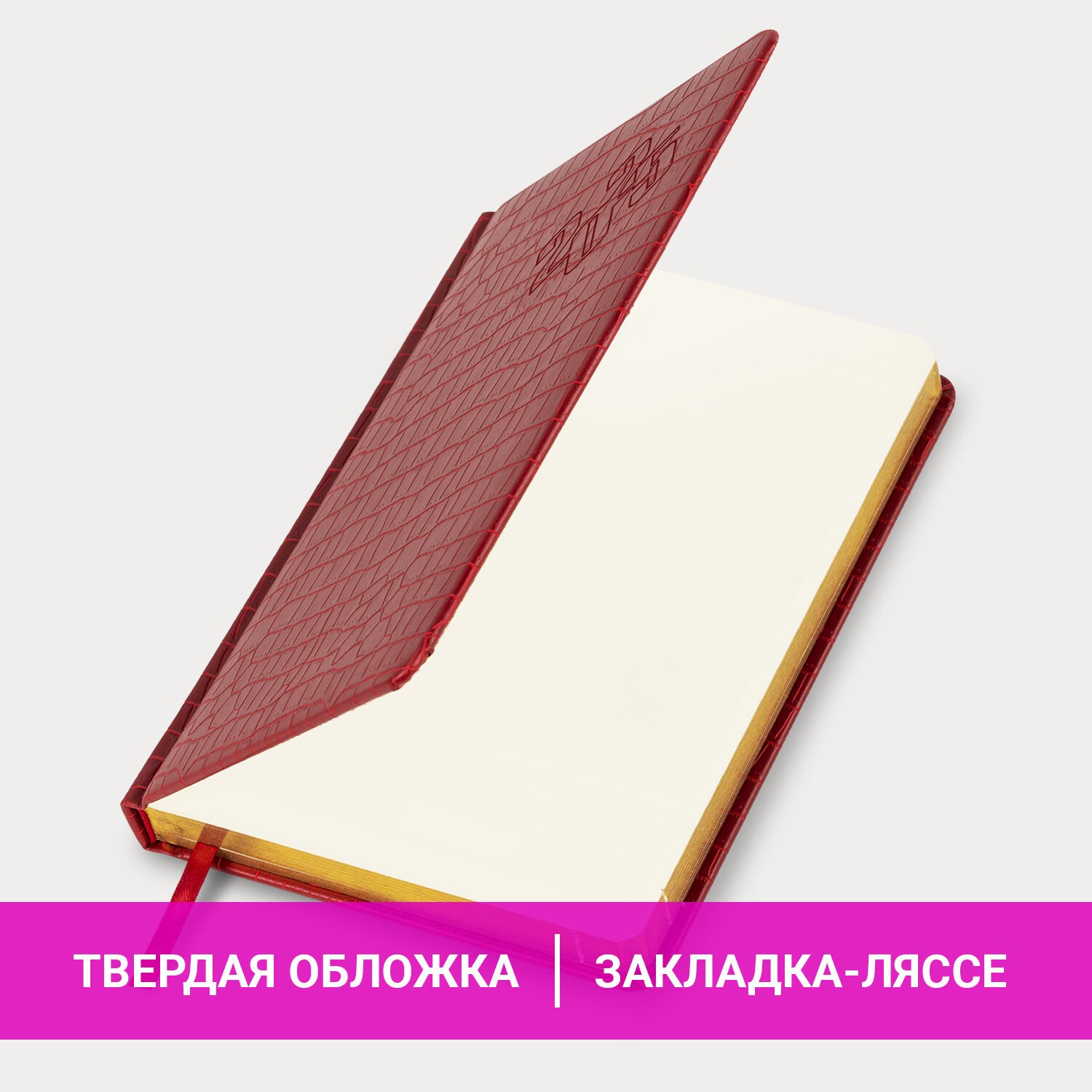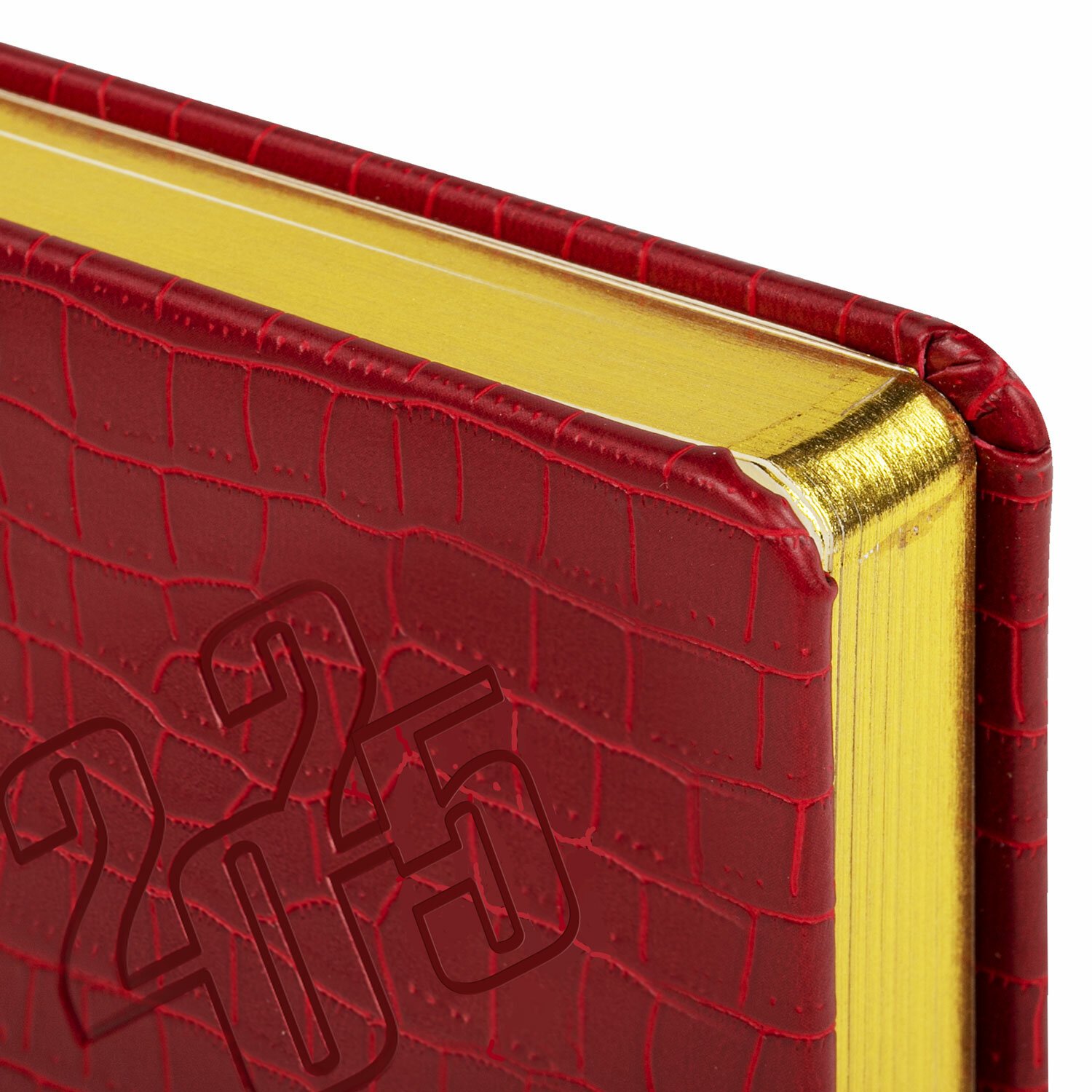 Внутренний блок включает 168 листов тонированной бумаги плотностью 70 г/м2. Каждая страничка имеет перфорированный угол. Благодаря стандартному формату А5 (138х213 мм) ежедневник удобно использовать как в офисе, так и на выездных деловых встречах. Материал обложки насыщенного красного цвета подходит для горячего тиснения. Срез ежедневника фольгирован золотой фольгой, что придает ему особый шарм.