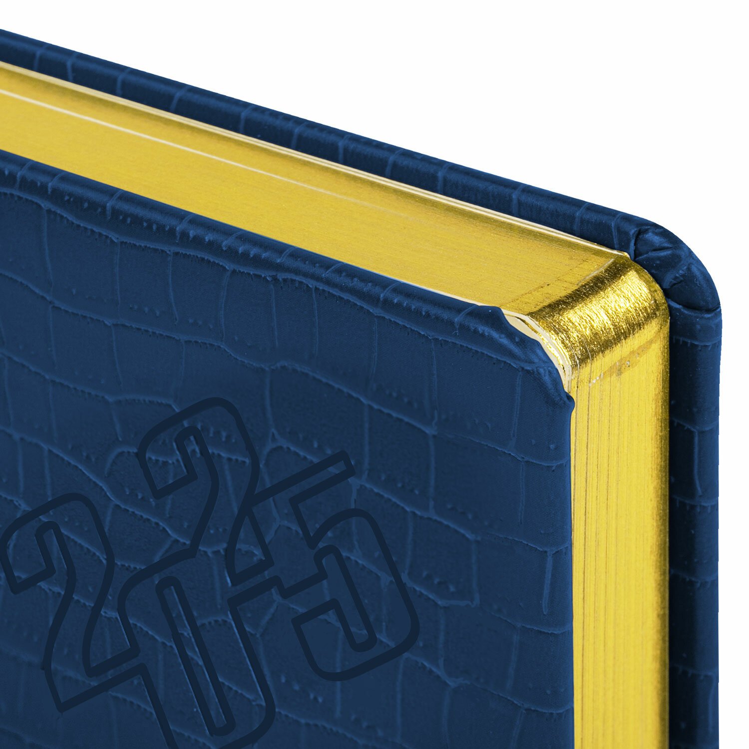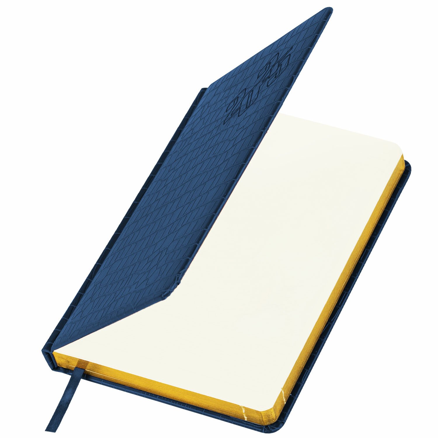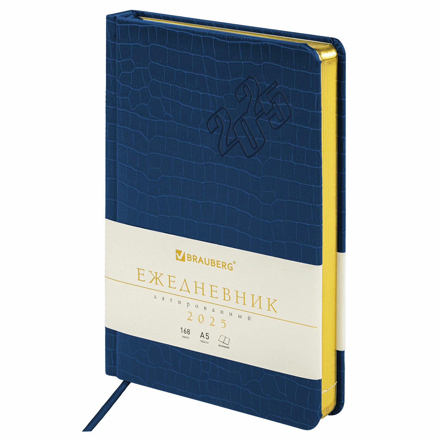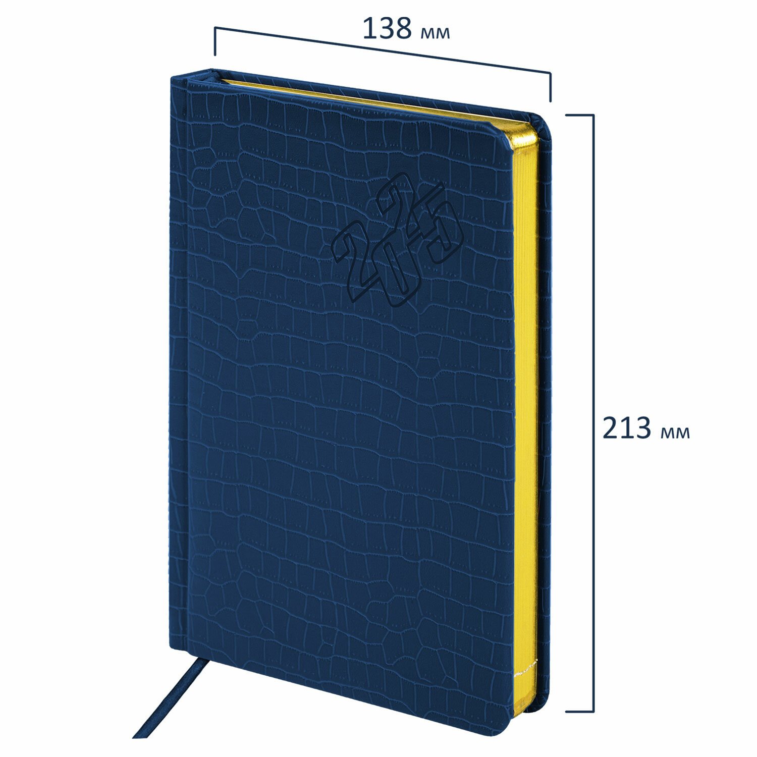 Внутренний блок включает 168 листов тонированной бумаги плотностью 70 г/м2. Каждая страничка имеет перфорированный угол. Благодаря стандартному формату А5 (138х213 мм) ежедневник удобно использовать как в офисе, так и на выездных деловых встречах. Материал обложки насыщенного синего цвета подходит для горячего тиснения. Срез ежедневника фольгирован золотой фольгой, что придает ему особый шарм.