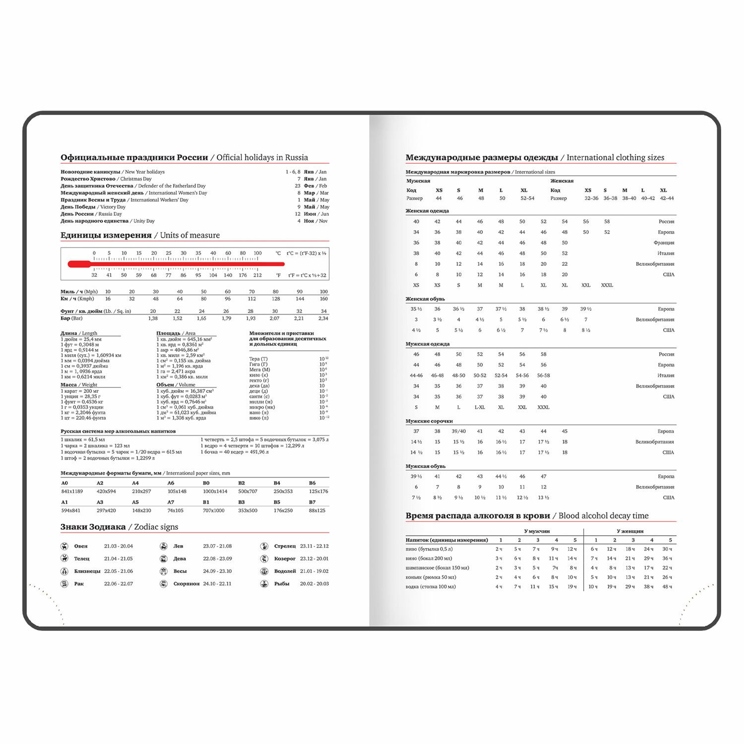 Дополнением является закладка-ляссе, с помощью которой при необходимости можно быстро открыть ежедневник на нужной странице. Ежедневник снабжен обширным справочным материалом. В конце ежедневника есть 4 страницы для записей и заметок.