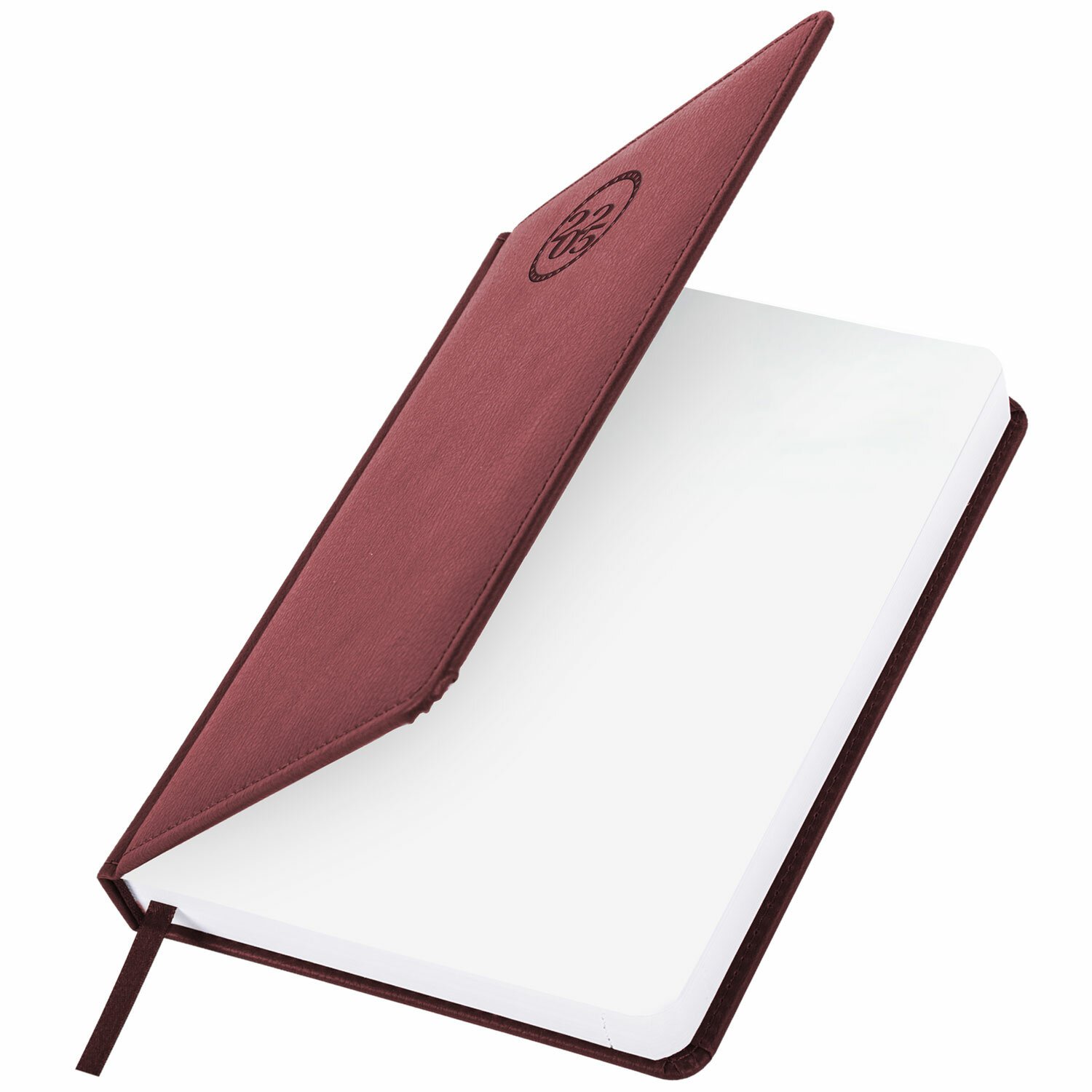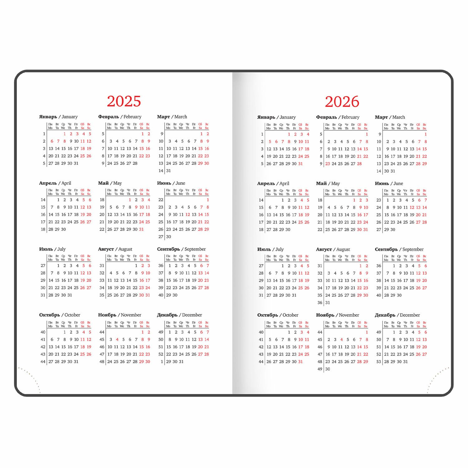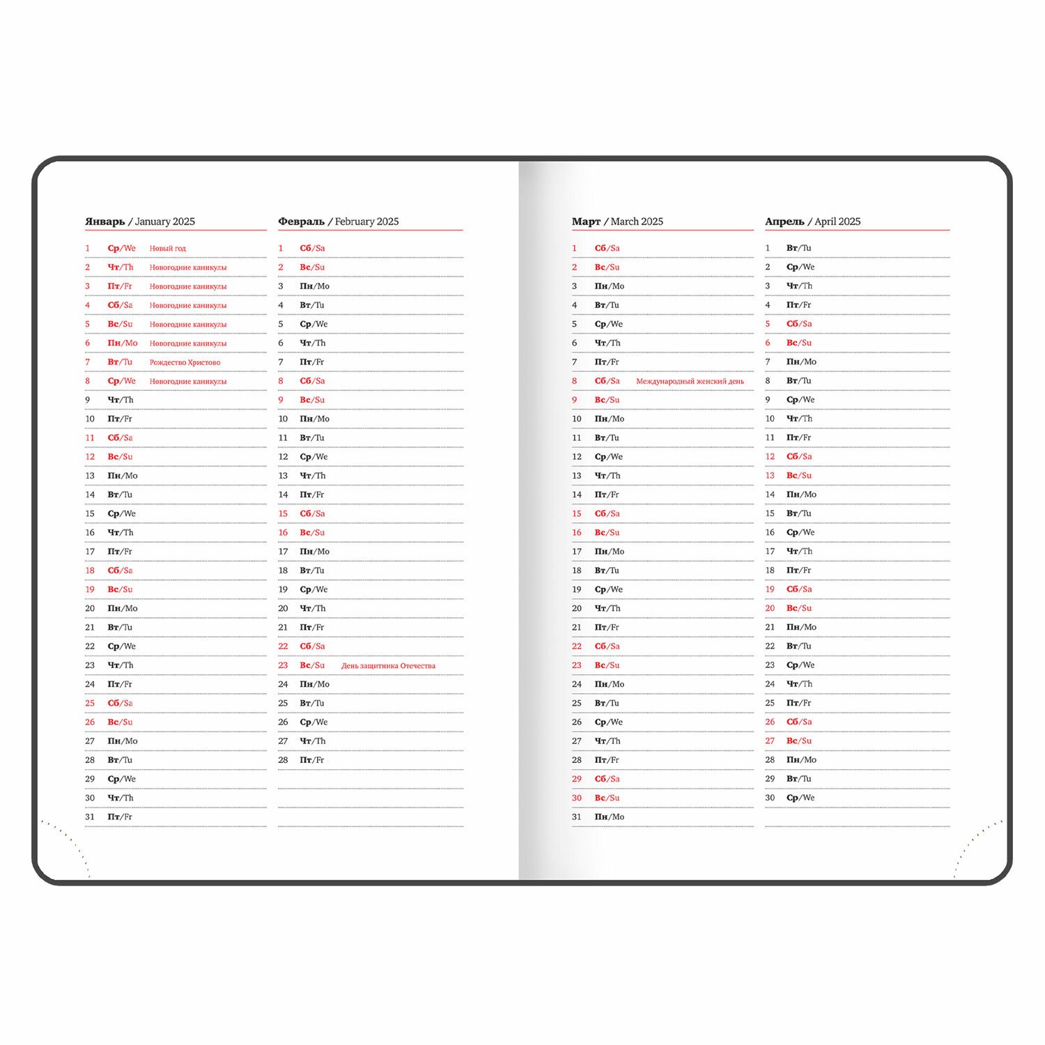 Внутренний блок включает 168 листов белой бумаги плотностью 70 г/м2. Каждая страничка имеет перфорированный угол. Благодаря стандартному формату А5 ежедневник удобно использовать как в офисе, так и на выездных деловых встречах. Обложка с прошивкой по периметру имеет ярко выраженную текстуру под кожу, приятную на ощупь. Материал обложки подходит для горячего тиснения.