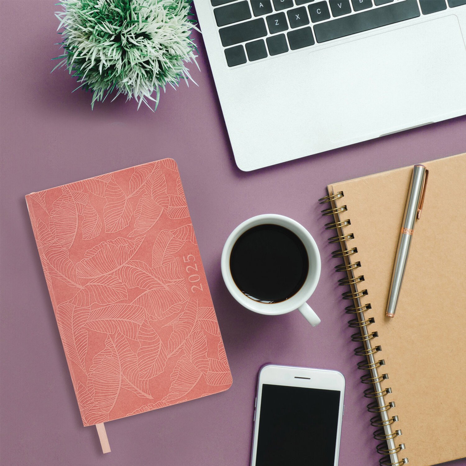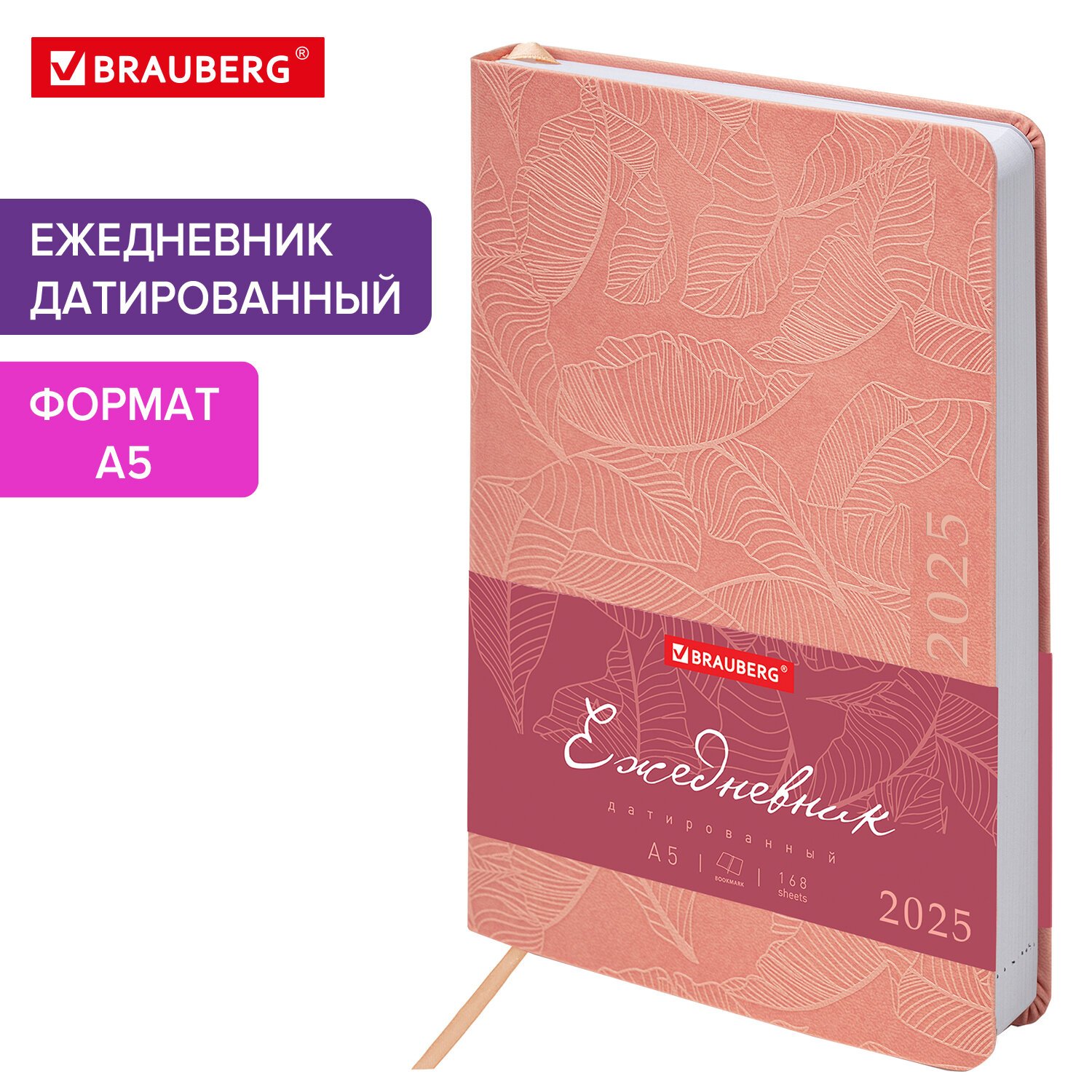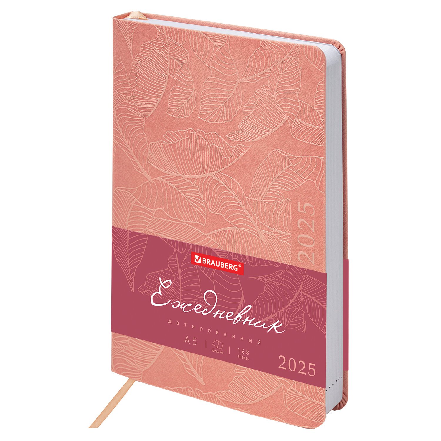 Ежедневник датированный 2025, А5, 138x213 мм, BRAUBERG "Foliage", под кожу гибкий, розовый, 115852