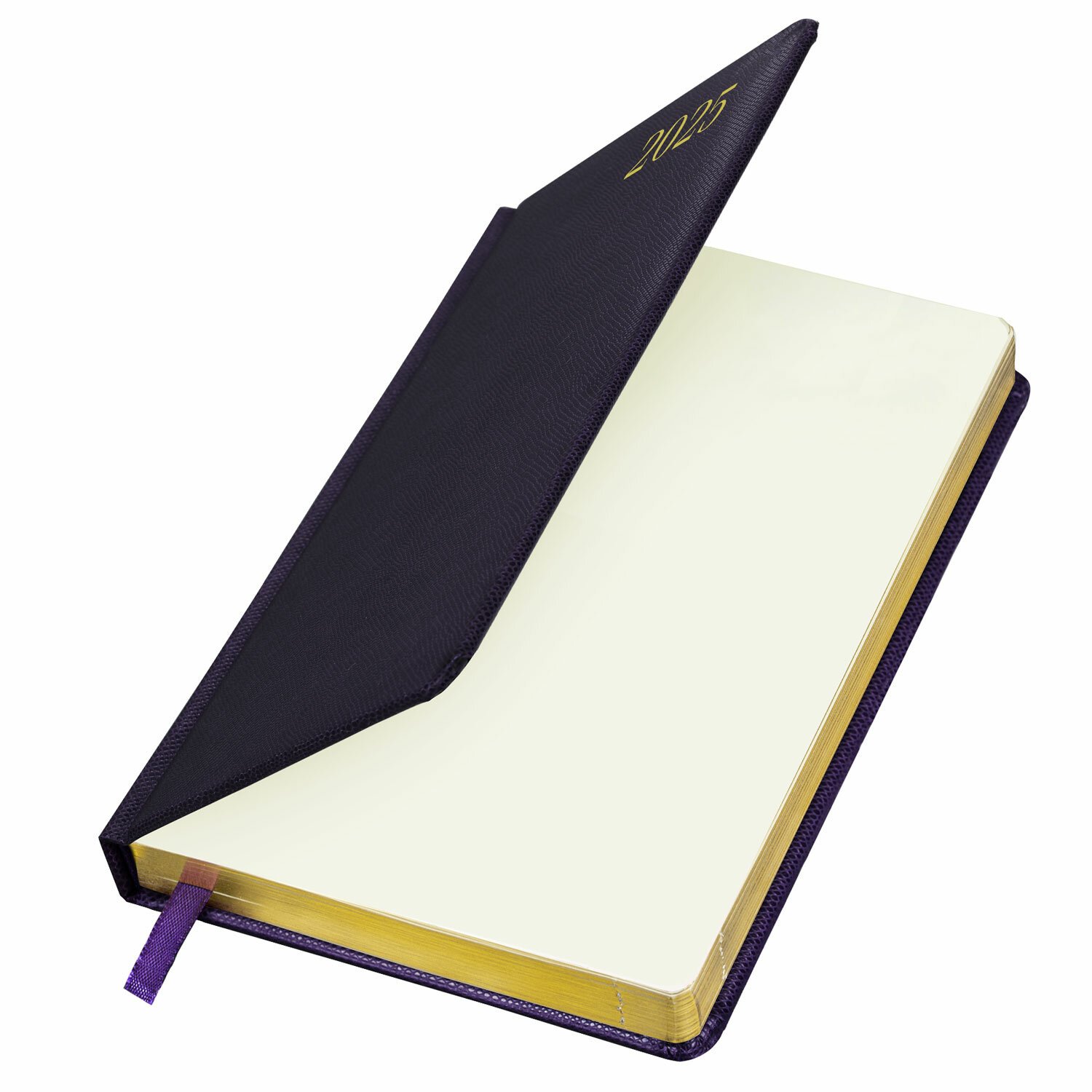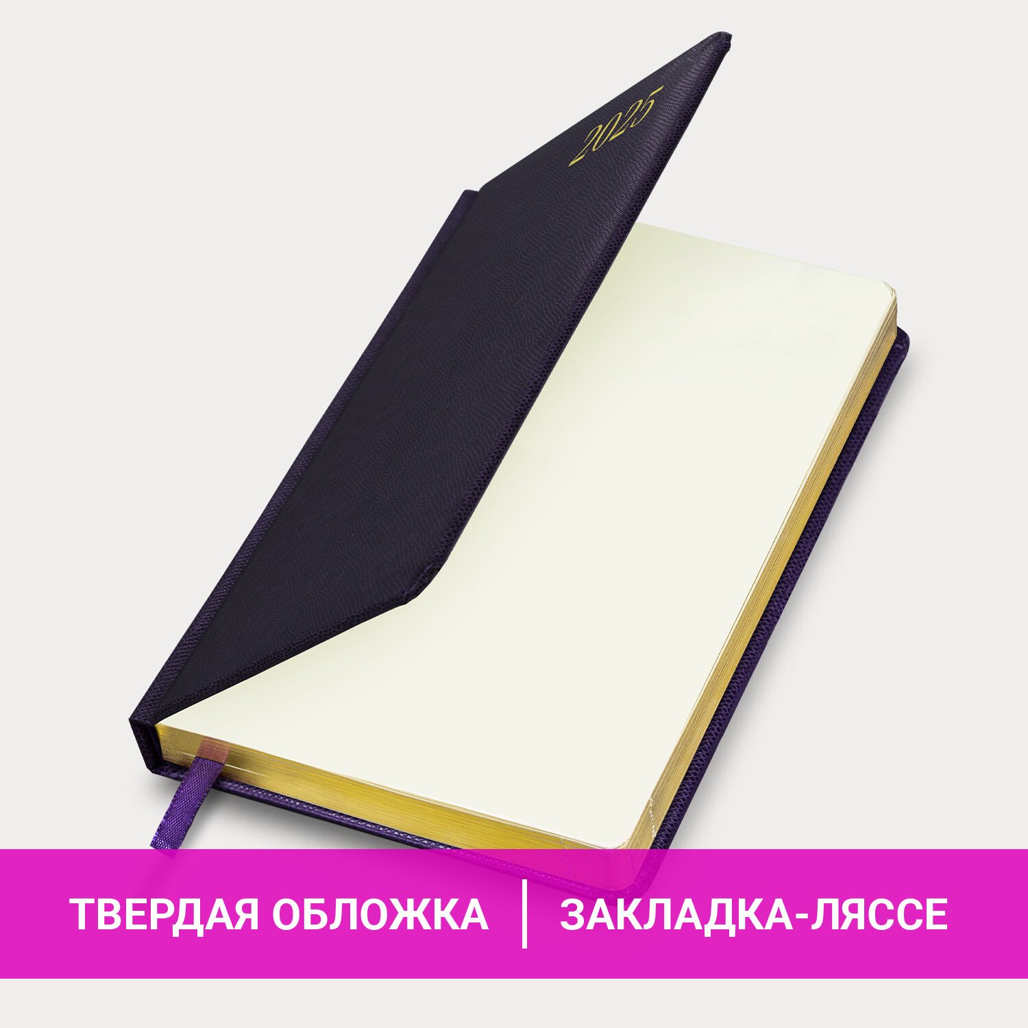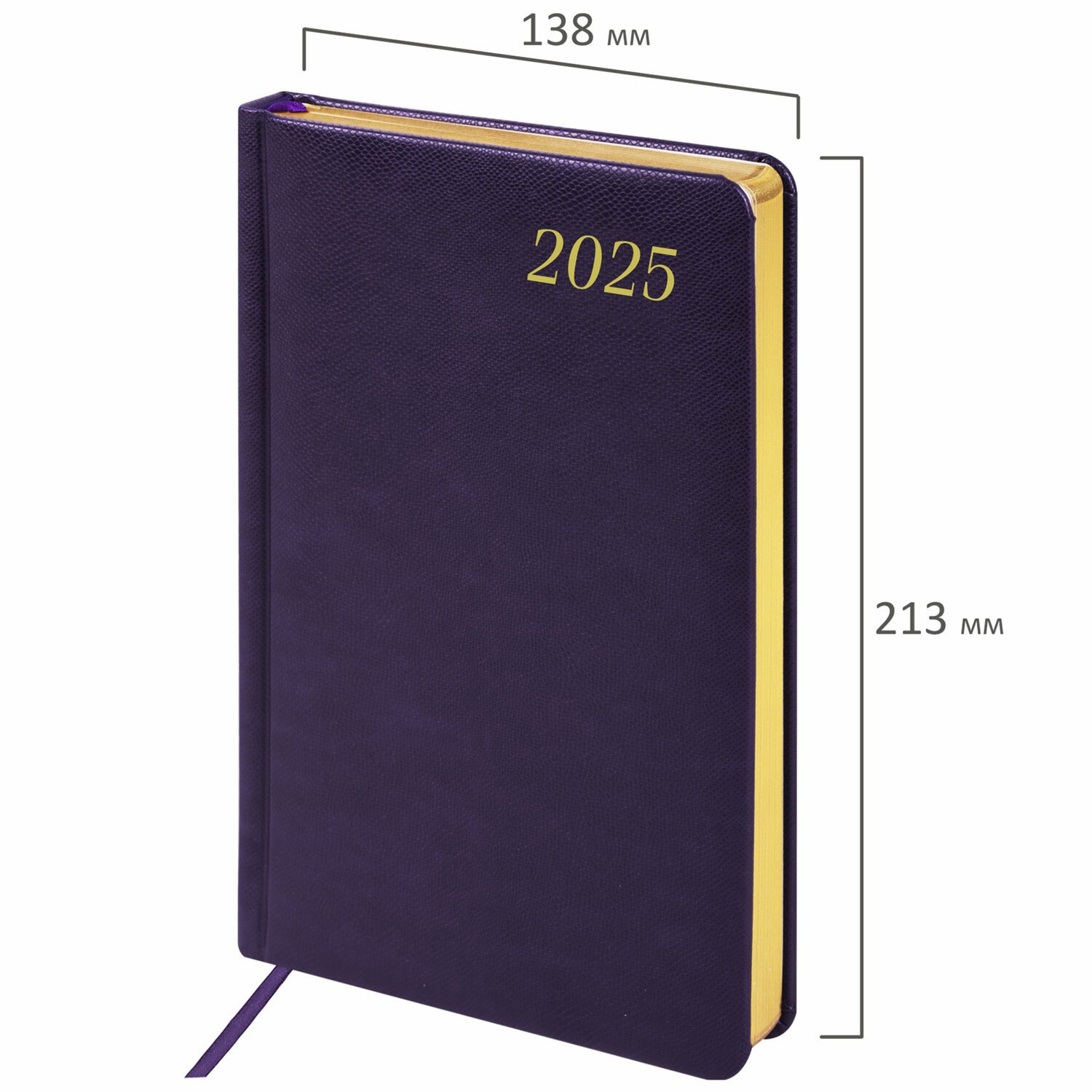 Внутренний блок включает 168 листов тонированной бумаги плотностью 70 г/м2. Каждая страничка имеет перфорированный угол. Благодаря стандартному формату А5 (138х213 мм) ежедневник удобно использовать как в офисе, так и на выездных деловых встречах. Твердая обложка стилизована под кожу рептилии благородного темно-фиолетового цвета. Подходит для горячего тиснения. Срез ежедневника фольгирован золотой фольгой, что придает ему особый шарм. Дополнением является закладка-ляссе, с помощью которой при необходимости можно быстро открыть ежедневник на нужной странице.