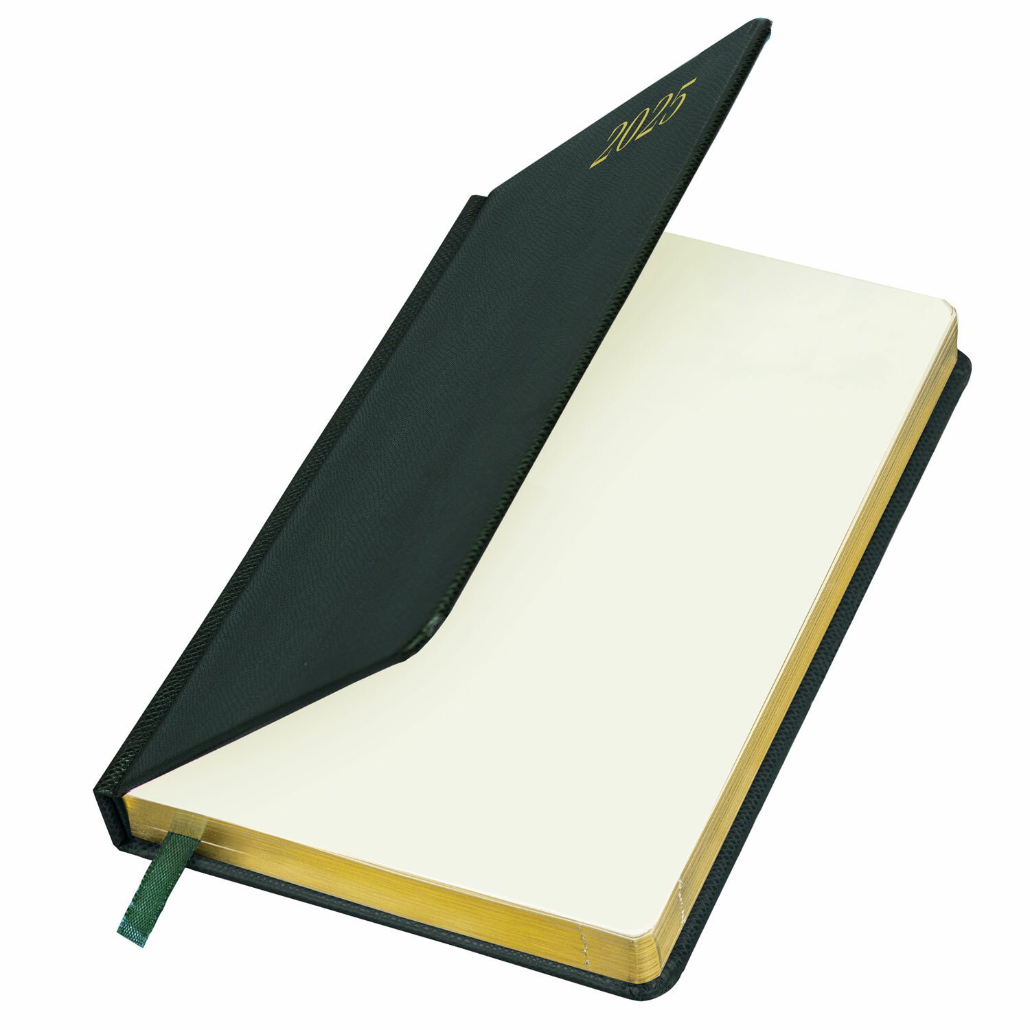 Внутренний блок включает 168 листов тонированной бумаги плотностью 70 г/м2. Каждая страничка имеет перфорированный угол. Благодаря стандартному формату А5 (138х213 мм) ежедневник удобно использовать как в офисе, так и на выездных деловых встречах. Твердая обложка стилизована под кожу рептилии благородного темно-зеленого цвета. Подходит для горячего тиснения. Срез ежедневника фольгирован золотой фольгой, что придает ему особый шарм. Дополнением является закладка-ляссе, с помощью которой при необходимости можно быстро открыть ежедневник на нужной странице.