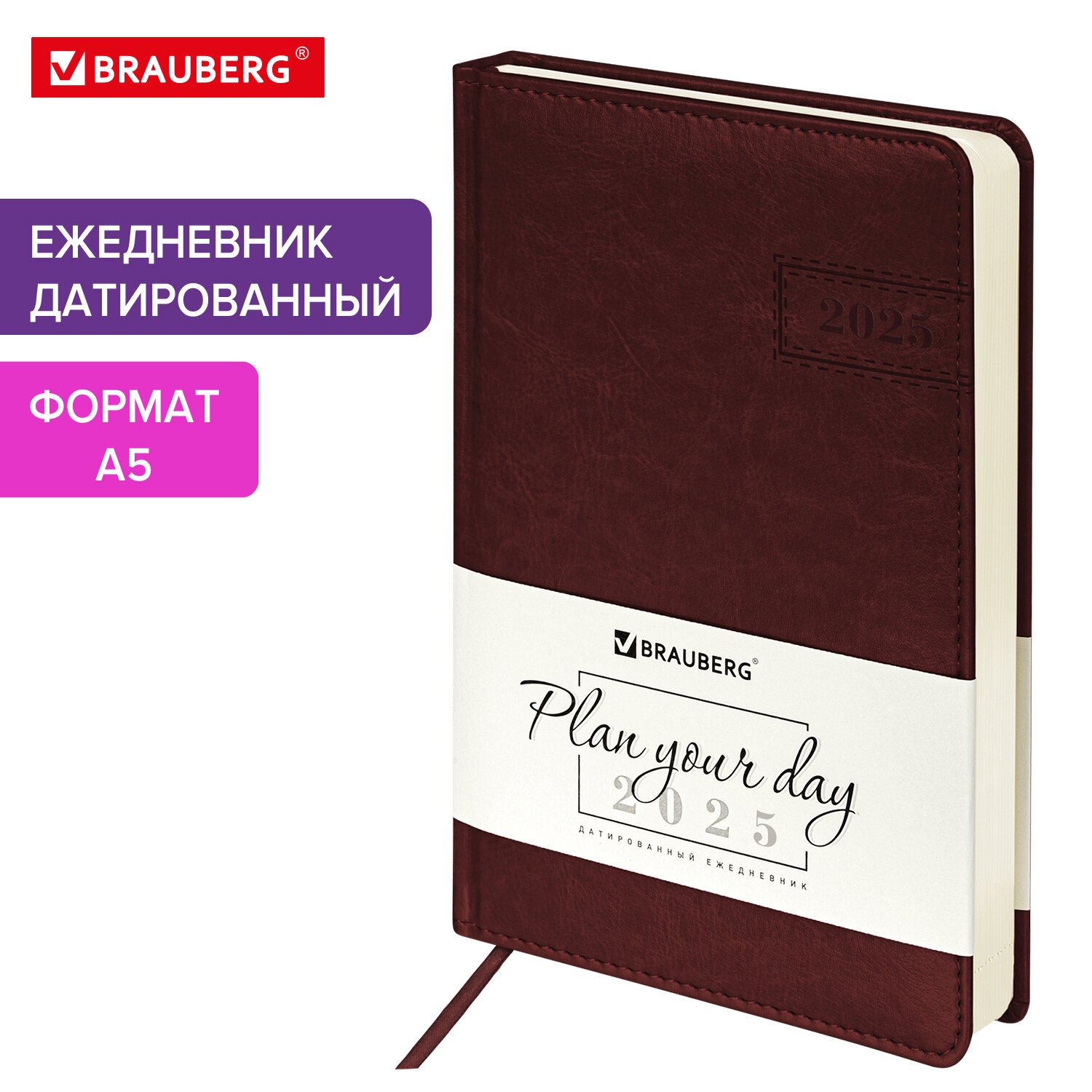 Ежедневник датированный 2025, А5, 138x213 мм, BRAUBERG "Imperial", под кожу, коричневый, 115786
