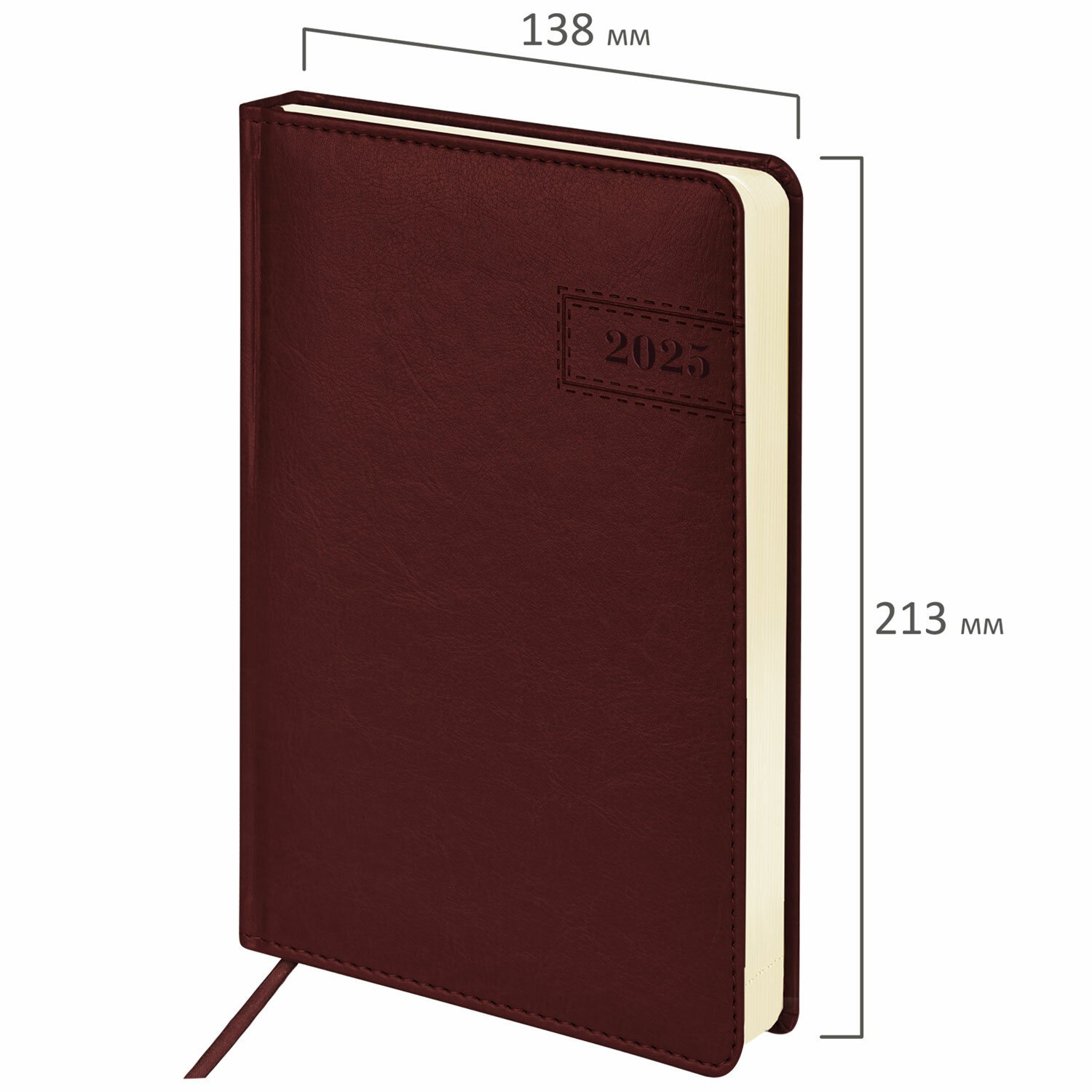 Внутренний блок включает 168 листов тонированной бумаги плотностью 70 г/м2. Каждая страничка имеет перфорированный угол. Благодаря стандартному формату А5 (138х213 мм) датированный ежедневник удобно использовать как в офисе, так и на выездных деловых встречах. Твердая обложка стилизована под гладкую кожу классического коричневого цвета. Материал обложки подходит для горячего тиснения. Дополнением является закладка-ляссе, с помощью которой при необходимости можно быстро открыть ежедневник на нужной странице.