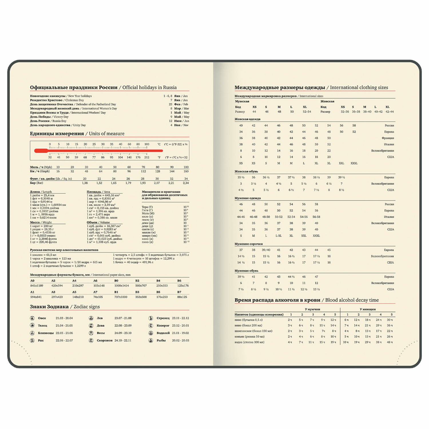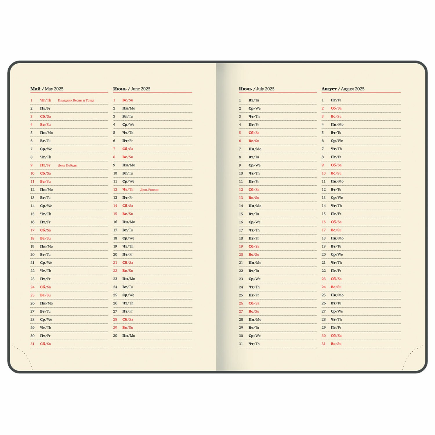 Внутренний блок включает 168 листов кремовой бумаги плотностью 70 г/м2. Каждая страничка имеет перфорированный угол. Благодаря стандартному формату А5 (138х213 мм) ежедневник удобно использовать как в офисе, так и на выездных деловых встречах.