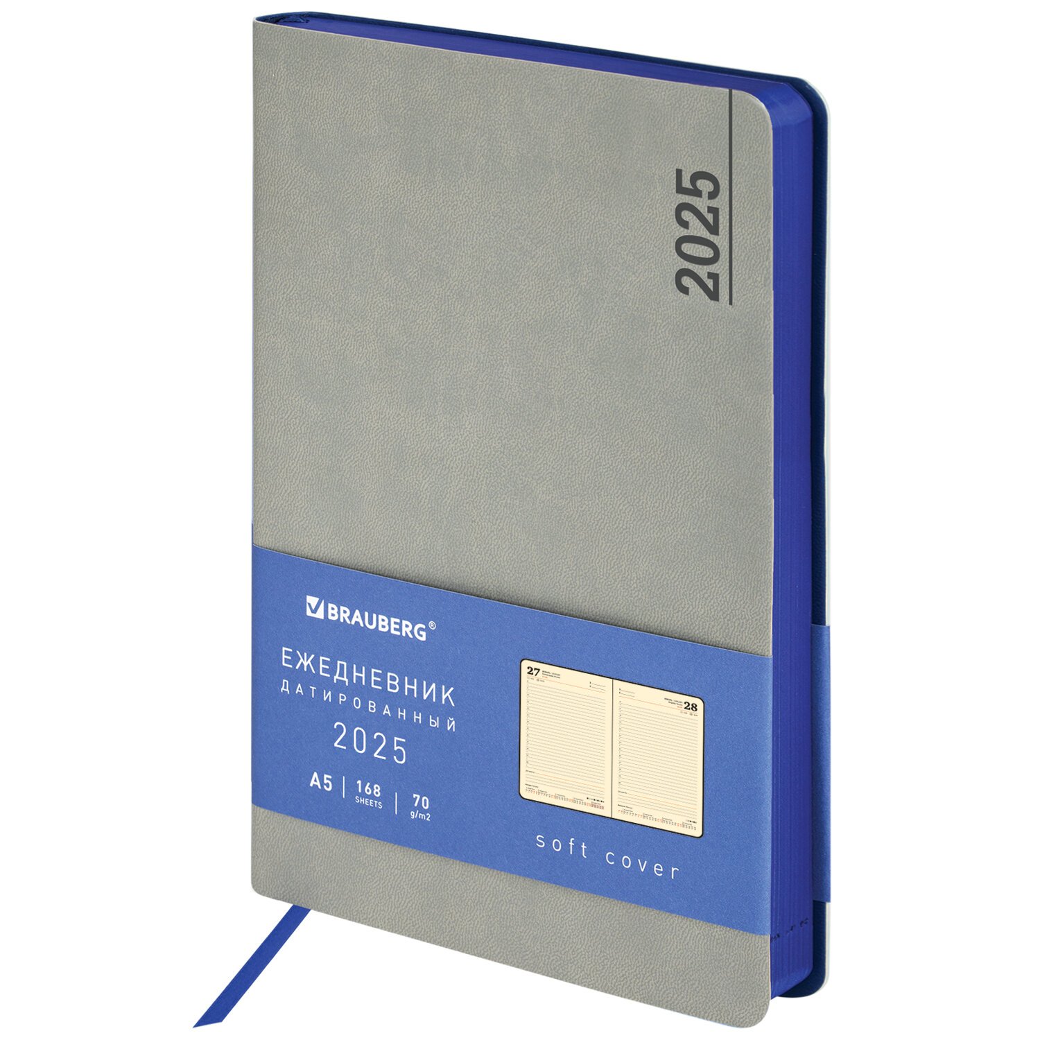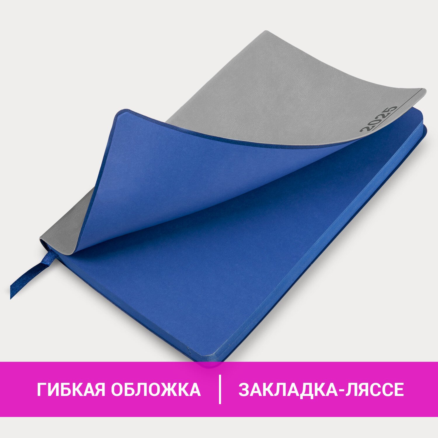 Мягкая интегральная обложка стилизована под гладкую кожу классического серого цвета. Материал обложки подходит для горячего тиснения. Срез и форзац ежедневника окрашены в контрастный с обложкой цвет, что придает изделию особый шарм. Дополнением является закладка-ляссе, с помощью которой при необходимости можно быстро открыть ежедневник на нужной странице. Ежедневник снабжен обширным справочным материалом. В конце имеются 4 страницы для записей и заметок.