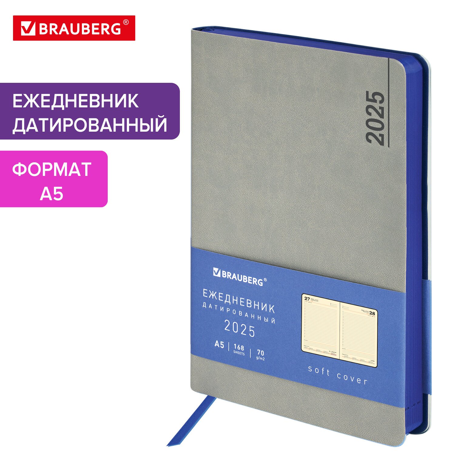 Ежедневник датированный 2025, А5, 138x213 мм, BRAUBERG "Metropolis Mix", под кожу гибкий, серый, 115862