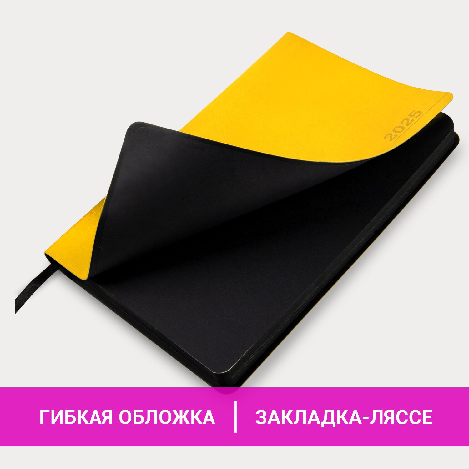Мягкая интегральная обложка стилизована под гладкую кожу неординарного желтого цвета. Материал обложки подходит для горячего тиснения. Срез и форзац ежедневника окрашены в контрастный с обложкой цвет, что придает изделию особый шарм. Дополнением является закладка-ляссе, с помощью которой при необходимости можно быстро открыть ежедневник на нужной странице. Ежедневник снабжен обширным справочным материалом. В конце имеются 4 страницы для записей и заметок.