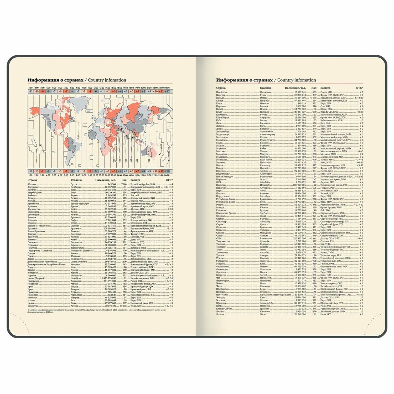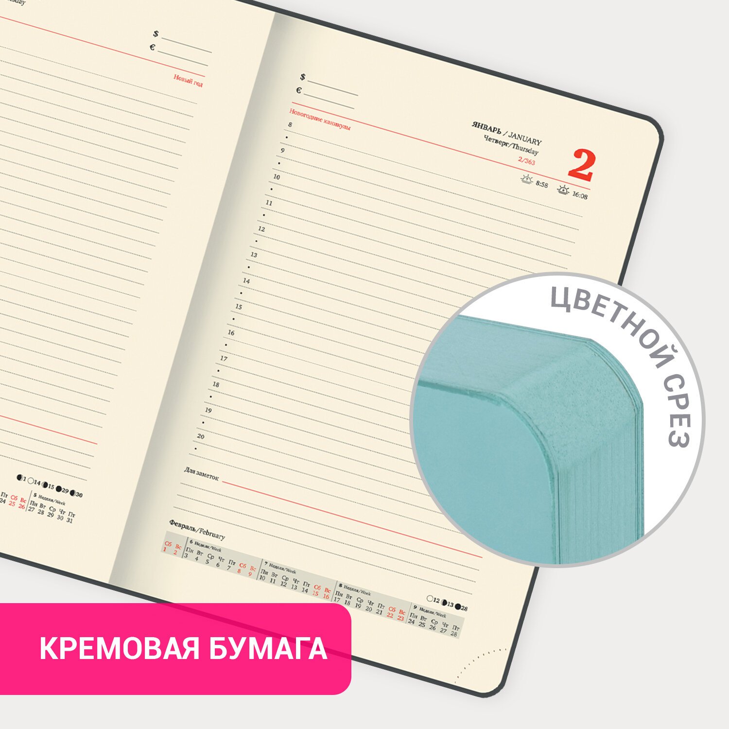 Внутренний блок включает 168 листов кремовой бумаги плотностью 70 г/м2. Каждая страничка имеет перфорированный угол. Благодаря стандартному формату А5 (138х213 мм) ежедневник удобно использовать как в офисе, так и на выездных деловых встречах.