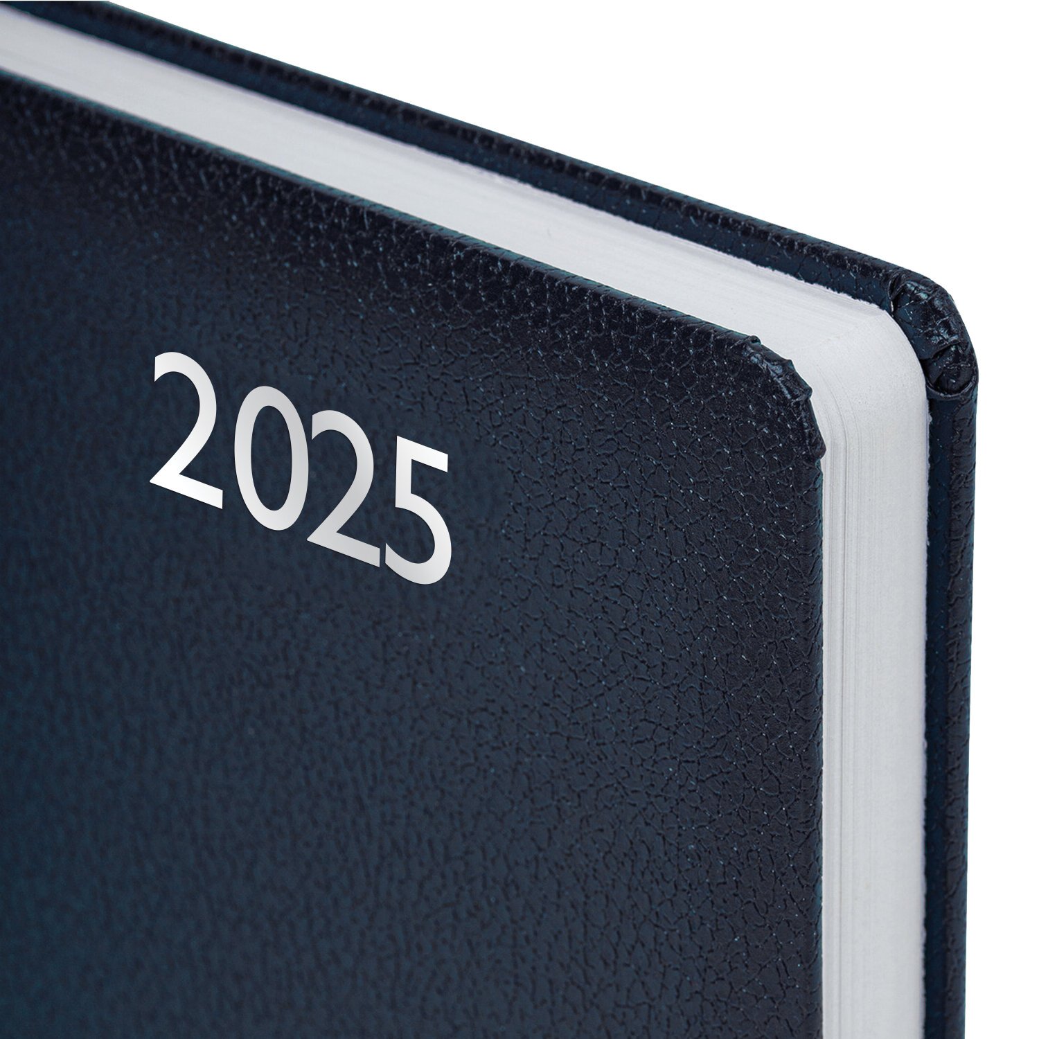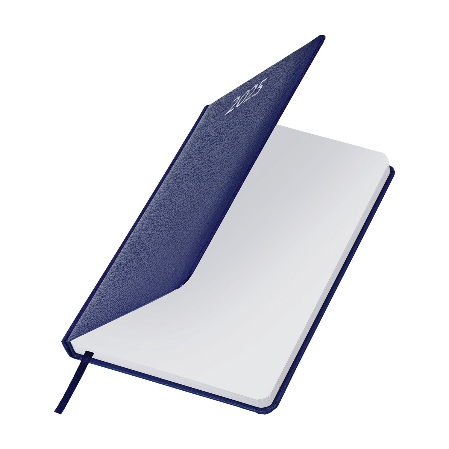 Внутренний блок включает 168 листов белой бумаги плотностью 70 г/м2. Каждая страничка имеет перфорированный угол. Благодаря стандартному формату А5 (138х213 мм) ежедневник удобно использовать как в офисе, так и на выездных деловых встречах. Жесткая книжная обложка с легкой рельефной фактурой напоминает натуральную кожу благородного синего цвета. Материал обложки – балакрон, подходит для тиснения только фольгой.
