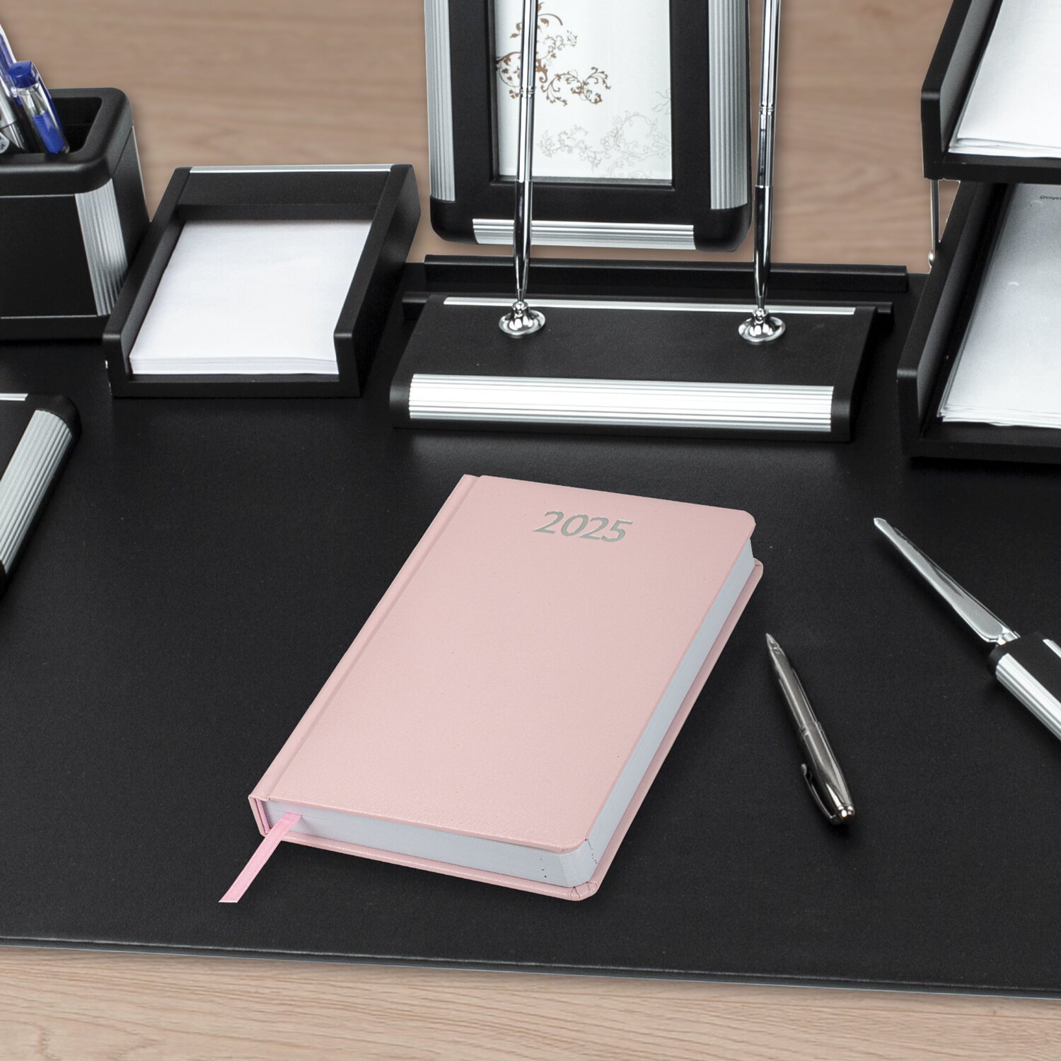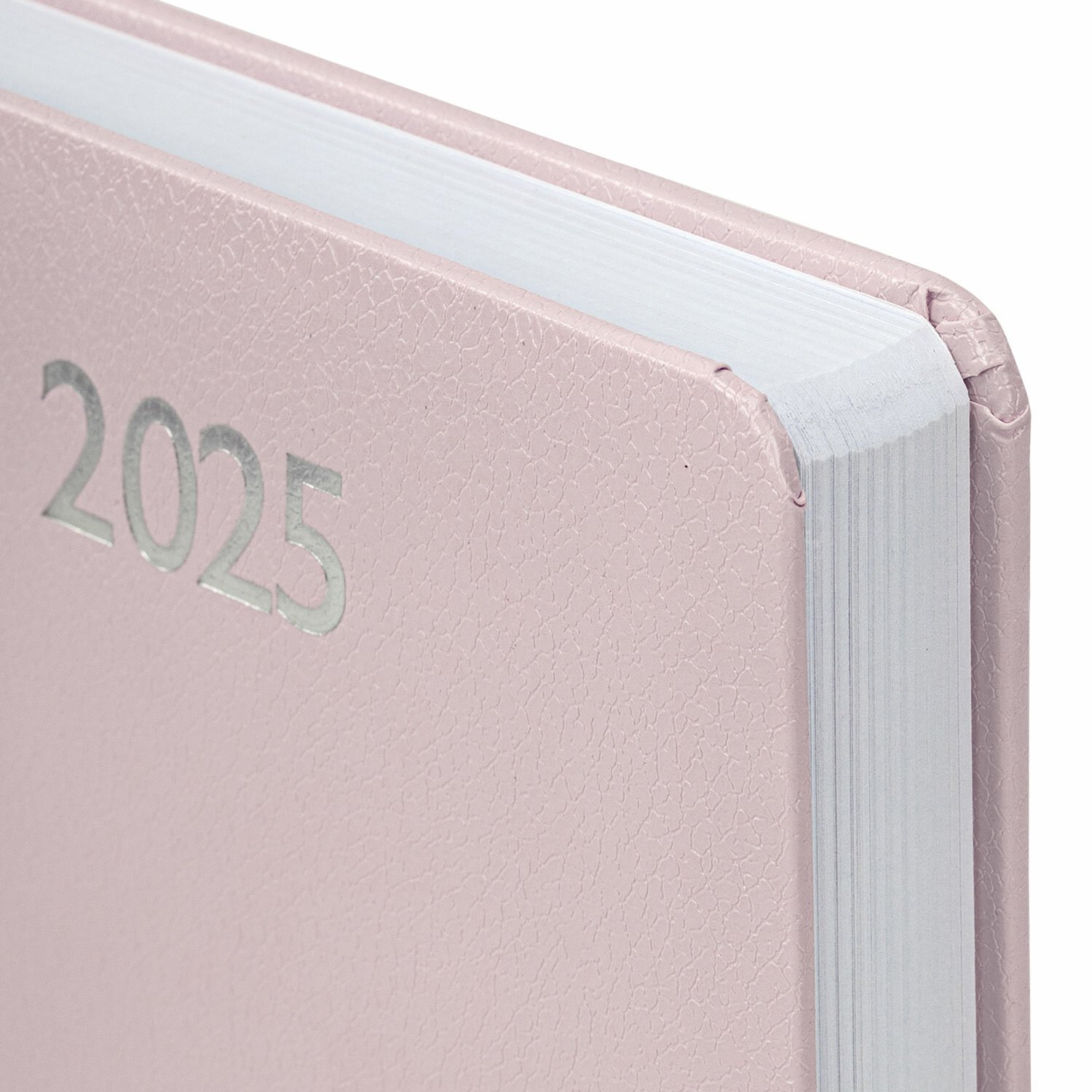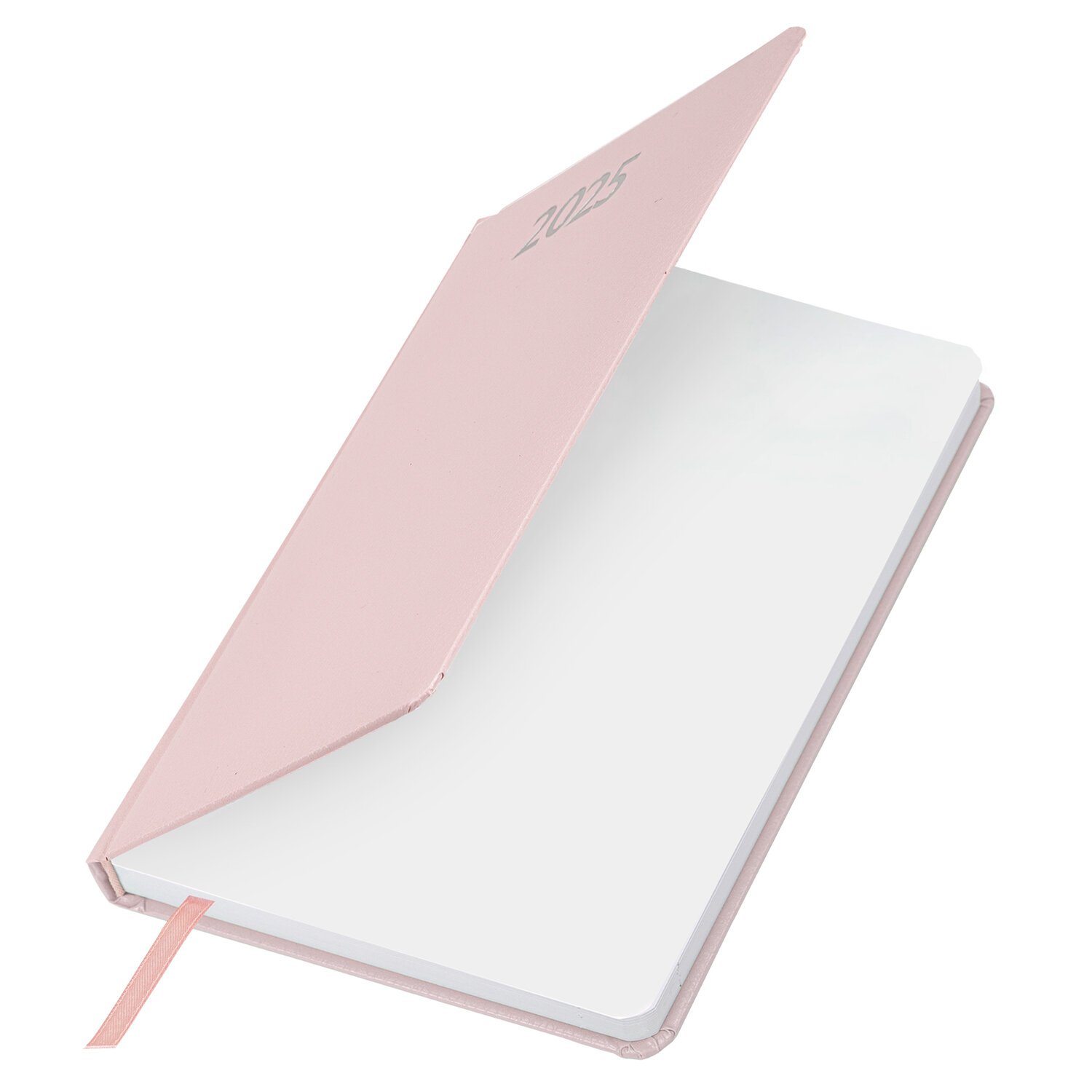 Внутренний блок включает 168 листов белой бумаги плотностью 70 г/м2. Каждая страничка имеет перфорированный угол. Благодаря стандартному формату А5 (138х213 мм) ежедневник удобно использовать как в офисе, так и на выездных деловых встречах. Жесткая книжная обложка с легкой рельефной фактурой напоминает натуральную кожу нежного светло-розового цвета. Материал обложки – балакрон, подходит для тиснения только фольгой.