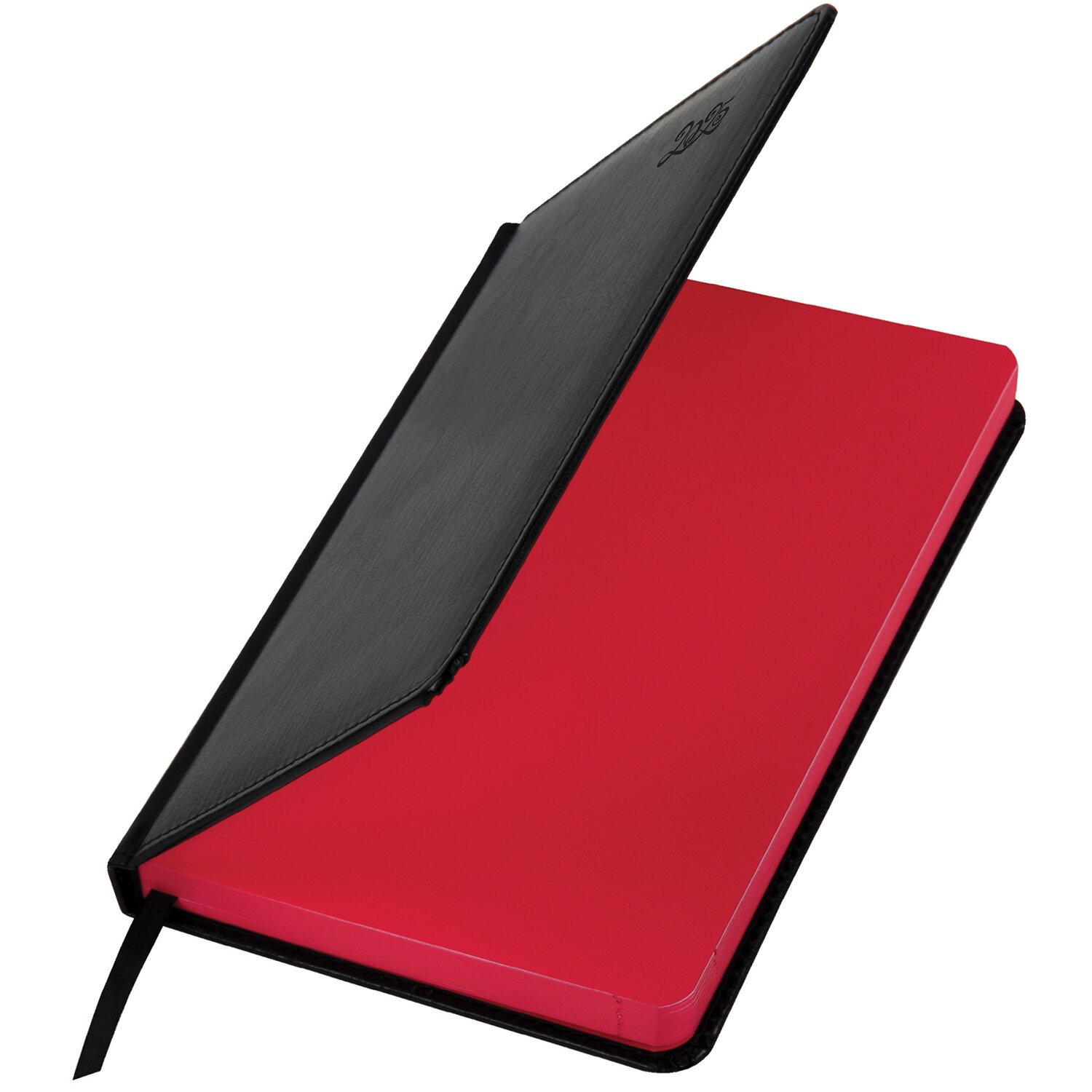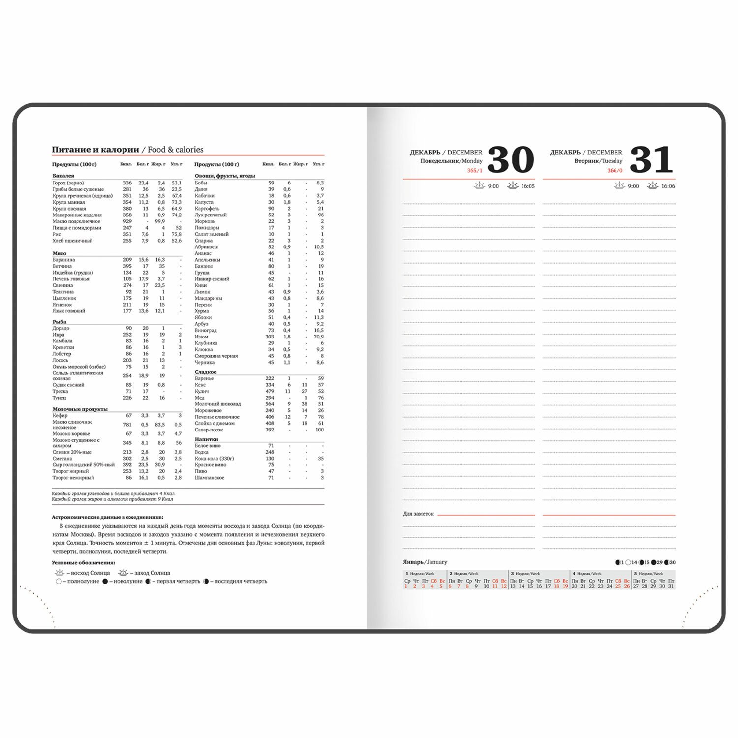 Твердая обложка стилизована под гладкую кожу насыщенного черного цвета. Подходит для горячего тиснения. Срез и форзац ежедневника окрашены на контрасте с цветом обложки, что придает ему особый шарм. Дополнением является закладка-ляссе, с помощью которой при необходимости можно быстро открыть ежедневник на нужной странице. Помимо прочего, ежедневник снабжен обширным справочным материалом. В конце имеются 4 страницы для записей и заметок.
