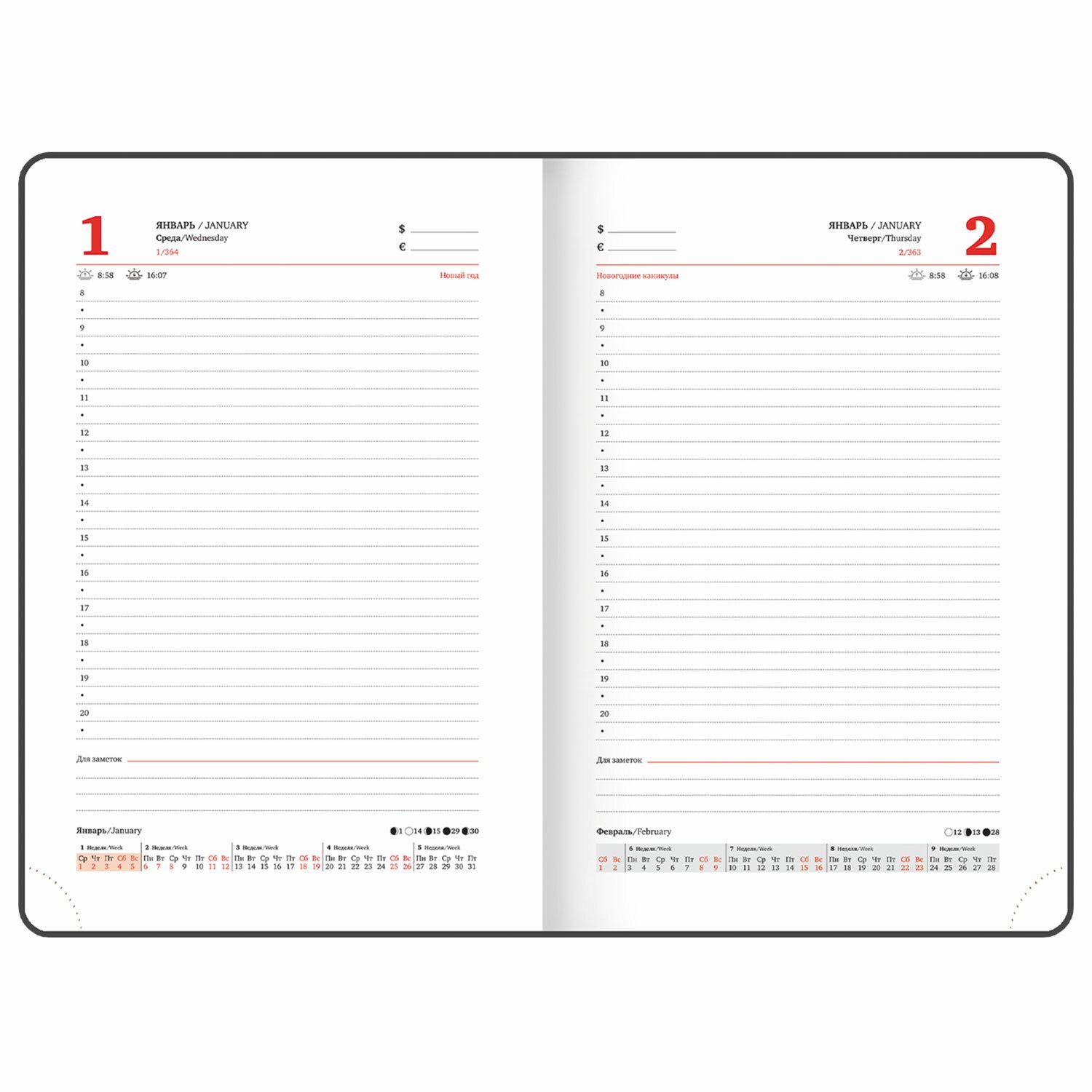 Внутренний блок включает 168 листов белой бумаги плотностью 70 г/м2. Каждая страничка имеет перфорированный угол. Благодаря стандартному формату А5 (138х213 мм) ежедневник удобно использовать как в офисе, так и на выездных деловых встречах.