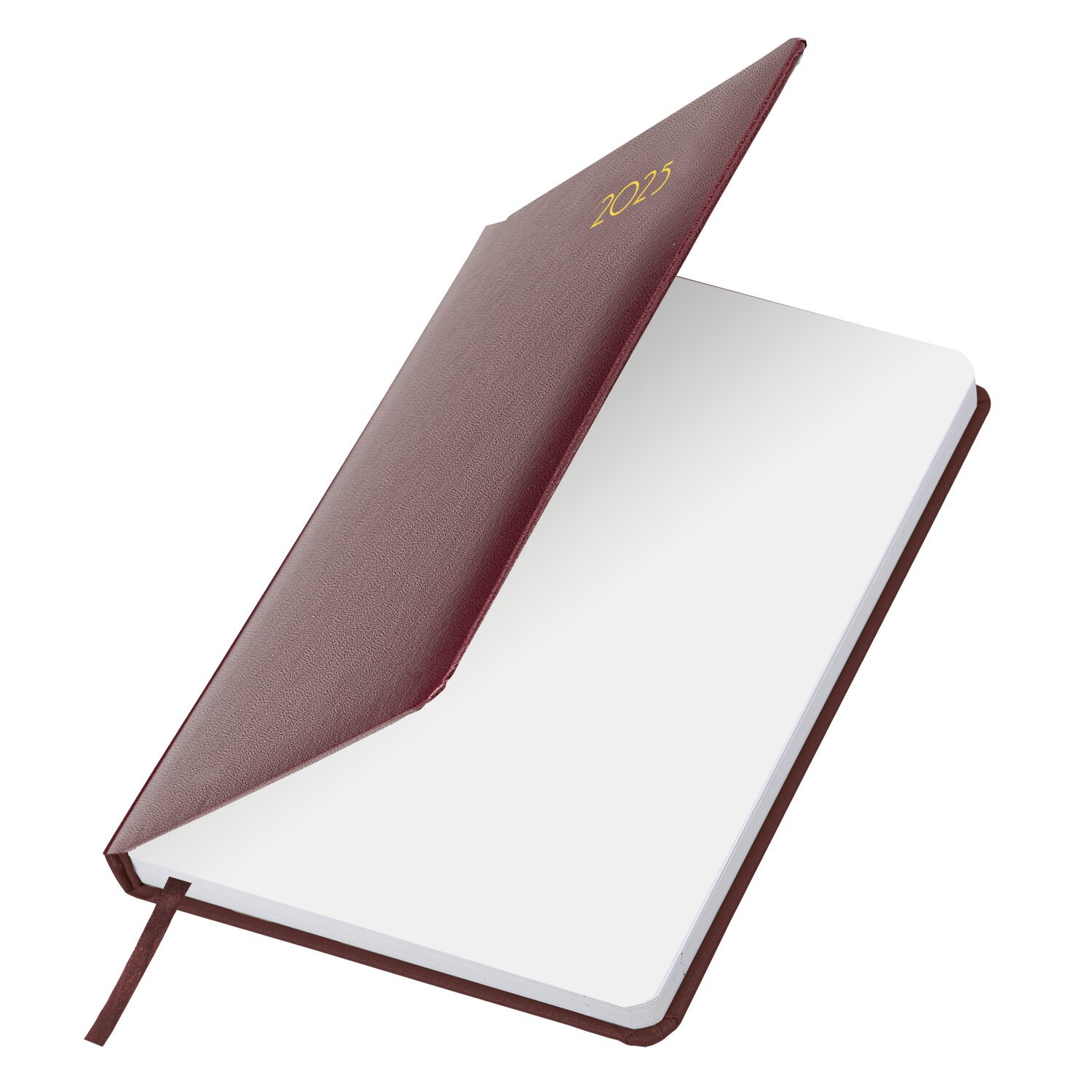 Жесткая книжная обложка благородного бордового цвета с легкой рельефной фактурой напоминает натуральную кожу. Материал обложки – балакрон, подходит для тиснения только фольгой. Дополнением является закладка-ляссе, с помощью которой при необходимости можно быстро открыть ежедневник на нужной странице. Помимо прочего, ежедневник снабжен обширным справочным материалом. В конце имеются 4 страницы для записей и заметок.