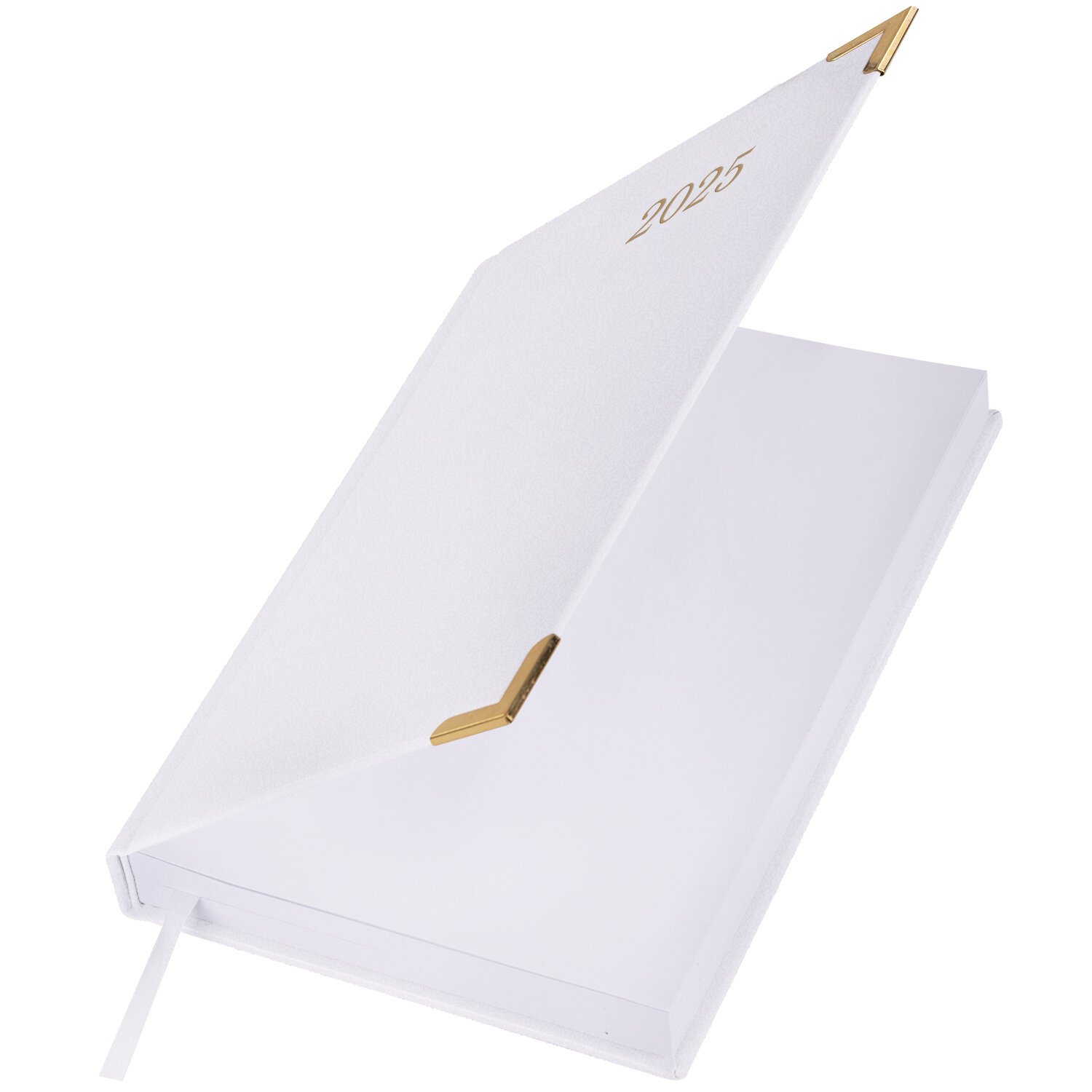 Твердая обложка классического белого цвета стилизована под гладкую кожу. Подходит для горячего тиснения. Ежедневник имеет металлические уголки, что придает ему особый шарм. Дополнением является закладка-ляссе, с помощью которой при необходимости можно быстро открыть ежедневник на нужной странице. Помимо прочего, ежедневник снабжен обширным справочным материалом. В конце имеются 4 страницы для записей и заметок.
