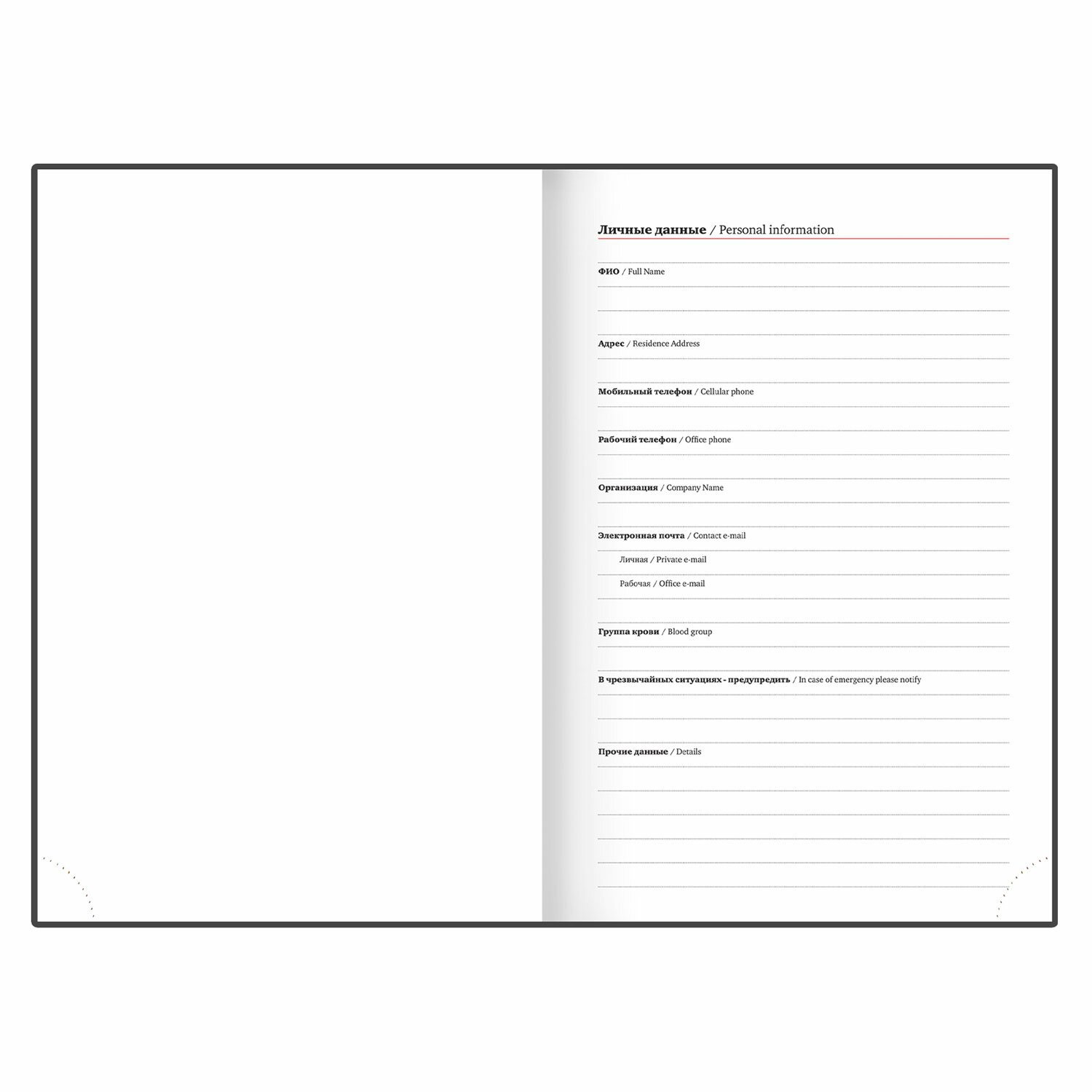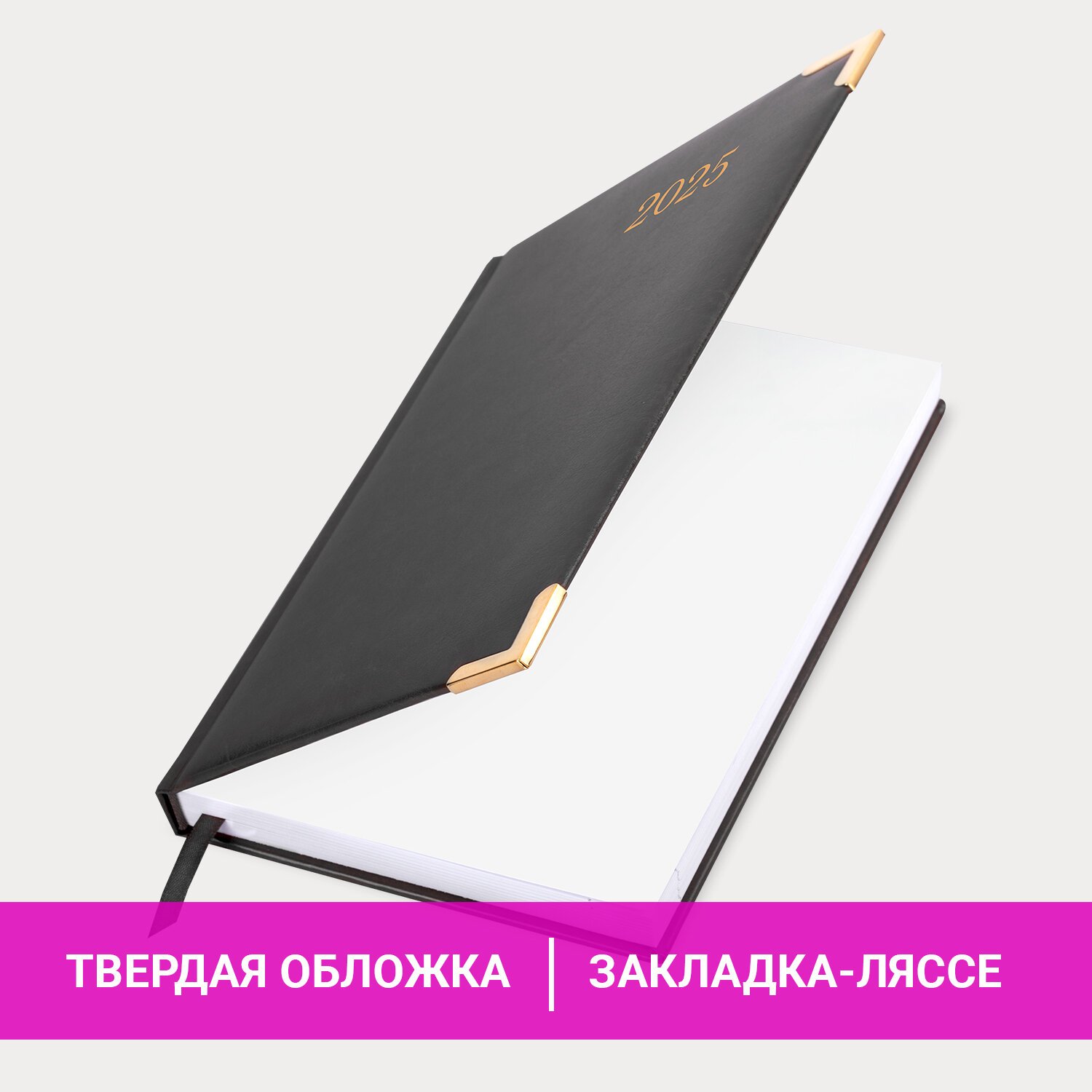 Твердая обложка классического черного цвета, стилизованная под гладкую кожу. Подходит для горячего тиснения. Ежедневник имеет металлические уголки, что придает ему особый шарм. Дополнением является закладка-ляссе, с помощью которой при необходимости можно быстро открыть ежедневник на нужной странице. Помимо прочего, ежедневник снабжен обширным справочным материалом. В конце имеются 4 страницы для записей и заметок.