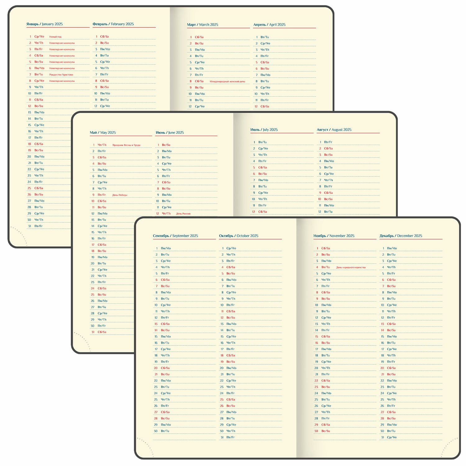 Дополнением является закладка-ляссе, с помощью которой при необходимости можно быстро открыть ежедневник на нужной странице, а также вырубка по месяцам. Помимо прочего, ежедневник снабжен обширным справочным материалом. В конце ежедневника есть 6 страниц для записей и заметок. Выполнен в фиолетовом цвете.