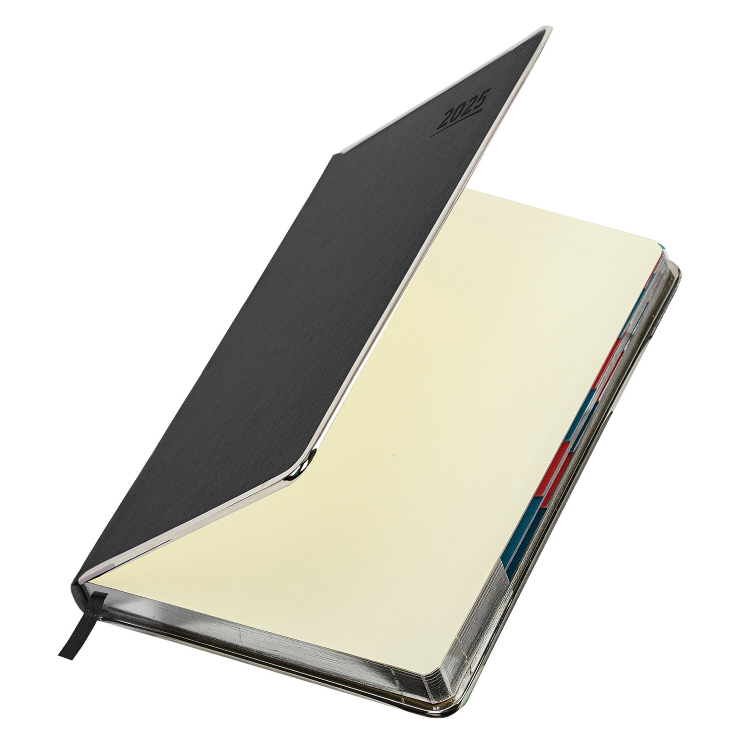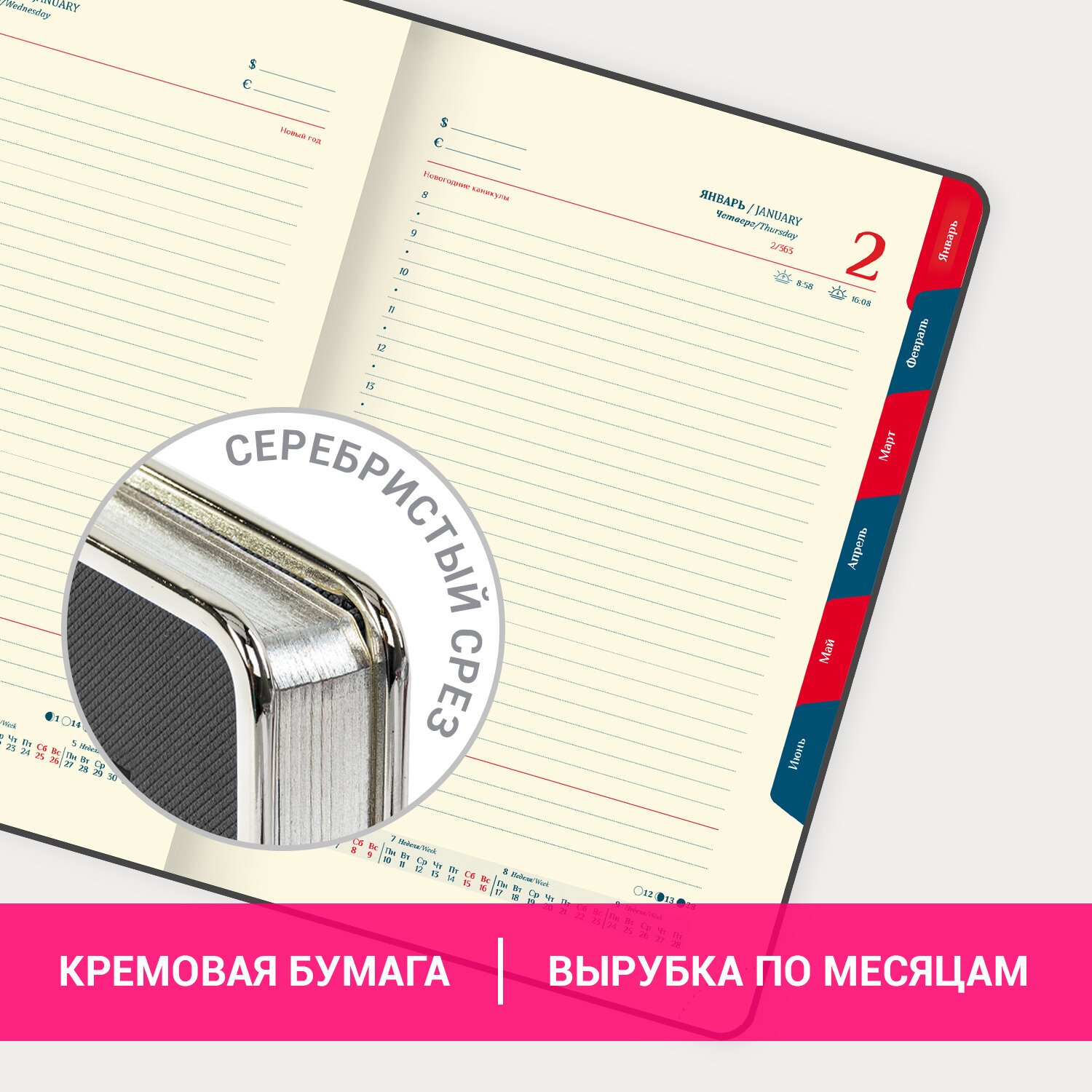 Внутренний блок включает 168 листов тонированной бумаги цвета "слоновая кость" плотностью 70 г/м2. Каждая страничка имеет перфорированный угол. Благодаря стандартному формату А5 (148х218 мм) ежедневник удобно использовать как в офисе, так и на выездных деловых встречах. Твердая обложка выполнена под кожу с отделкой из металлических накладок, что увеличивает ее износоустойчивость. Срез ежедневника покрыт серебряной фольгой в цвет металлических накладок, и это придает ему особый шарм. Материал обложки подходит для горячего тиснения.