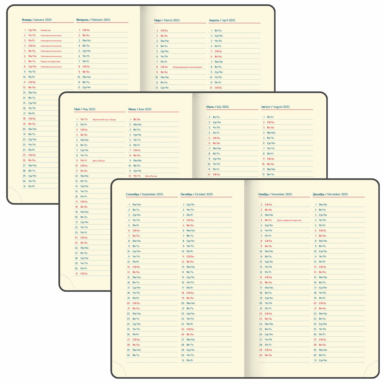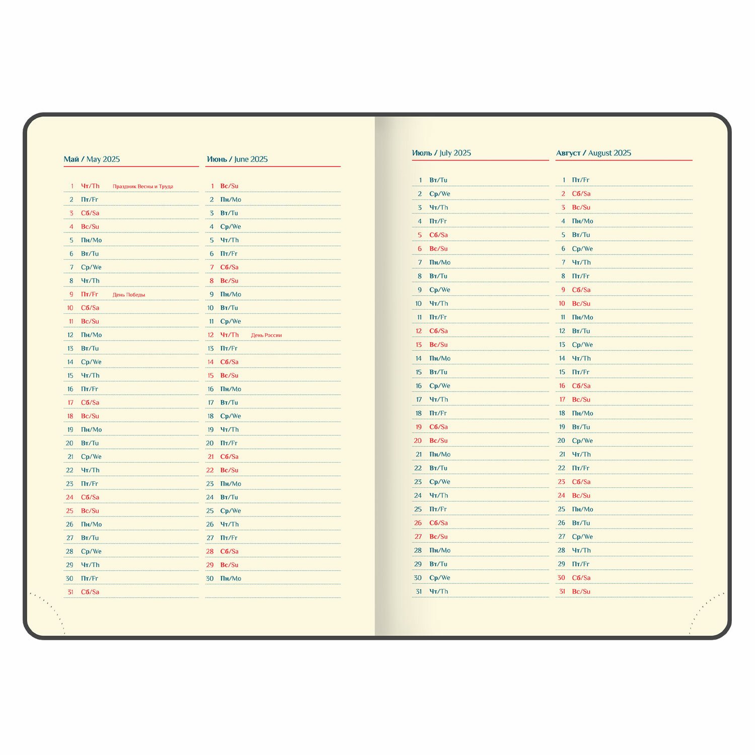 Дополнением является закладка-ляссе, с помощью которой при необходимости можно быстро открыть ежедневник на нужной странице, а также вырубка по месяцам. Помимо прочего, ежедневник снабжен обширным справочным материалом. В конце ежедневника есть 6 страниц для записей и заметок. Выполнен в сером цвете.
