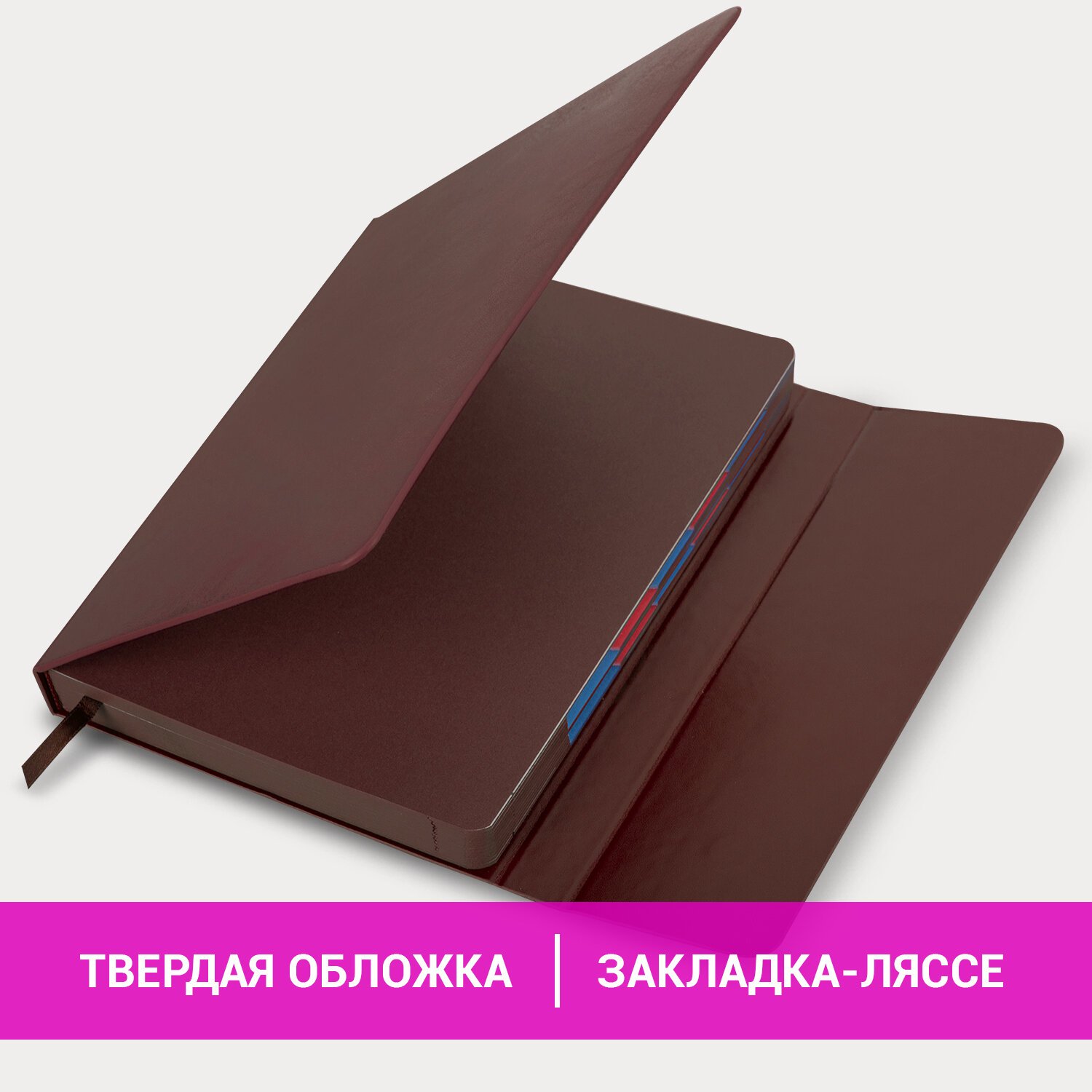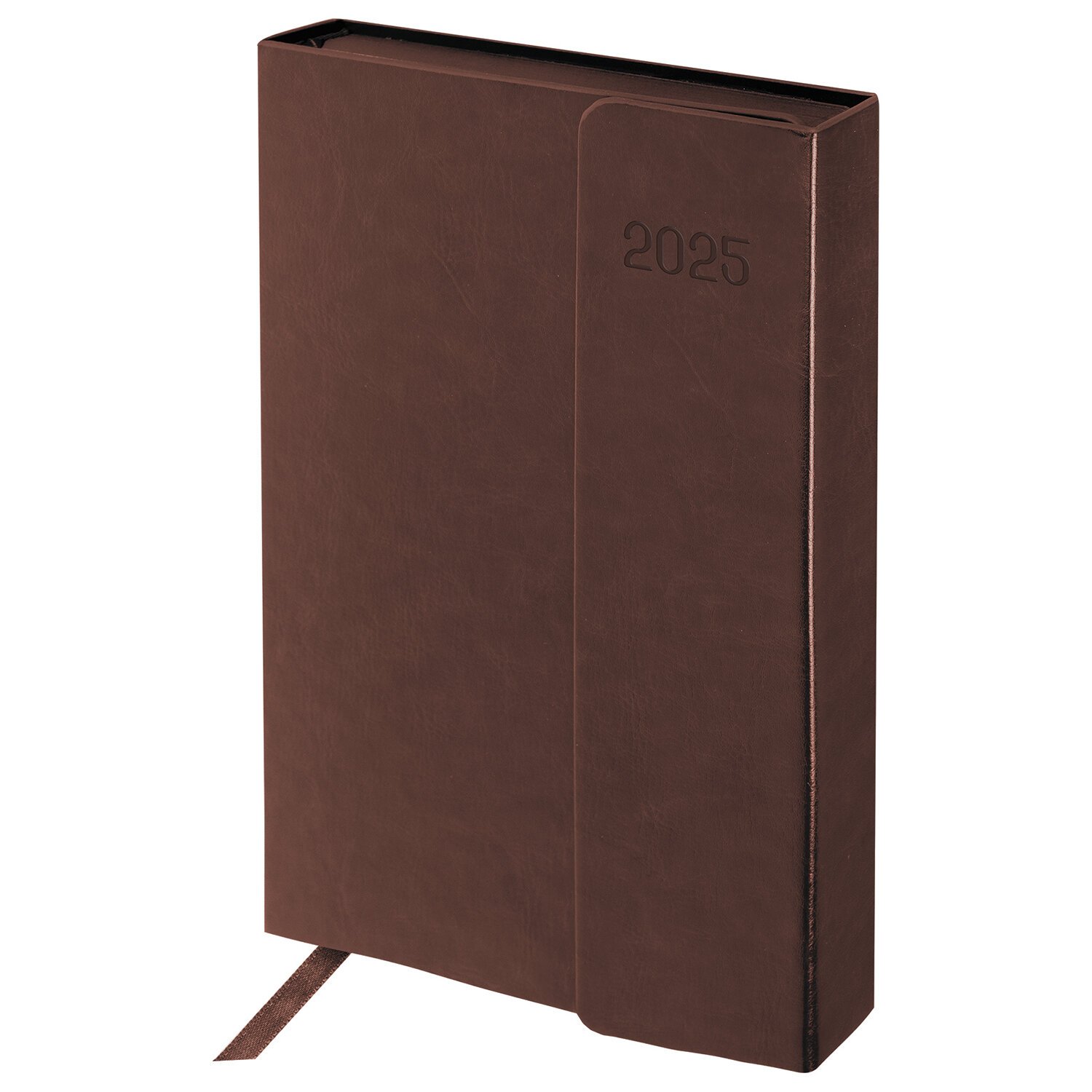 Внутренний блок включает 168 листов тонированной бумаги плотностью 70 г/м2. Каждая страничка имеет перфорированный угол. Благодаря стандартному формату А5 (148х218 мм) ежедневник удобно использовать как в офисе, так и на выездных деловых встречах. Интегральная обложка стилизована под гладкую кожу благородного коричневого цвета, фиксируется магнитным клапаном, поэтому ежедневник не откроется в сумке или портфеле и страницы не помнутся. Подходит для горячего тиснения. Срез и форзац ежедневника окрашены в цвет обложки, что придает ему особый шарм.