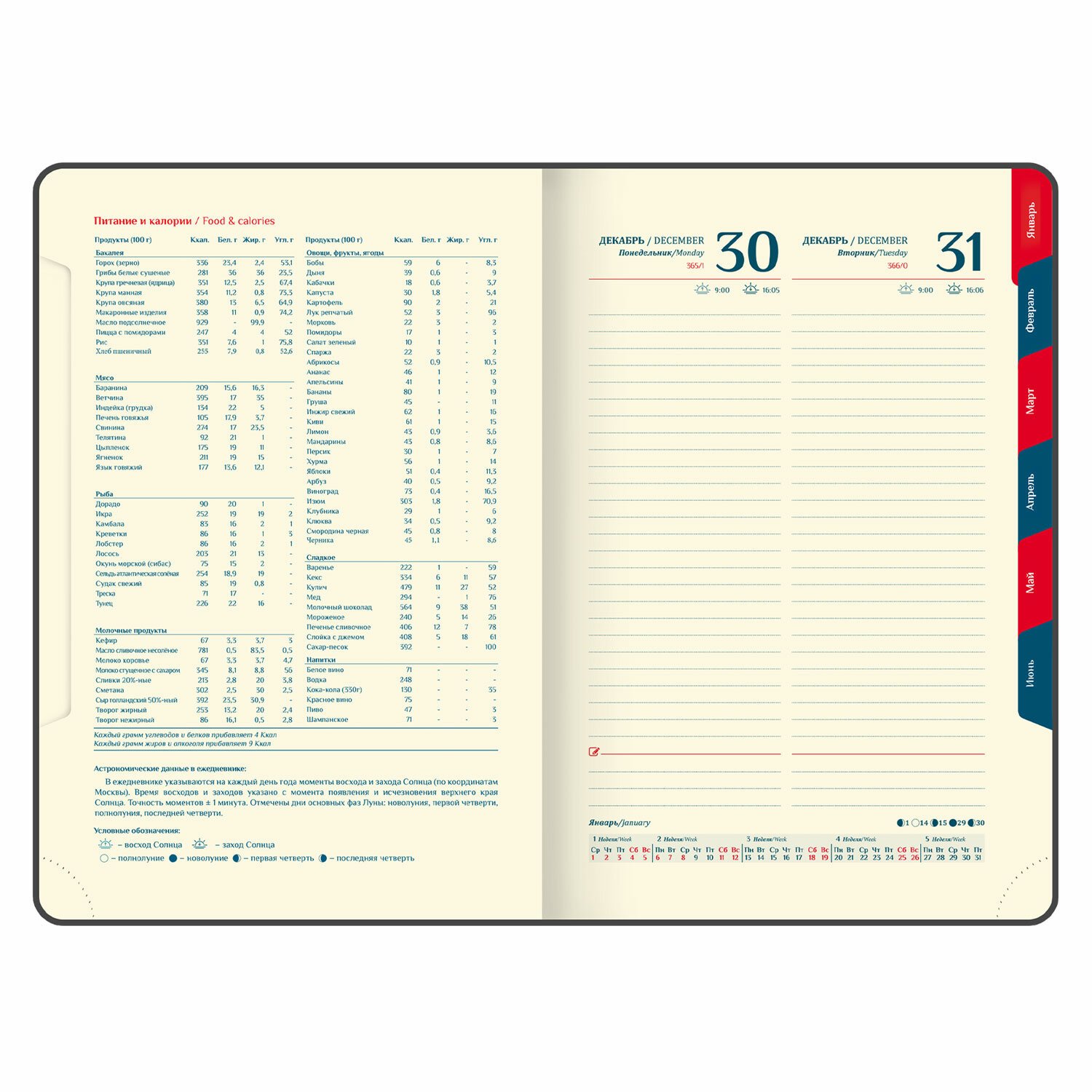 Дополнением является закладка-ляссе, с помощью которой при необходимости можно быстро открыть ежедневник на нужной странице, а также вырубка по месяцам. Помимо прочего, ежедневник снабжен обширным справочным материалом. В конце ежедневника есть 6 страниц для записей и заметок.