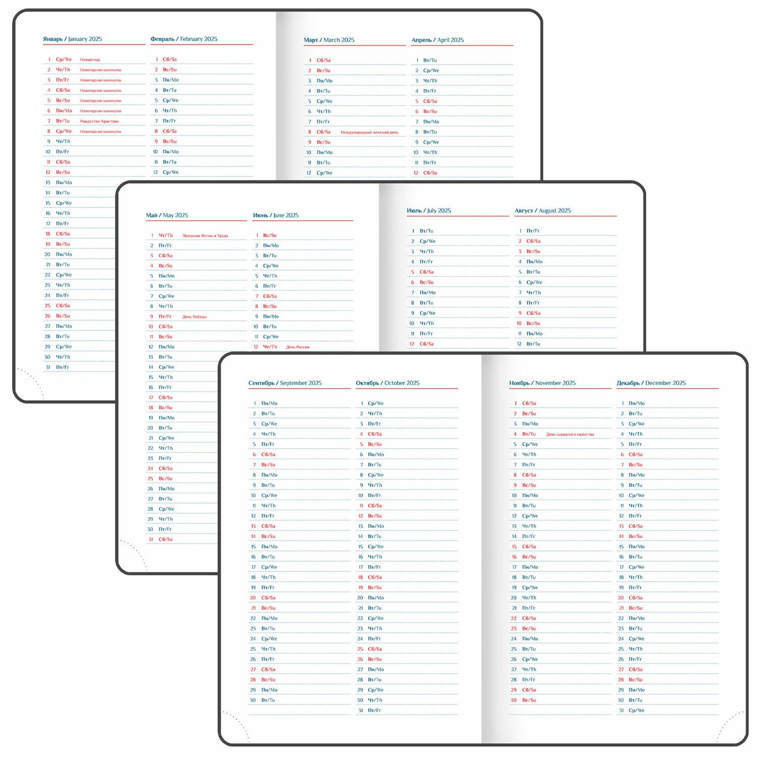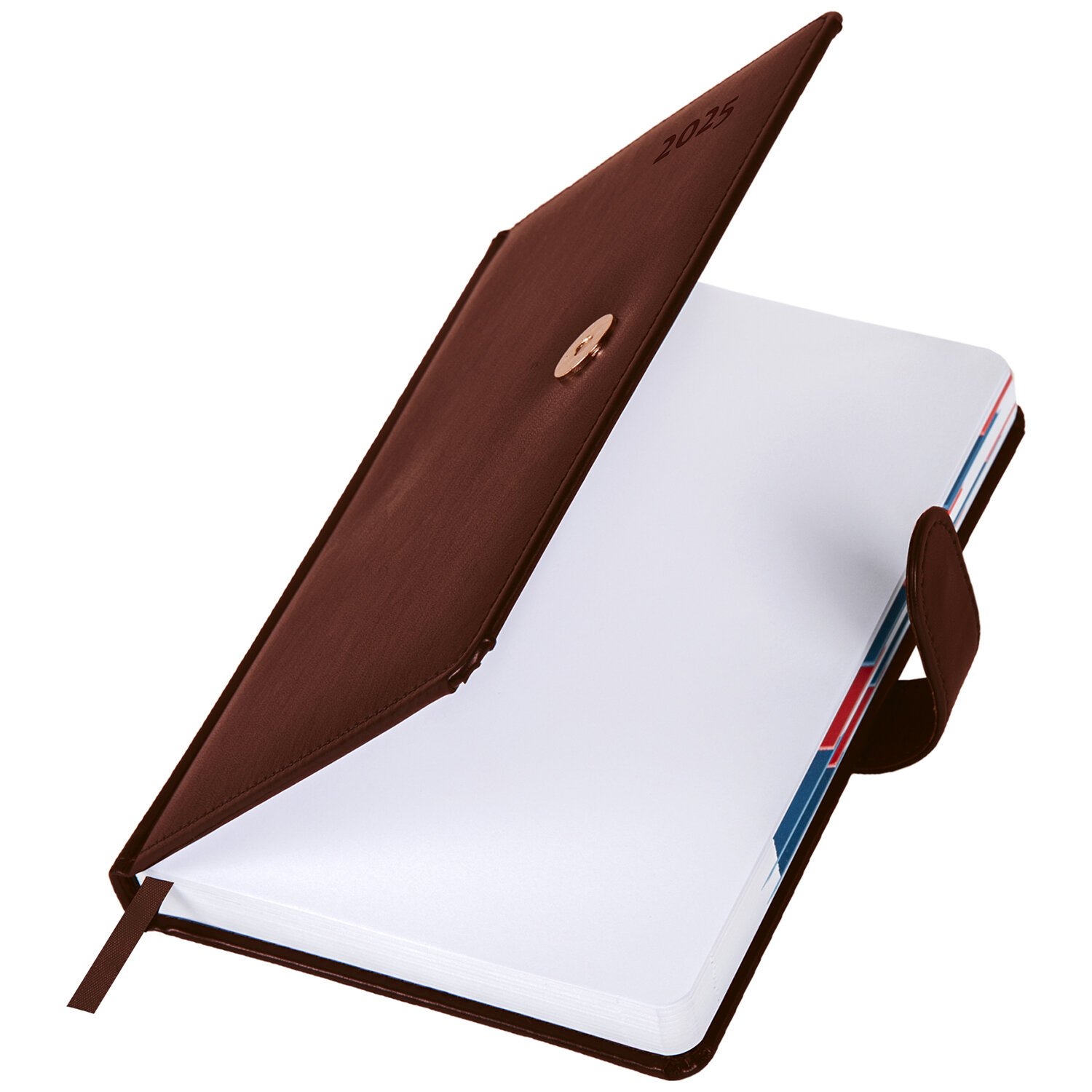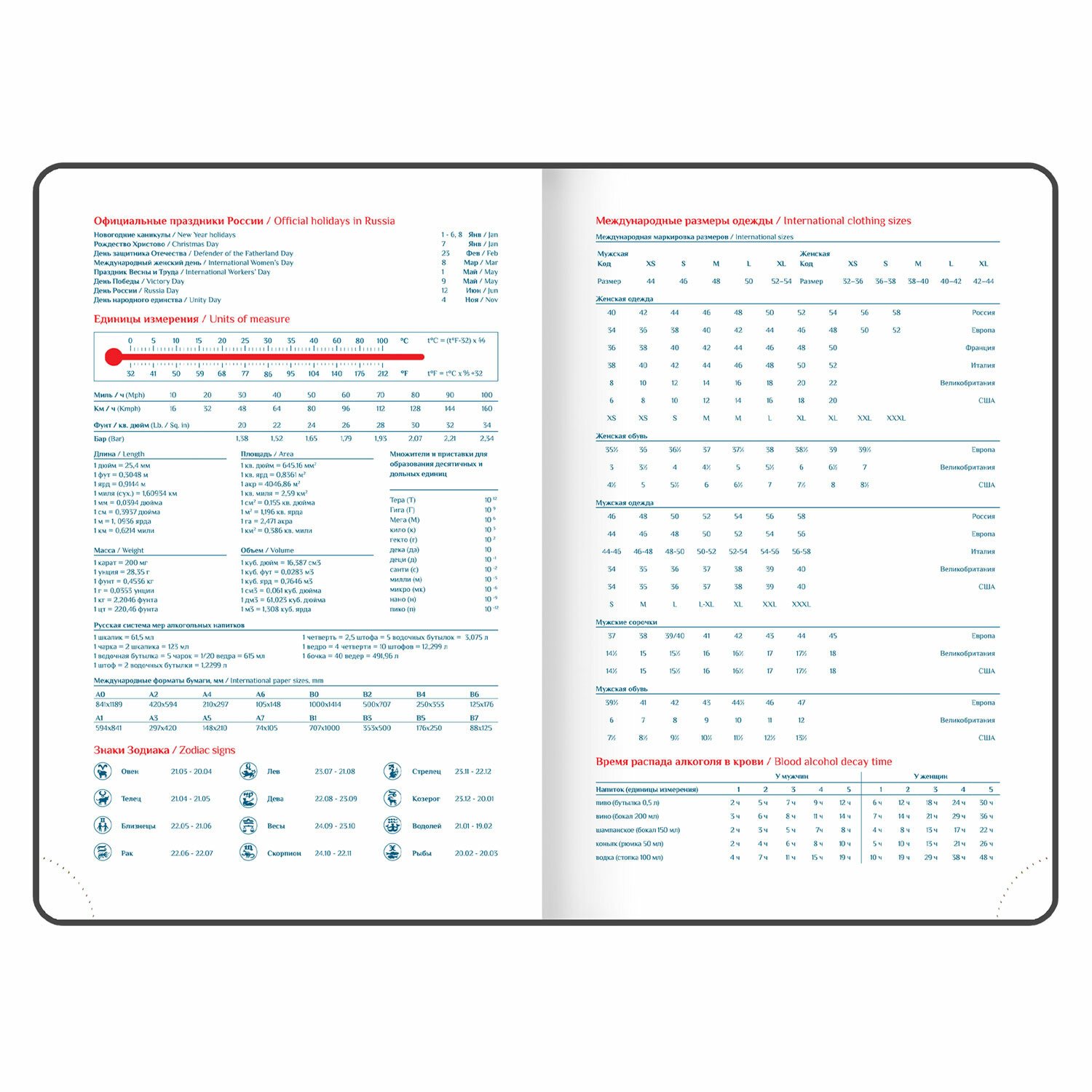 Дополнением является закладка-ляссе, с помощью которой при необходимости можно быстро открыть ежедневник на нужной странице, а также вырубка по месяцам. Помимо прочего, ежедневник снабжен обширным справочным материалом. В конце ежедневника есть 6 страниц для записей и заметок. Выполнен в благородном коричневом цвете.