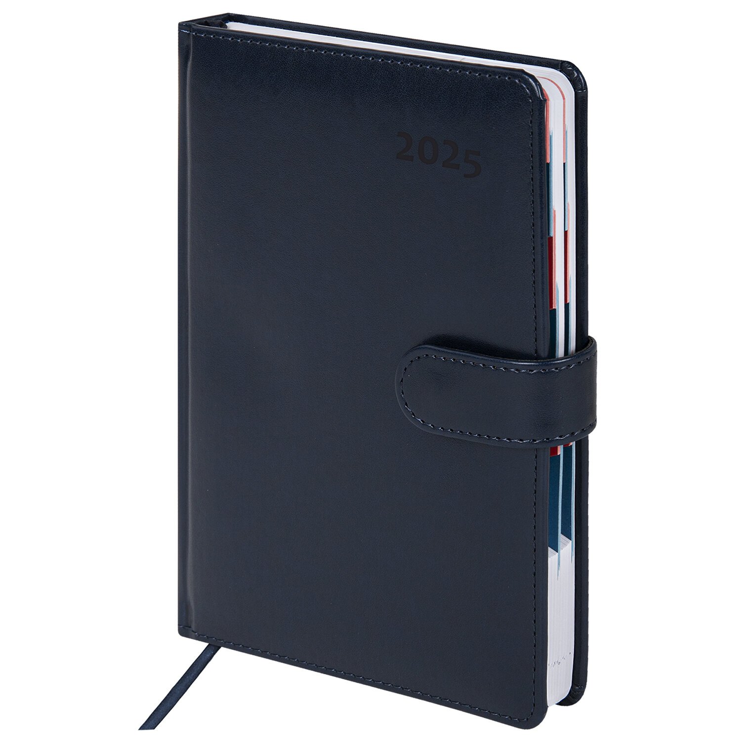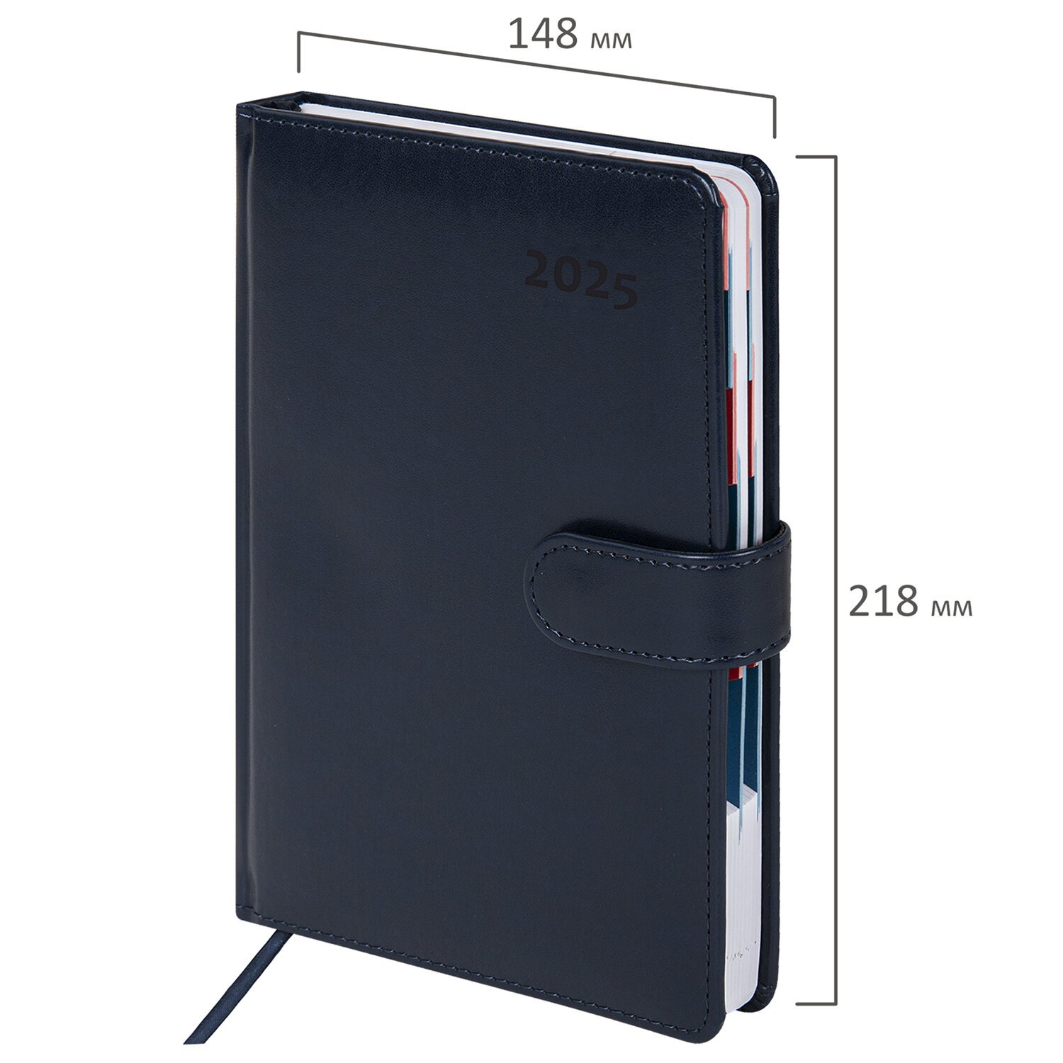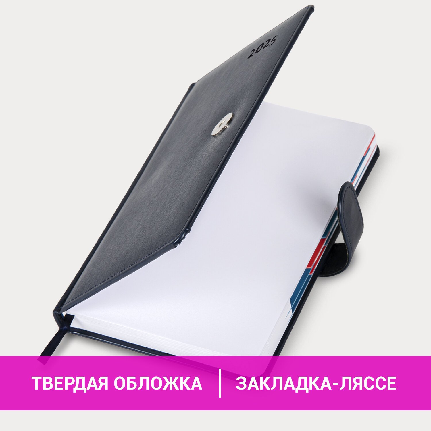 Внутренний блок включает 168 листов белой бумаги плотностью 70 г/м2. Каждая страничка имеет перфорированный угол. Благодаря стандартному формату А5 (148х218 мм) ежедневник удобно использовать как в офисе, так и на выездных деловых встречах. Твердая обложка, прошитая по периметру, стилизованная под гладкую кожу, фиксируется магнитной застежкой, поэтому ежедневник не откроется в сумке или портфеле и страницы не помнутся. Материал обложки подходит для горячего тиснения.