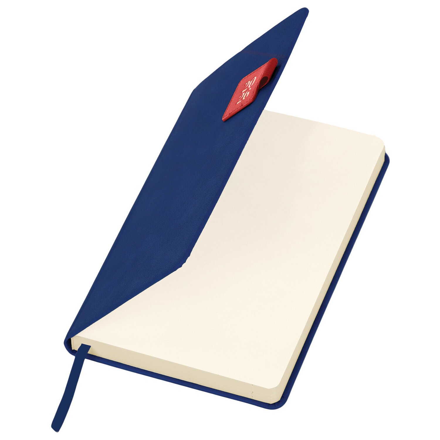 Твердая обложка стилизована под текстурную кожу и имеет интересную деталь в виде нашивки контрастного цвета. Подходит для горячего тиснения. Дополнением является закладка-ляссе, с помощью которой при необходимости можно быстро открыть ежедневник на нужной странице, и держатель для ручки. Ежедневник снабжен справочным материалом. В конце имеются 4 страницы для записей и заметок.