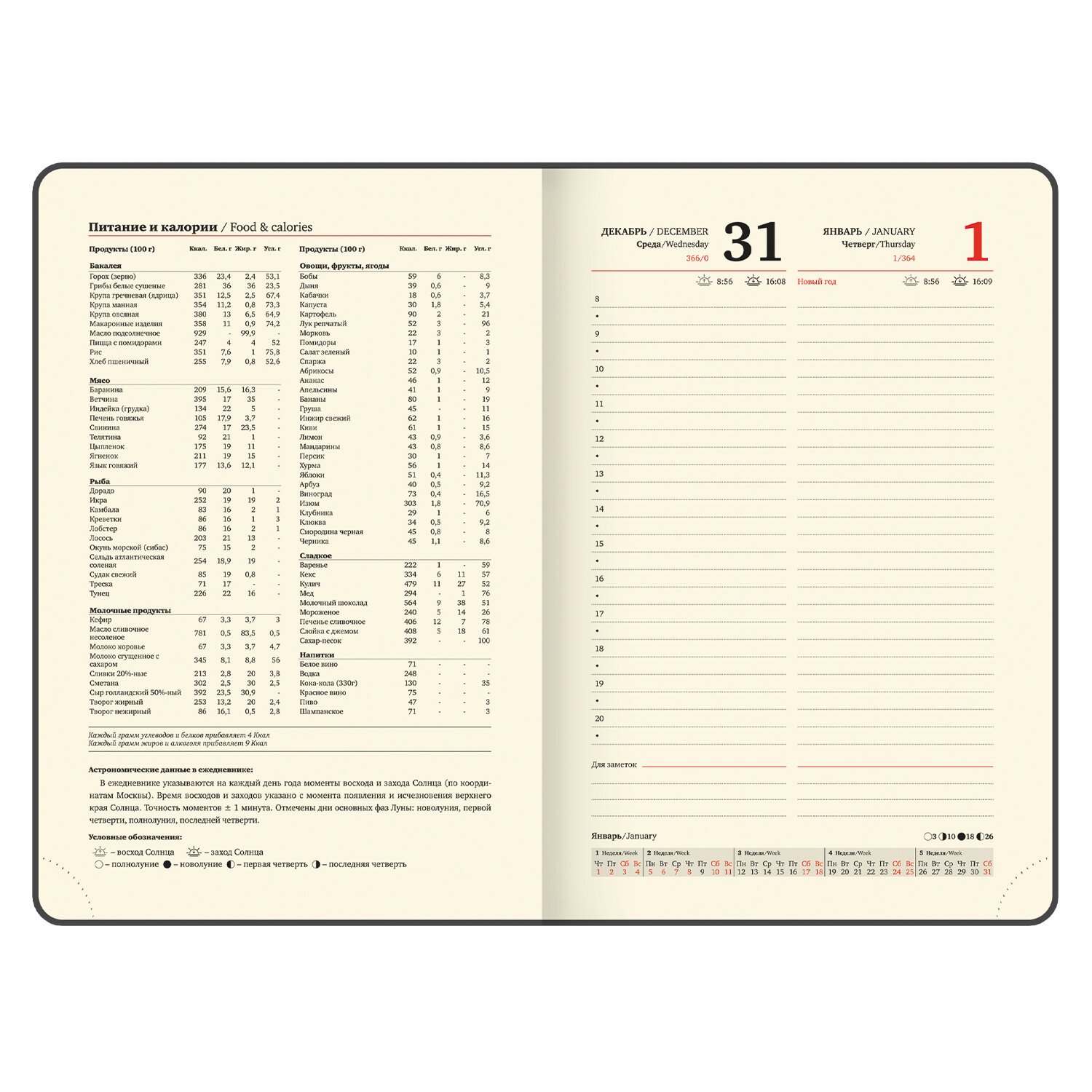 Внутренний блок включает 168 листов кремовой бумаги плотностью 70 г/м2. Каждая страничка имеет перфорированный угол. Благодаря стандартному формату А5 (138х213 мм) датированный ежедневник удобно использовать как в офисе, так и на выездных деловых встречах.