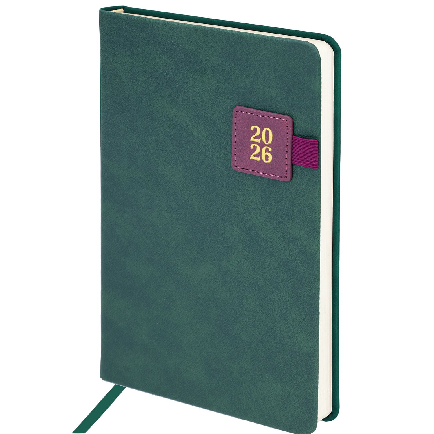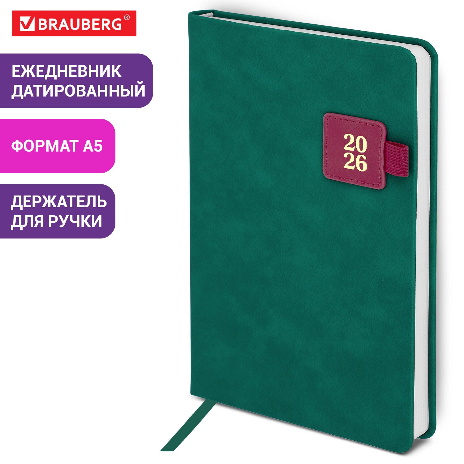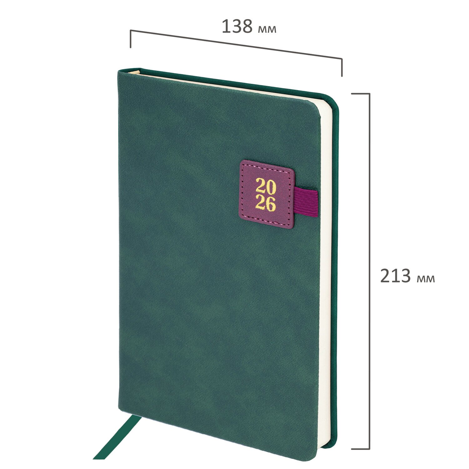 Ежедневник датированный 2026, А5, 138х213 мм, BRAUBERG "Plain", под кожу, резинка, держатель для ручки, темно-зеленый, 117507