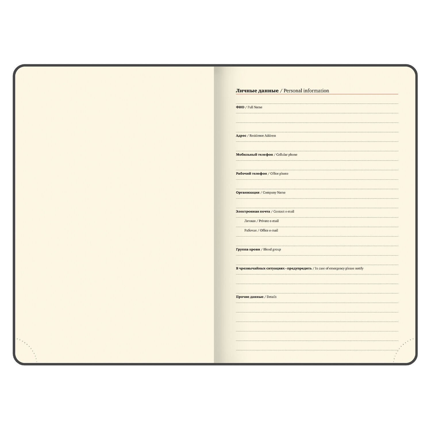 Внутренний блок включает 168 листов кремовой бумаги плотностью 70 г/м2. Каждая страничка имеет перфорированный угол. Благодаря стандартному формату А5 (138х213 мм) датированный ежедневник удобно использовать как в офисе, так и на выездных деловых встречах.