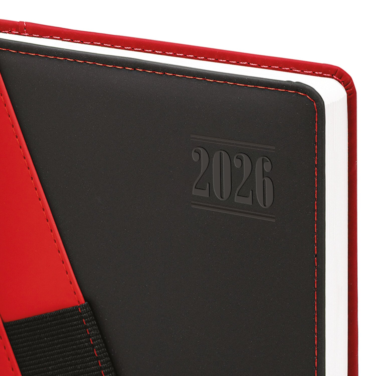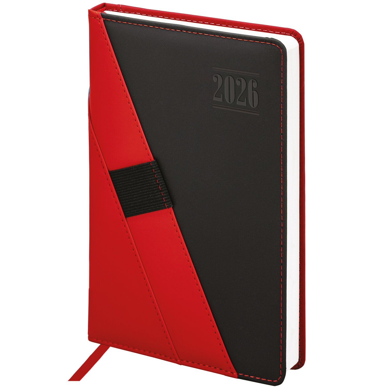 Выполнен в стильном сочетании красного и черного цветов. Обложка подходит для горячего тиснения. Дополнением является закладка-ляссе, с помощью которой при необходимости можно быстро открыть ежедневник на нужной странице и держателем для ручки. Ежедневник снабжен справочным материалом. В конце имеются 4 страницы для записей и заметок.