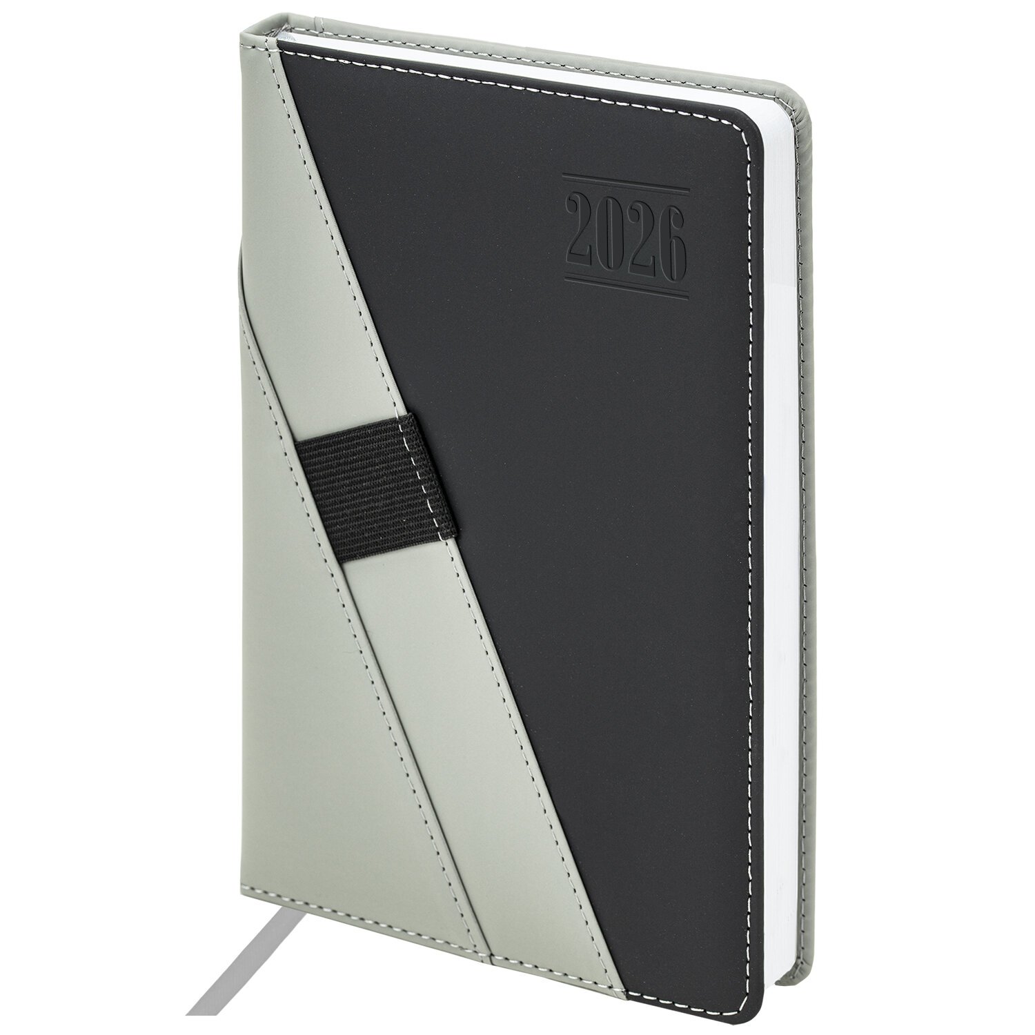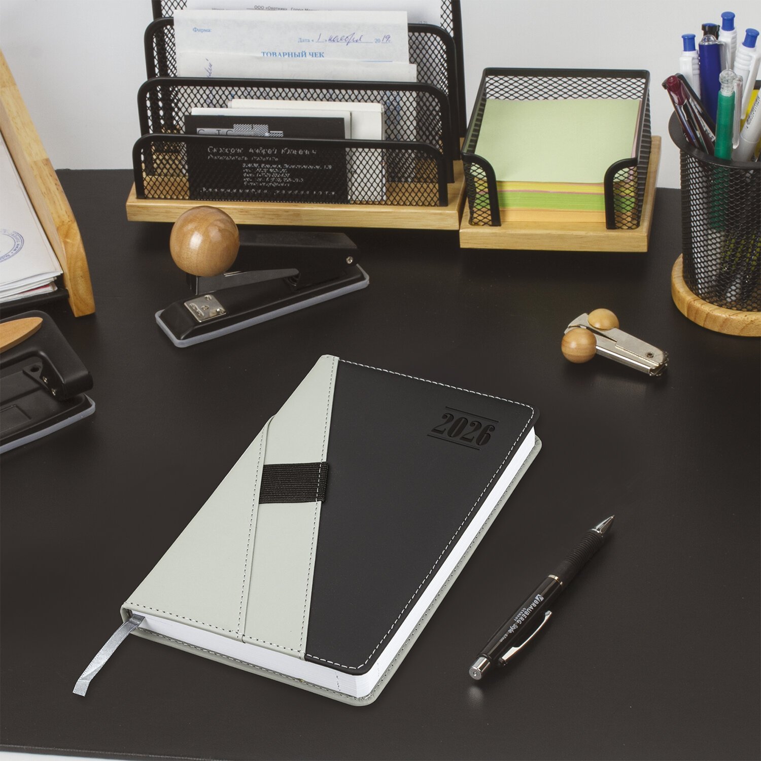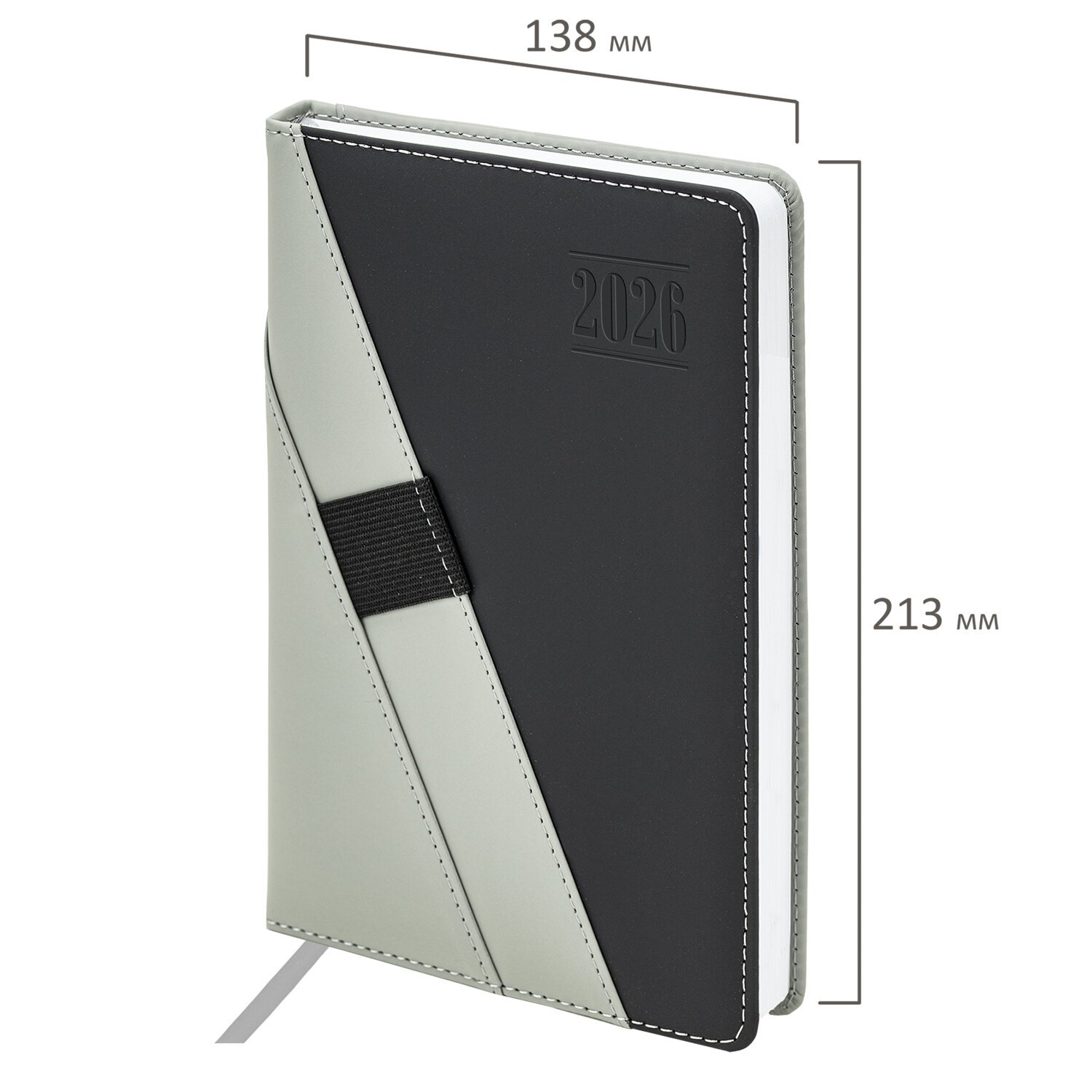 Ежедневник датированный 2026 А5 138х213мм BRAUBERG Swirl,под кожу, держатель для ручки, серый, 117482