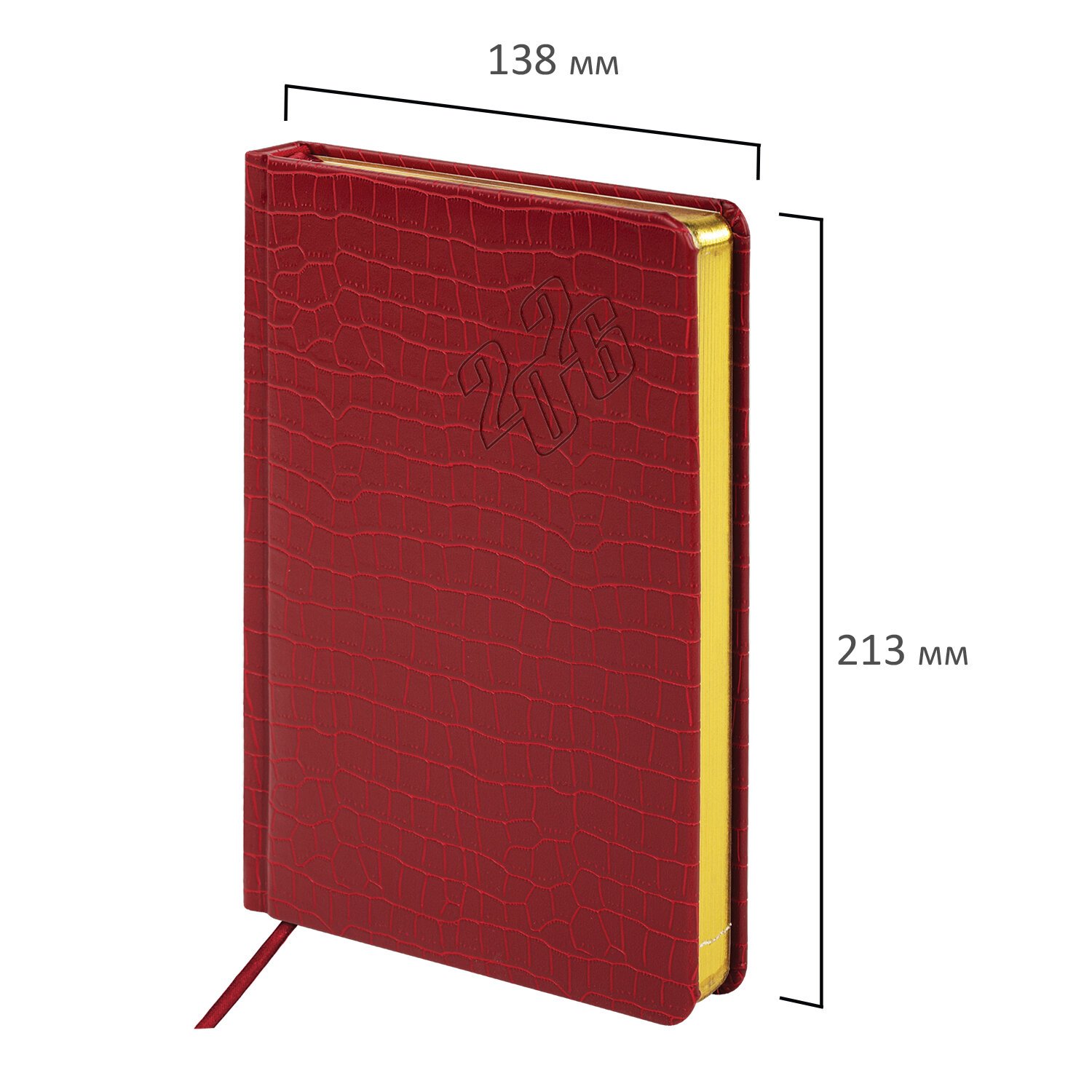 Внутренний блок включает 168 листов тонированной бумаги плотностью 70 г/м2. Каждая страничка имеет перфорированный угол. Благодаря стандартному формату А5 (138х213 мм) ежедневник удобно использовать как в офисе, так и на выездных деловых встречах. Материал обложки насыщенного красного цвета подходит для горячего тиснения. Срез ежедневника фольгирован золотой фольгой, что придает ему особый шарм.