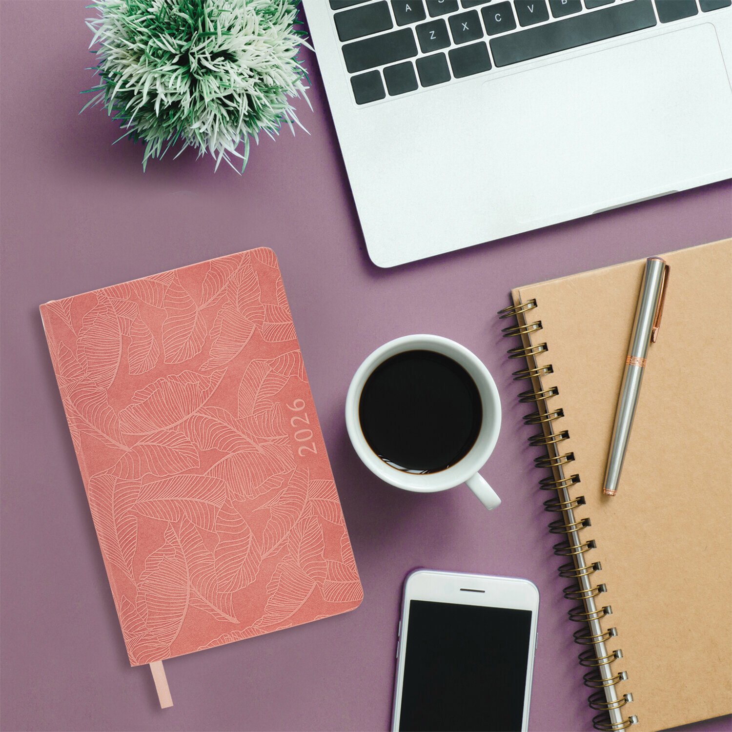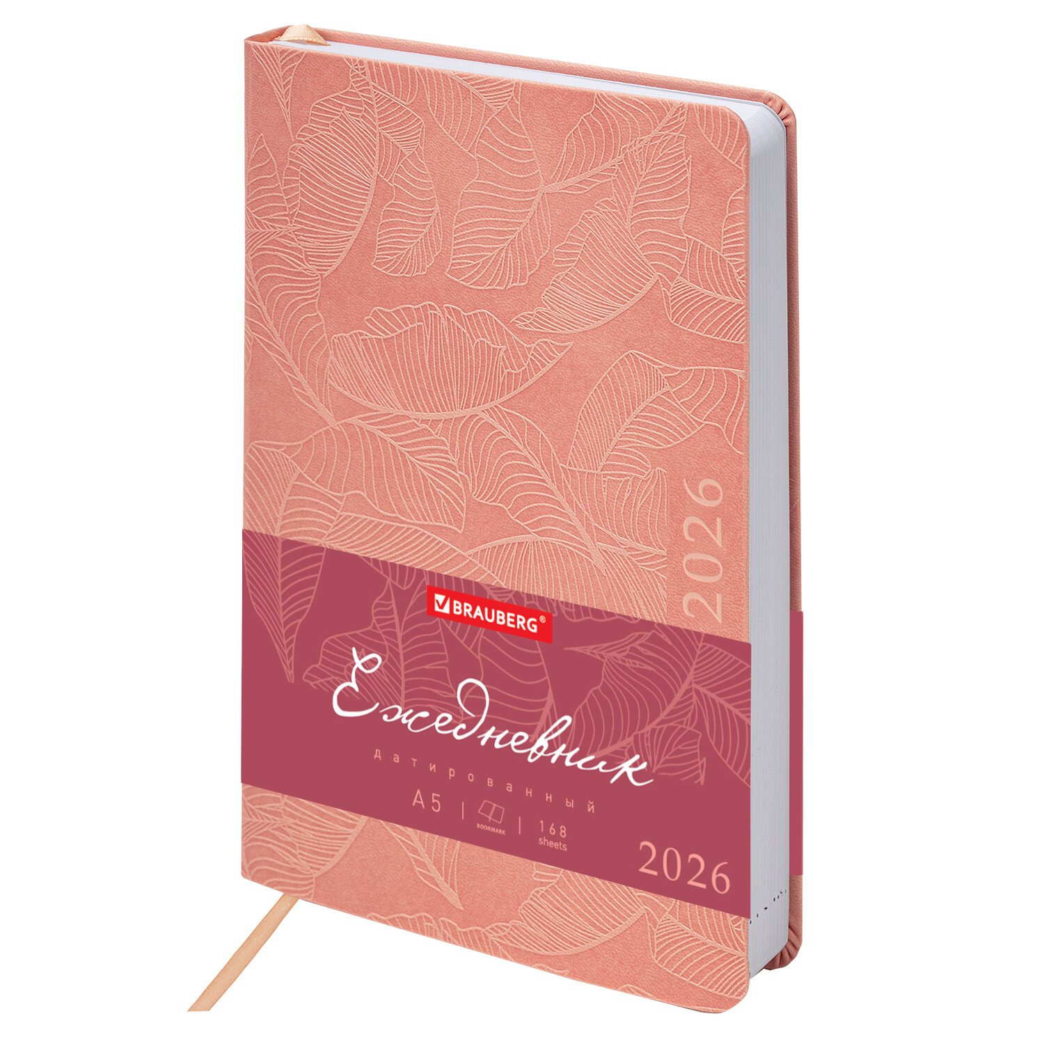 Ежедневник датированный 2026 А5 138x213мм BRAUBERG Foliage, под кожу гибкий, розовый, 117129