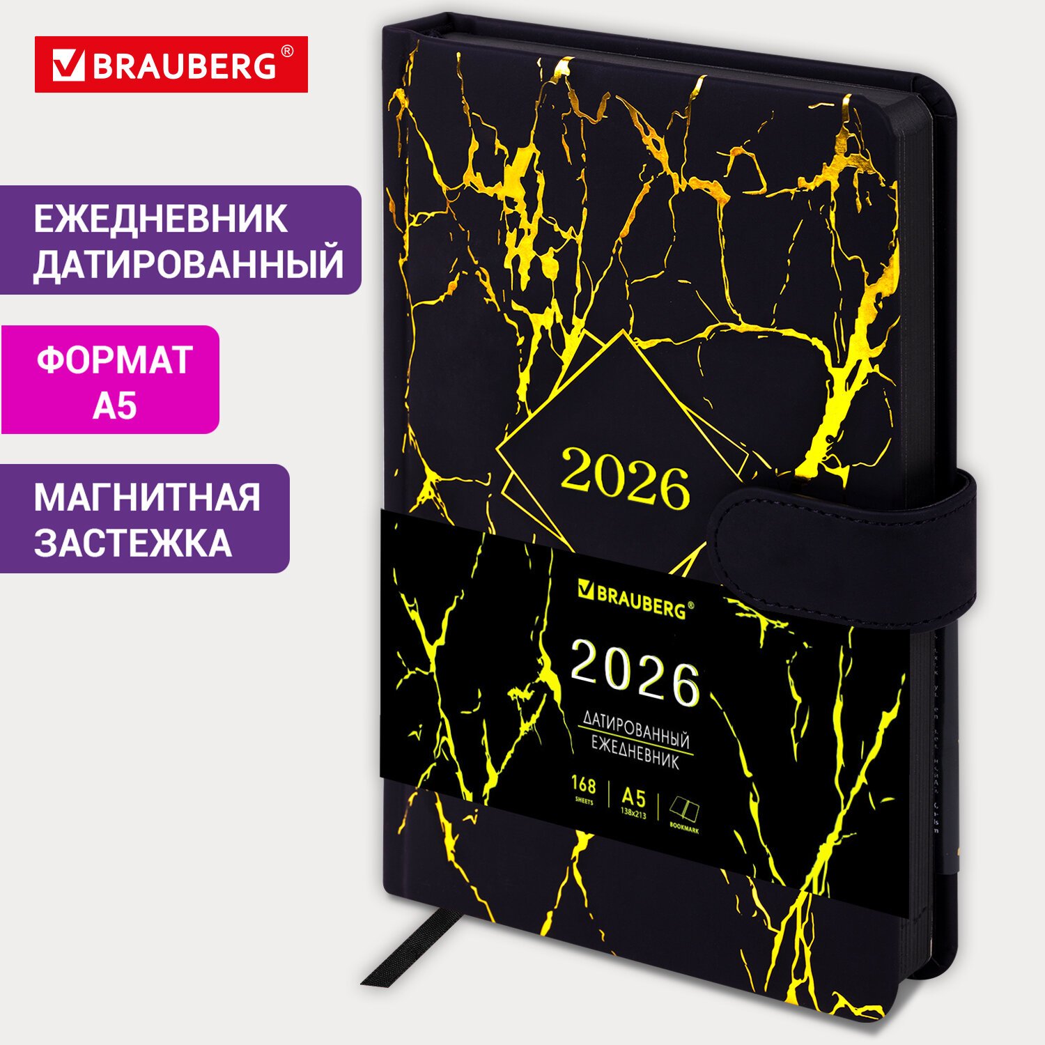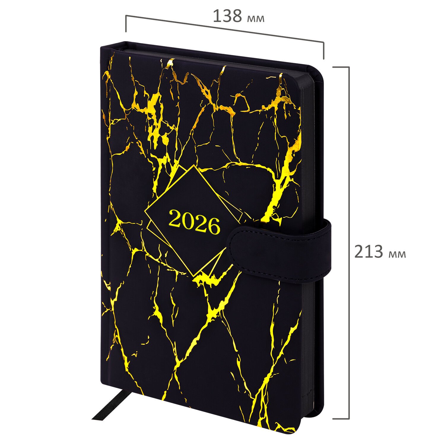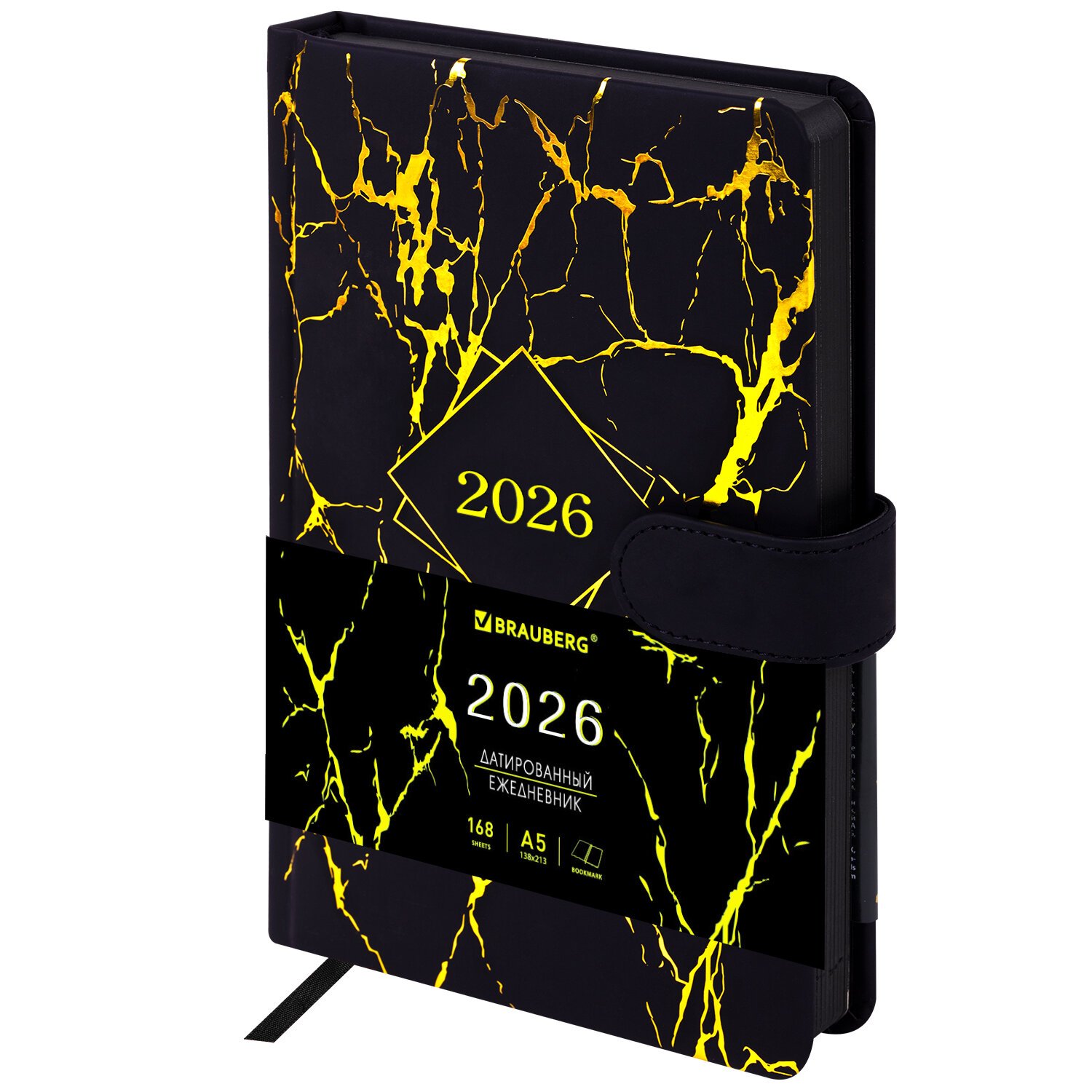 Ежедневник датированный 2026 А5 138x213мм BRAUBERG Goldy, под кожу, цветной срез, черный, 117470